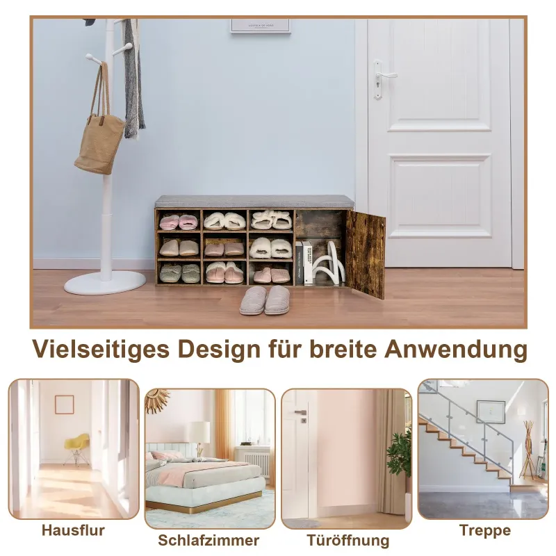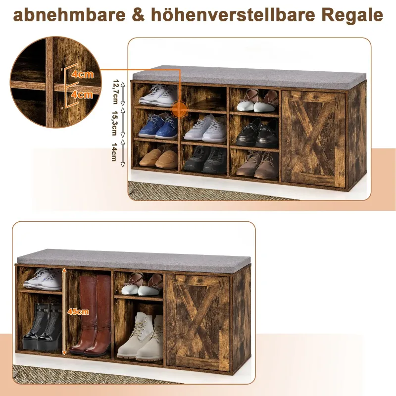Náš multifunkčný stojan na topánky bude dokonalým riešením na uskladnenie vašich topánok. Má 9 kociek na prehľadné usporiadanie topánok alebo ozdôb. Možno ho použiť na schodoch alebo na konci postele. Okrem toho 6 trojito nastaviteľných políc poskytuje prispôsobenú výšku pre rôzne druhy obuvi. Po vybratí všetkých políc je výška každej priehradky 42,5 cm, čo je vhodné na topánky. Ešte dôležitejšia je skrinka s dverami otvárateľnými na zatlačenie, do ktorej môžete ukryť svoje zbierky. Na zabezpečenie celkového pohodlia je lavica vybavená sedákom s penovým polstrovaním. A vankúš potiahnutý ľanovou tkaninou je dostatočne odolný a odolný proti roztrhnutiu na dlhodobé používanie. Po použití môžete vankúš vybrať pomocou suchých zipsov a ľahko ho vyčistiť. Atribúty: Flexibilné priehradky na topánky: naša lavica na topánky má 9 otvorených priehradiek, ktoré umožňujú dobre usporiadať 9 párov topánok. Okrem toho 6 odnímateľných a výškovo nastaviteľných políc poskytuje prispôsobený úložný priestor pre topánky rôznych veľkostí. Každú policu možno nastaviť do 3 polôh a vzdialenosť medzi jednotlivými úrovňami je 4 cm. Skrinka s dverami otváranými zatláčaním: Bočná skrinka je vhodným miestom na uloženie časopisov, záznamov, dekorácií, uterákov alebo iných predmetov dennej potreby. Vďaka pružnému otváraniu dvierok môžete bez námahy otvoriť dvierka a dostať sa k tomu, čo potrebujete. Odnímateľný polstrovaný vankúš: Vďaka odnímateľnému polstrovanému vankúšu sa môžete pohodlne posadiť a prezúvať sa. Jeho priedušná ľanová tkanina a mäkká špongia poskytujú relaxačný zážitok pri sedení. Vďaka suchým zipsom je možné vankúš ľahko vybrať na jednoduché čistenie. Odolný & stabilná konštrukcia: Vysokokvalitné drevené dosky a zosilnená konštrukcia operadla zaručujú dlhú životnosť a silnú nosnosť 136 kg. Široká základňa navyše udržiava stabilitu a zabraňuje kolísaniu. Praktický dizajn & široké využitie: Vďaka jednoduchým farbám a čistým líniám bude táto lavica na topánky dokonalým doplnkom vašej vstupnej haly, chodby, obývačky, spálne atď. Môže dobre slúžiť ako botník, úložný priestor na hračky alebo výstavná polica a dokonale splní rôzne každodenné potreby. Vlastnosti: Ideálna na kožené topánky, papuče, topánky na vysokom podpätku, čižmy atď. Obsahuje 1 úložnú skrinku s dvierkami a 9 kociek Priestranné sedadlo a polstrovaný vankúš na príjemné posedenie Vysokokvalitná ľanová tkanina a elastická špongia pre vynikajúcu odolnosť a vynikajúcu mäkkosť Odnímateľná & výškovo nastaviteľná polica na flexibilné ukladanie obuvi Nosnosť do 136 kg Ľahko čistiteľný povrch na údržbu bez námahy Univerzálny dizajn na široké spektrum použitia Môže sa používať ako botník, úložný priestor na hračky alebo výstavná polica