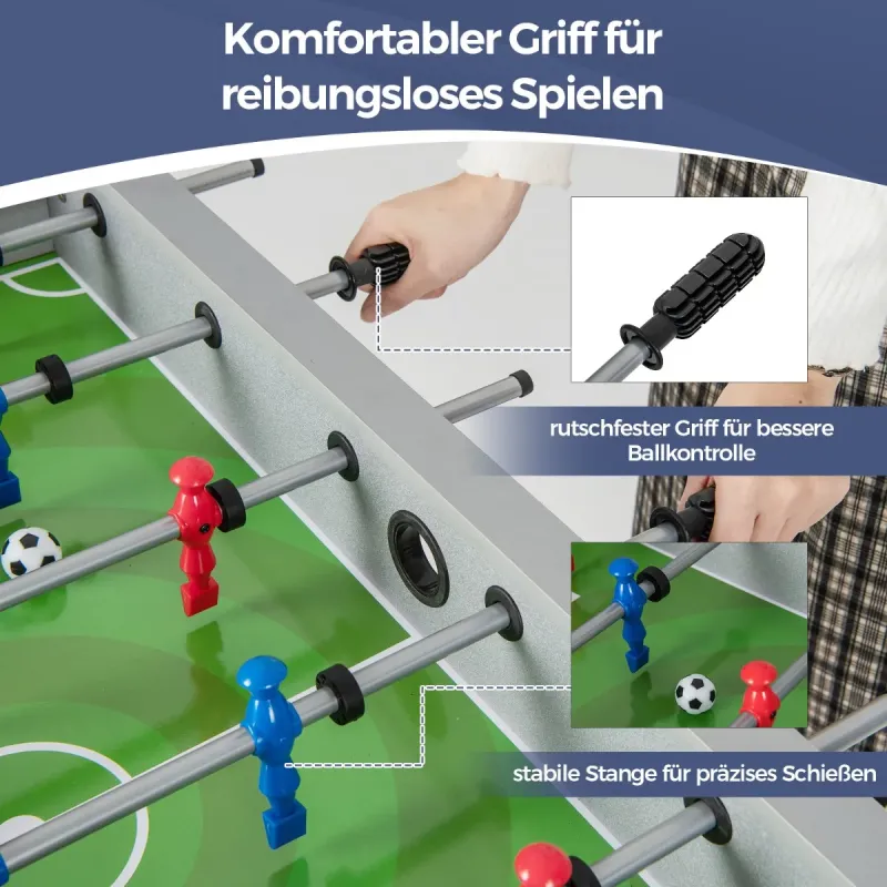 Zažite vzrušenie zo stolného futbalu s naším všestranným a vzrušujúcim stolným futbalom. Poskytuje zábavnú zábavu pre hráčov všetkých vekových kategórií a zároveň skracuje čas strávený pri obrazovke. Je všestrannou voľbou na rodinné stretnutia alebo priateľské súťaže, podporuje koordináciu rúk a očí a integračné zručnosti a zároveň posilňuje vzťahy. Tento stôl je vhodný do rôznych prostredí, ako sú herne, pivnice, večierky alebo kancelárie, a ponúka nekonečné možnosti zábavy a priateľstva. Náš herný stôl je tiež vybavený pohodlnými, protišmykovými rukoväťami a robustnými tyčami na lepšie ovládanie a presnú streľbu. Vysokokvalitná konštrukcia stola so štyrmi nohami a protišmykovými podložkami pod nohy zaručuje odolnosť a dlhodobý výkon. Atribúty: Vhodný pre všetky vekové kategórie: Náš praktický herný stôl je navrhnutý tak, aby skrátil čas strávený pri obrazovke, a je vhodný pre hráčov všetkých vekových kategórií. Je preto ideálny na rodinné stretnutia alebo priateľské súťaže. Premyslené príslušenstvo: Vďaka množstvu premysleného príslušenstva tento stolný futbal zlepšuje celkový zážitok z hry. Každý detail bol starostlivo premyslený - od pohodlnej protišmykovej rukoväte na plynulú hru a lepšiu kontrolu lopty až po robustnú tyč na presné kopanie. Realistickí hráči a ručné počítadlo gólov zvyšujú vzrušenie a zábavu z hry. Robustná konštrukcia & vysokokvalitný materiál: Stolný futbal je vyrobený z vysokokvalitných, odolných doskových materiálov a zaručuje dlhodobý výkon. Robustná konštrukcia so štyrmi nohami a protišmykovými podložkami pod nohy zaručuje stabilitu pri každodennom hraní. Na mnoho príležitostí: Tento všestranný stolný futbal je vhodný na rôzne príležitosti. Či už v herni, v pivnici, na večierku alebo v kancelárii - tento futbalový stôl ponúka nekonečnú zábavu a možnosť spoločenského vyžitia. Jednoduché zostavenie: Nastavenie stolného futbalu je hračka. Každá časť je v návode očíslovaná a potrebné príslušenstvo je súčasťou balenia. Stačí postupovať podľa návodu a zostaviť stolný futbal. Vlastnosti: Zábava pre hráčov všetkých vekových kategórií, podporuje koordináciu rúk a očí a posilňuje puto medzi rodičmi a deťmi. Vhodný do herní, pivníc, na večierky a do kancelárií - pre nekonečnú zábavu. Nárazníková tácka zabezpečuje plynulé a nepretržité hranie. Zvyšuje zážitok z hrania vďaka pohodlným rukovätiam, robustným tyčiam, realistickým hráčom a ručnému zapisovateľovi skóre. Vyrobené z vysokokvalitného doskového materiálu so 4 opornými nohami a protišmykovými podložkami pod nohy pre stabilitu. Rýchla a jednoduchá montáž vďaka očíslovaným dielom a priloženému príslušenstvu. Bránková skrinka uľahčuje hráčom chytanie lopty. Športové sfarbenie dodáva stolnému futbalu vizuálne príťažlivý a dynamický prvok.