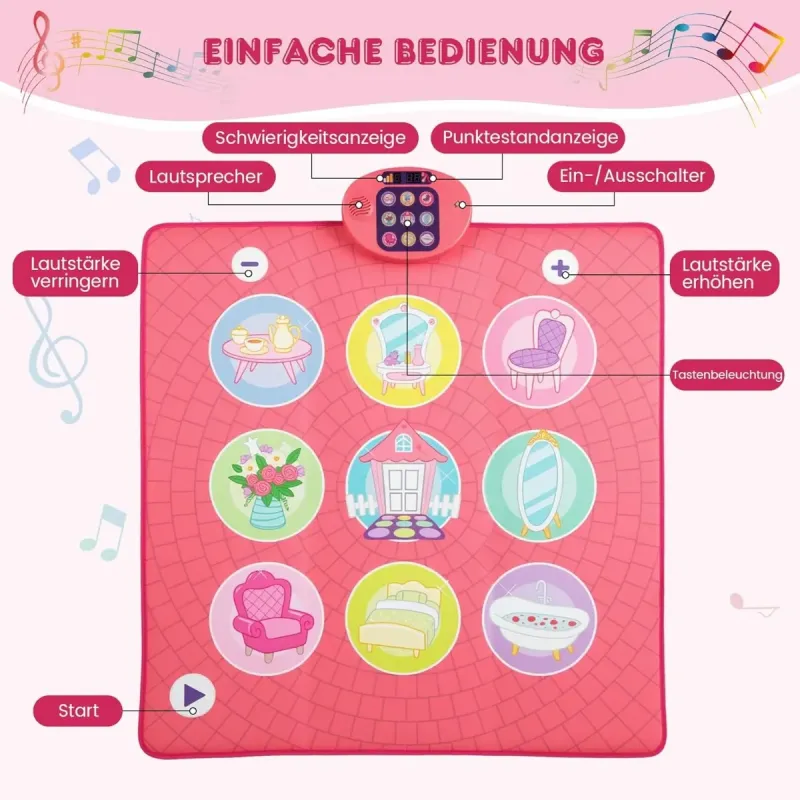 Tanečná podložka je určená pre deti od 3 rokov a ponúka 5 úrovní hry, ktoré precvičujú a zlepšujú koordináciu a rytmické zručnosti detí. Vďaka 9 očarujúcim zvukom klavíra a 9 demo skladbám si vaši ratolesti môžu vychutnať rozmanitú hudbu. Tanečná podložka sa ľahko ovláda pomocou tlačidla napájania, tlačidla štart a tlačidiel na zvýšenie a zníženie hlasitosti. Vaše dieťa si môže vybrať demo režim alebo režim prehrávania. Hladký povrch a protišmyková spodná časť poskytujú bezpečný a pohodlný priestor na tanec. Naša tanečná podložka je ideálnym darčekom, ktorý udrží deti aktívne a zaujaté. Vlastnosti: Tanečná hra s 5 úrovňami obtiažnosti: Tanečná podložka obsahuje tanečný herný režim s 5 úrovňami obtiažnosti. Každá hra má 7 šancí minúť svetielko. Ovládač zobrazuje úroveň obtiažnosti, skóre a svetlá klávesnice. Vyžaduje 3 batérie typu AA (nie sú súčasťou balenia). Bohaté zvuky a ovládanie hlasitosti: Tanečná hračka je tiež vybavená 9 zvukmi klavíra a 9 demo skladbami, ktoré si deti môžu užiť. Deti môžu prepínať medzi režimom klavíra a demo režimom pomocou tlačidla štart a upravovať hlasitosť podľa svojich potrieb. Bezpečné a pohodlné materiály: Protišmyková PE spodná časť znižuje nechcený pohyb a umožňuje bezpečné hranie. Hladký povrch a mäkká špongiová výplň zaisťujú príjemný a pohodlný dotyk na dotyk. Jednoduché skladovanie alebo prenášanie: Tanečná podložka sa po rýchlom zložení veľmi ľahko skladuje a nezaberá veľa miesta. Navyše, nízka hmotnosť 0,6 kg umožňuje jednoduché prenášanie, kamkoľvek chcete. Vaše dieťa si môže užiť tanečnú hru v interiéri aj exteriéri. Ideálny darček pre deti od 3 rokov: Kreslené vzory priťahujú deti od 3 rokov. Deti si pri tanci zlepšujú motorické zručnosti a koordináciu rúk a nôh. Je to krásny darček na narodeniny, sviatky alebo iné príležitosti. Vlastnosti: 9-tónové zvuky klavíra a 9 demo skladieb pre zábavnú hru 3 režimy a 5 úrovní výziev pre hodiny zábavy Vysokokvalitný reproduktor na prehrávanie krásnej hudby Farebný PE povrch s kreslenými vzormi oslovuje deti Výplň z EPE peny a nádherné šitie pre odolné používanie Vodivá vrstva dosahuje rôzne hudobné funkcie Protišmykové dno zabraňuje pošmyknutiu Skladací dizajn uľahčuje prenášanie a skladovanie