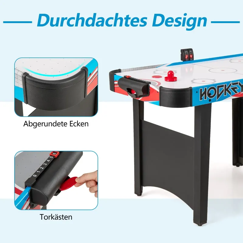Tento stôl na vzdušný hokej, vhodný pre dospelých aj deti, je skvelým doplnkom do každej domácnosti, kancelárie alebo herne. Herný stôl obsahuje dva puky a dve tlačidlá, takže môžete okamžite začať hrať. Je navrhnutý pre vzrušujúce súťaže a je vybavený LED výsledkovou tabuľou, ktorá sleduje priebeh hry a zabezpečuje, že každý bod sa počíta. Výkonný 12V ventilátor zaisťuje plynulé a konštantné prúdenie vzduchu, čím poskytuje stabilnú hraciu plochu. Okrem toho je tento vnútorný hokejový stôl do herne vybavený zaoblenými rohmi a nastaviteľnými nožičkami pre zvýšenú bezpečnosť a stabilitu. Vlastnosti: Zlepšený herný zážitok: Tento 122 cm stôl na vzdušný hokej sa dodáva s dvoma tlačidlami a dvoma pukmi, takže máte všetko, čo potrebujete pre nekonečnú zábavu. 12V ventilátor poskytuje silné prúdenie vzduchu, ktoré umožňuje pukom plynulé a rýchle kĺzanie. Digitálna LED výsledková tabuľa: Tento stôl na vzdušný hokej je vybavený funkciou merania gólov s infračerveným senzorom a LED elektronickým displejom, ktorý bez námahy sleduje skóre a dodáva vzrušenie každej hre. Má tiež manuálne posuvné skóre na oboch stranách. Pevná konštrukcia: Tento stôl na vzdušný hokej, vyrobený so zosilnenými nohami a vystuženými doskami, vydrží intenzívnu hru bez kývania. Nastaviteľné opierky nôh pomáhajú udržiavať rovný hrací povrch, a to aj na nerovnom povrchu. Premyslený dizajn: Tento hokejový stôl v arkádovom štýle má zaoblené rohy, ktoré zabraňujú nárazom alebo škrabancom počas energickej hry a zvyšujú bezpečnosť. Bránky tiež zaisťujú plynulý návrat pukov, čím poskytujú bezproblémový herný zážitok. Ideálny pre všetky vekové kategórie: Tento elegantný a všestranný stôl na vzdušný hokej je ideálnou voľbou do každej herne, na párty alebo do kancelárie. Je vhodný pre hráčov od 3 rokov a podporuje zábavu, koordináciu ruka-oko, interakciu rodič-dieťa a fyzické cvičenie. Vlastnosti: Výkonný 12V motor ventilátora zaisťuje plynulú a rýchlu hru. Infračervené senzory na bránkach presne sledujú a zaznamenávajú skóre. Zaoblené rohy znižujú riziko nárazu počas intenzívnych hier. Pevná konštrukcia zabraňuje kolísaniu počas intenzívnej hry. Nastaviteľné opierky nôh zlepšujú celkovú stabilitu na akomkoľvek povrchu. Použiteľný na rôzne príležitosti, ako je domácnosť, kancelária alebo herňa. Dodáva sa s 2 pukmi a 2 posuvníkmi. Vhodný pre dospelých aj deti.