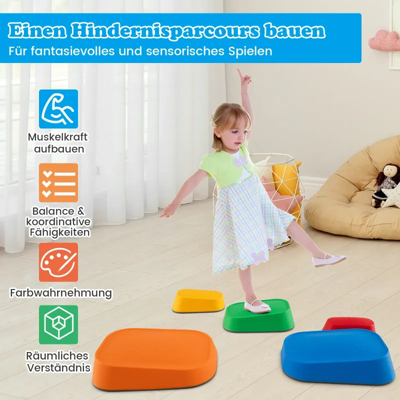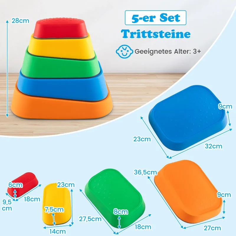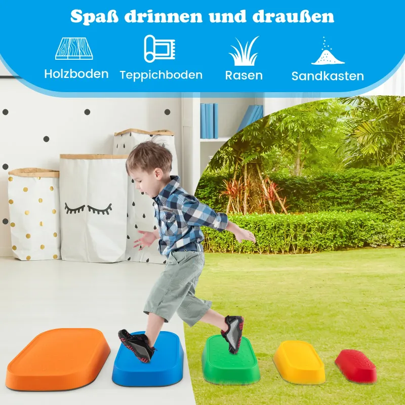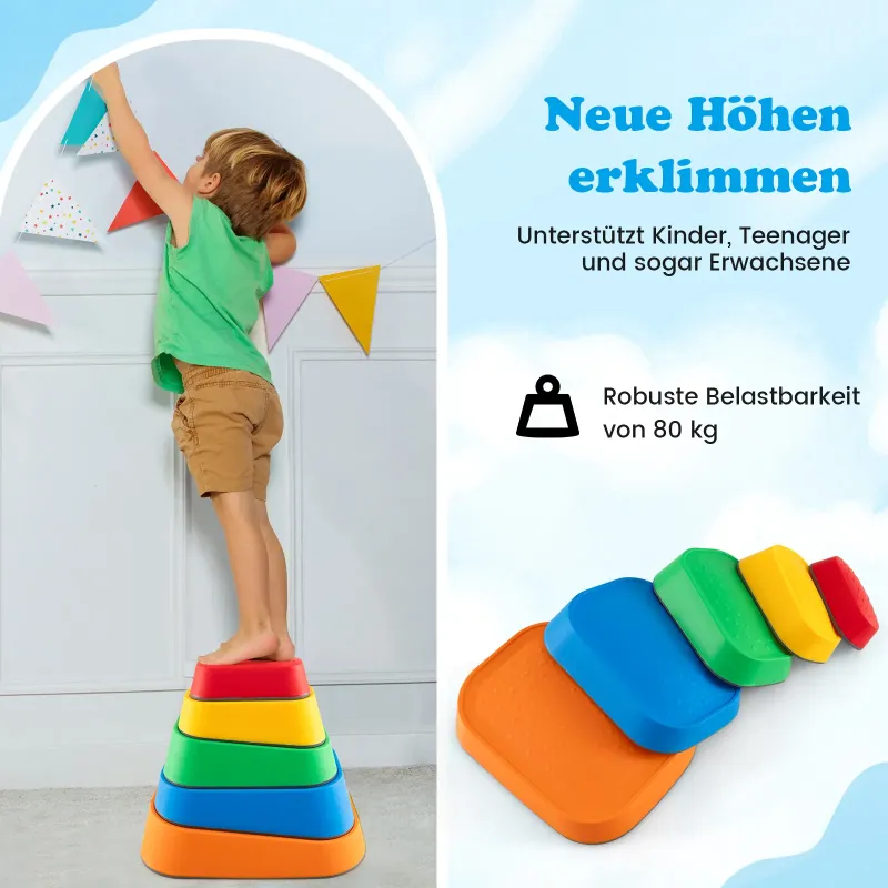 Pozrite si našu sadu stohovateľných nášľapných kameňov pre deti! Vďaka 5 rôznym farbám a veľkostiam sú tieto kamene ideálne na vytváranie vzrušujúcich prekážkových dráh, ktoré podporujú silu, rovnováhu a rozpoznávanie farieb. Sú vyrobené z bezpečných, pre deti priateľských PP materiálov, sú vhodné pre deti od 3 rokov a sú dostatočne pevné na to, aby sa k nim mohli pridať aj ostatní členovia rodiny. Vďaka TPE okrajom a protišmykovým vzorom je táto všestranná hracia sada ideálna na vnútorné aj vonkajšie použitie. Navyše sa neuveriteľne ľahko čistí a skladuje. Jednoducho kamene umyte, naukladajte a uložte pod nábytok alebo do zásuvky až do ďalšieho hravého dobrodružstva. Pozdvihnime zábavu a učenie do nových výšin s našou 5-dielnou sadou nášľapných kameňov! Vlastnosti: Nekonečné možnosti hry: Táto sada 5 vyvažovacích kameňov pre deti v rôznych farbách a veľkostiach inšpiruje k nekonečným možnostiam fantázie a zmyslového hrania. Môžete zapojiť svoje ratolesti do klasickej hry „Podlaha je láva“ alebo sadu naskladať rôznymi spôsobmi a vytvoriť tak dokonalú prekážkovú dráhu. Protišmykové prevedenia: Táto sada riečnych kameňov má plné TPE hrany pre bezpečné uchopenie na rôznych povrchoch, od vnútorných podláh a kobercov až po vonkajšie trávniky a pieskoviská. Jej očarujúce vzory sú pútavé a účinne znižujú riziko pošmyknutia. Komplexný rozvoj: Naša sada protišmykových stohovacích kociek tiež podporuje rast detí prostredníctvom aktívneho skákania, vyvažovania a strečingu. Rozvíja fyzickú silu, rovnováhu a koordináciu detí a zlepšuje priestorové a farebné rozpoznávanie prostredníctvom zábavných hier. Odolné materiály: Každá z týchto odolných stohovacích kociek je vyrobená z vysoko kvalitného PP, unesie až 80 kg a pohodlne podopiera deti, tínedžerov a dokonca aj dospelých. Pre väčšie pohodlie je možné tieto nášľapné kamene umývať pod tečúcou vodou. Jednoduché skladovanie a perfektný darček: Naša sada nášľapných kameňov je ideálnym darčekom pre predškolákov od 3 rokov, ideálnym na narodeniny, Vianoce alebo len tak pre nič za nič. Vlastnosti: Vyrobené z PP materiálu, ktorý je bezpečný pre deti a podporuje ich zdravý rast. Rôzne farby a veľkosti na podporu farebného vnímania a priestorového povedomia detí. Buduje svalovú silu a podporuje rovnováhu a koordináciu. Vhodné pre deti, tínedžerov a dokonca aj dospelých s nosnosťou 80 kg. Okraje z TPE a roztomilá protišmyková grafika zaisťujú bezpečnosť počas hry. Stohovateľný dizajn pre jednoduché skladovanie. Vodeodolný povrch sa ľahko čistí a osviežuje.