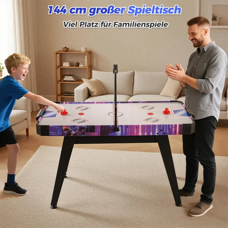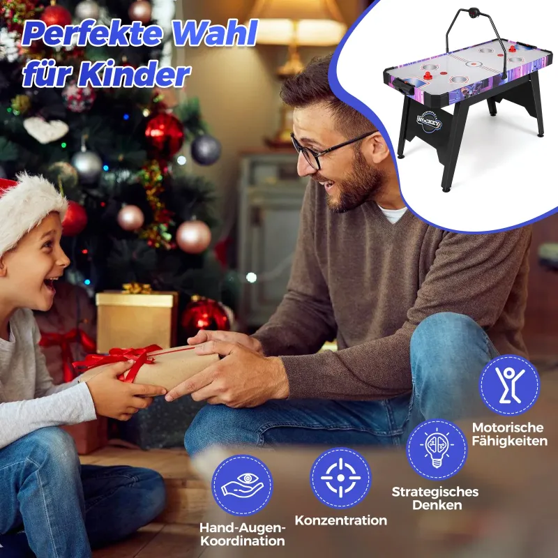 Zažite vzrušenie z arkádového vzdušného hokeja priamo u vás doma! Vzdušný hokejový stôl je vybavený výkonným motorom a husto zaplnenými vzduchovými otvormi pre hladké a rýchle kĺzanie puku. Každý zásah môžete sledovať na zabudovanom digitálnom displeji LED. Je to ideálny darček pre deti, ktorý podporuje koordináciu rúk a očí a strategické myslenie. Tento arkádový herný stôl obsahuje manuálne skóre, dávkovač pukov, 2 hokejky a 2 puky na okamžitú zábavu. Atribúty: 1: Výkonný motor: Tento stôl na vzdušný hokej je vybavený výkonným motorom s kapacitou 12 V a 500 mA a husto zaplnenými vzduchovými otvormi, ktoré zabezpečujú výnimočne hladký a rýchly sklz puku. Tento stôl s rozmermi 144 cm x 68 cm x 81 cm má ideálne rozmery na dynamické a vzrušujúce hranie a ponúka autentický arkádový zážitok v domácom prostredí. Digitálny bodovací systém: Vstavaný digitálny LED displej air hokejového stola pomáha hráčom sledovať každý zásah. Táto užívateľsky prívetivá funkcia zvyšuje zážitok z hry tým, že automaticky aktualizuje skóre, takže sa môžete sústrediť na hru. Robustný & Stabilná konštrukcia: Tento arkádový herný stôl, skonštruovaný so zosilnenými priečnymi výstuhami, poskytuje spoľahlivú stabilitu počas intenzívnych hier. Zaoblené rohy a nastaviteľné podložky pod nohy poskytujú dodatočnú bezpečnosť a prispôsobivosť, čím zabezpečujú bezpečnú oporu na rôznych typoch podláh. Perfektný darček pre deti: Tento stôl na vzdušný hokej poskytuje nielen nekonečnú zábavu, ale aj výrazne zlepšuje koordináciu rúk a očí a motorické zručnosti. Hra stimuluje strategické myslenie a koncentráciu, vďaka čomu je cenným doplnkom voľnočasových aktivít dieťaťa. Jednoduchá montáž: Hrací stôl sa dodáva už zmontovaný a ľahko sa zostavuje. Je vybavený ručnými tabuľami s výsledkami, zásobníkmi na puky a dodáva sa s 2 hokejkami a 2 puky, takže má všetko potrebné na to, aby sa hra mohla hneď začať. Vlastnosti: Navrhnuté s hustými vzduchovými otvormi pre väčšie prúdenie vzduchu Dodáva sa s výkonným motorom, ktorý zabezpečuje stabilné a silné prúdenie vzduchu Obsahuje LED displej na sledovanie skóre v reálnom čase Postavené s pevnou a stabilnou konštrukciou Vybavené manuálnymi tabuľami a zásobníkmi na puky Nastaviteľné podložky pod nohy poskytujú dodatočnú stabilitu na nerovnom povrchu Obsahuje 2 hokejky a 2 puky Vyžaduje sa montáž