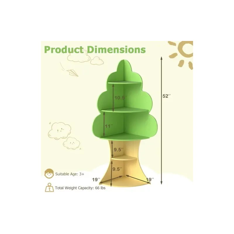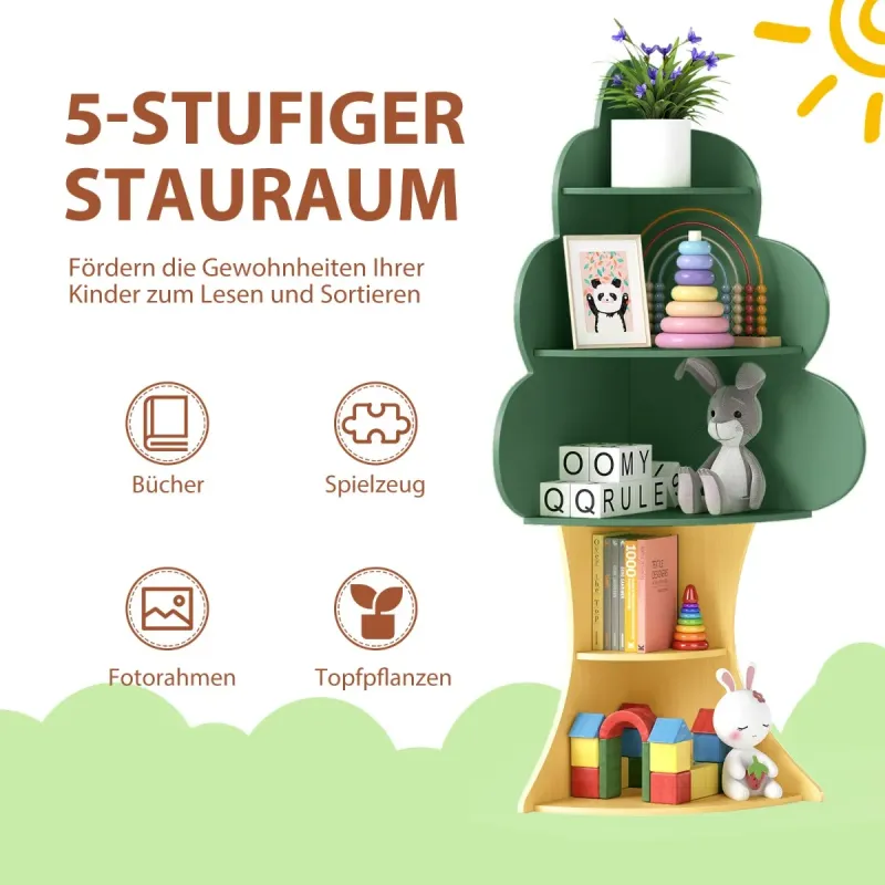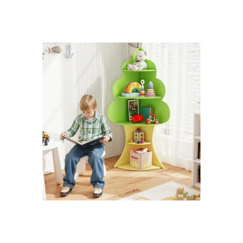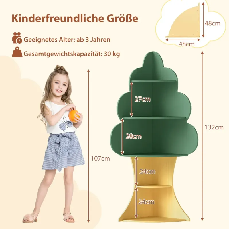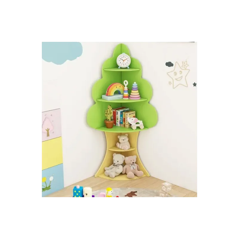 Udržujte knihy vášho dieťaťa úhľadne usporiadané s našou knižnicou v tvare stromčeka! 5-úrovňová polica na knihy ponúka dostatok úložného priestoru na knihy, hračky, ozdoby a ďalšie veci. Očarujúci tvar stromčeka a krásna farba z nej robia atraktívny doplnok do detských izieb, škôlok atď. Navyše vďaka rohovému dizajnu nezaberá príliš veľa miesta na podlahe. Pevná základňa a systém proti prevráteniu zabezpečujú, že organizér na hračky stojí stabilne a bezpečne. Hrubé panely zaisťujú dlhodobé používanie. Vlastnosti: 5-úrovňové úložné priestory: Detská knižnica v tvare stromčeka je navrhnutá s 5 úrovňami na uloženie rôznych predmetov vrátane kníh, hračiek, rámov na obrazy, izbových rastlín a dekorácií. Nielenže udržiava miestnosť upratanú, ale tiež vytvára čitateľský kútik pre deti od 3 rokov. Tvar stromčeka a otvorený dizajn: Jedinečný tvar stromčeka a jasné farby môžu vaše dieťa povzbudiť k čítaniu. Okrem toho otvorený dizajn deťom uľahčuje umiestňovanie alebo vyberanie kníh. Bezpečná a odolná knižnica: Hladké zaoblené rohy zabraňujú náhodným nárazom a chránia bezpečnosť detí. Polička na knihy v tvare stromčeka je vyrobená z vysoko kvalitných MDF dosiek a vydrží roky. Spoľahlivá a robustná konštrukcia: Pevná základňa pomáha poličke pevne stáť na podlahe. A čo je dôležitejšie, dizajn s ochranou proti prevráteniu pevne upevňuje detskú knižnicu k stene, aby sa zabránilo prevráteniu. Priestorovo úsporný rohový dizajn: Vďaka rohovému dizajnu sa 5-úrovňová knižnica perfektne hodí do rohu miestnosti a zaberá menej miesta. Meria 48 x 48 x 132 cm (D x Š x V) a je vhodná do detských izieb, herní, tried a ďalších priestorov. Vlastnosti: 5-úrovňový dizajn na uloženie rôznych malých predmetov. Dobrá voľba na podporu čitateľských a upratovacích návykov detí. Rohový dizajn šetrí obmedzený priestor. Zariadenie proti prevráteniu pre zvýšenú bezpečnosť a stabilitu. Zaoblené rohy pre bezpečný dotyk. Pevná základňa uľahčuje prevrátenie knižnice. Ľahko čistiteľný povrch pre bezproblémovú údržbu. Ideálne do detských izieb, herní, tried, škôlok a ďalších priestorov.