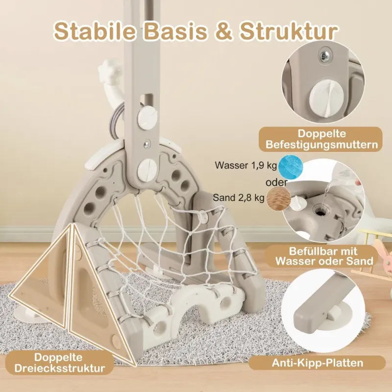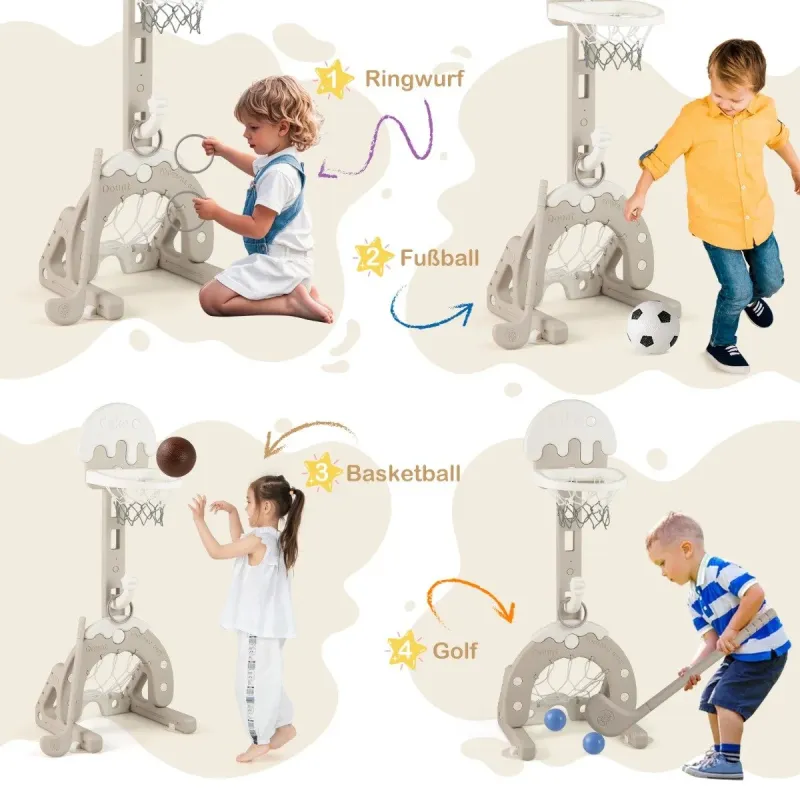 Vydajte sa za dobrodružstvom s naším športovým centrom 4 v 1 pre batoľatá! Táto živá súprava je určená pre začínajúce športové hviezdy vo veku od 3 do 10 rokov a ponúka 4 obľúbené hry: Basketbal, futbal, golf a hádzanie krúžkov. Keď vaše batoľa dosiahne nové výšky, kôš so 4 výškovými úrovňami rastie spolu s ním. Pre väčšiu stabilitu možno základňu naplniť vodou alebo pieskom a je vybavená doskami proti prevráteniu. Náš basketbalový kôš pre batoľatá je viac ako len hračka. Podporuje koordináciu, sebadôveru a sociálne zručnosti a vďaka nemu je každá hra úspešným krokom vo vývoji dieťaťa! Vlastnosti: 4 hry v jednom zariadení: Naša športová hracia súprava pre deti ponúka 4 spôsoby hry vrátane basketbalu, futbalu, golfu a hádzania krúžkov. Kompletná so všetkým potrebným vybavením, ako sú golfové palice, zodpovedajúce loptičky a 3 krúžky, predstavuje rušné centrum aktivít, ktoré malých športových nadšencov zabaví na celé hodiny. Nastaviteľná výška: Hra s krúžkami a obruč koša nášho centra aktivít pre deti majú 4 nastaviteľné úrovne výšky od 50 do 100 cm, čo vašim rastúcim batoľatám poskytne roky zábavy. Výšku možno ľahko nastaviť aj pomocou jednoduchých gombíkov. Nie je potrebné žiadne náradie. Robustná základňa a konštrukcia: Robustná základňa basketbalového koša pre batoľatá má dvojitú trojuholníkovú konštrukciu a je vystužená v hornej časti dvojitými upevňovacími maticami a v spodnej časti doskami proti prevráteniu. Možno ju dokonca naplniť 1,9 kg vody alebo 2,8 kg piesku, aby stojan bezpečne držal na mieste. Podporuje rast vášho dieťaťa: Náš basketbalový kôš 4 v 1, ktorý je prispôsobený pre aktívnych chlapcov a dievčatá vo veku od 3 do 10 rokov, podporuje vývoj vášho dieťaťa prostredníctvom hry. Poskytuje zdravé cvičenie, zvyšuje sebadôveru a pomáha deťom zlepšovať ich fyzické a sociálne zručnosti prostredníctvom priateľského súťaženia. Široké možnosti využitia: Naša športová hračka pre batoľatá je vyrobená z kvalitného PP materiálu a je pripravená na akékoľvek dobrodružstvo, či už na záhrade alebo v herni. Je ľahká a ľahko sa skladá, takže ju môžete v okamihu postaviť všade tam, kde sa vaše dieťatko rado hrá. Vlastnosti: Vhodné pre deti od 3 rokov: Konštrukcia 4 v 1 kombinuje hry basketbal, futbal, golf a hádzanie krúžkov 4 nastaviteľné výškové úrovne pre deti rôzneho veku Jednoduché nastavenie výšky bez použitia náradia Posilňuje koordináciu ruka-oko, motorické zručnosti a sebadôveru detí Robustná trojuholníková základňa s konštrukciou proti prevráteniu pre väčšiu stabilitu Možno ju naplniť vodou alebo pieskom, Vyrobené z materiálu PP bezpečného pre deti pre zdravý rast detí Ideálne pre vnútorné herne alebo vonkajšie hracie plochy, ako sú dvory alebo športoviská Pripravené na hru s futbalovou loptou, basketbalovou loptou, golfovou súpravou a 3 krúžkami Jednoduchá montáž vďaka prehľadnej štruktúre a návodu