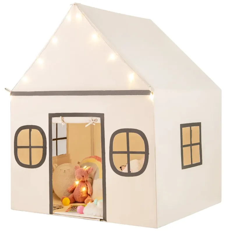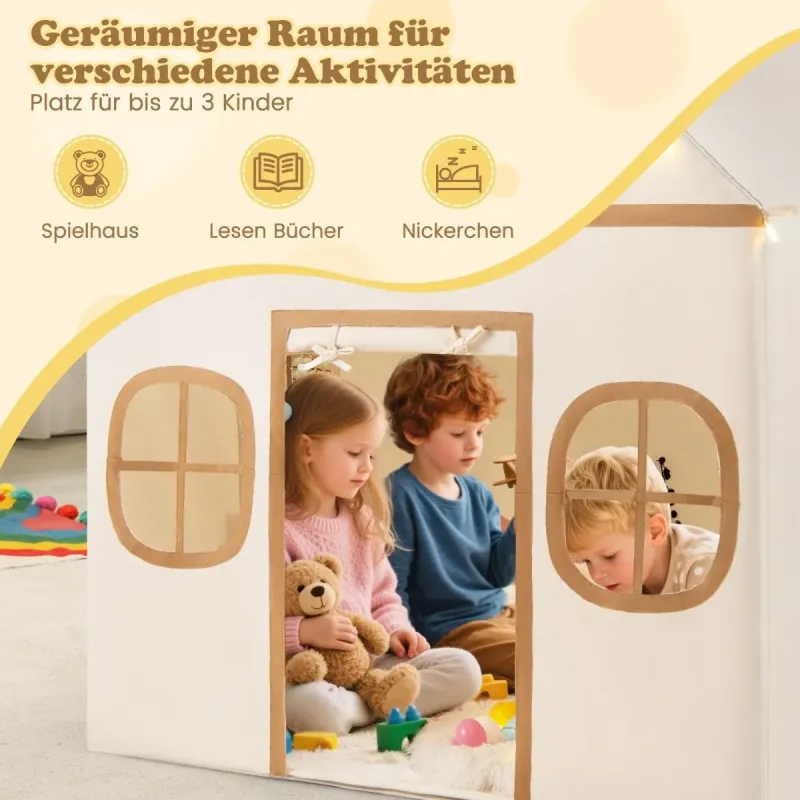 Náš detský stan na hranie ponúka deťom bezpečný a útulný priestor na hranie! Stan má rozmery 120 x 101 x 143 cm (dĺžka x šírka x výška) a ponúka dostatok priestoru na hranie pre 3 deti. Vybrané PVC rúrky a polyesterovo-bavlnené tkaniny zabezpečujú odolnosť stanu. Mäkká podložka s koralovým plyšom zaisťuje maximálne pohodlie. Okrem toho 4 okná a rolovacie dvere zabezpečia, že vaše deti budú mať dobre vetraný priestor. Vďaka svetlu rozkošnej lampy s hviezdičkami vytvára náš stan očarujúcu atmosféru a podnecuje deti k tomu, aby popustili uzdu svojej fantázii. Hračky, knihy a ďalšie doplnky na hranie sa navyše dajú prehľadne uložiť do bočného úložného vrecka stanu. atribúty: Priestranný priestor pre deti: Detský domček na hranie má rozmery 120 x 101 x 143 cm (D x Š x V) a ponúka priestor až pre 3 deti naraz. Bude príjemným miestom na hranie, čítanie kníh alebo zdriemnutie a spĺňa rôzne potreby detí. mäkká koralová plyšová podložka: Koralová plyšová podložka je vyplnená mäkkou penou, príjemnou na pokožku. Okrem toho protišmyková základňa zabraňuje pošmyknutiu a zvyšuje bezpečnosť. Keď sa podložka nepoužíva, dá sa zložiť do kompaktných rozmerov, čím sa šetrí miesto. odolné materiály: Stan pre deti je vyrobený zo zosilnených PVC rúrok, zostáva stabilný a nie je ľahké ho zrútiť. Je tiež potiahnutý polyesterovou bavlnenou tkaninou odolnou proti opotrebovaniu na dlhodobé používanie. premyslené funkcie: Na vetranie domčeka na hranie slúžia 4 okná. 2 bočné vrecká umožňujú deťom uložiť si svoje veci, ako sú knihy, občerstvenie, hračky a iné. Stan je navyše vybavený jasnými hviezdičkami, ktoré vytvárajú snovú a čarovnú atmosféru. Poznámka: Svetlá vyžadujú 2 batérie AA, ktoré nie sú súčasťou balenia. ideálny darček & ľahko sa čistí: Stan na hranie je špeciálne navrhnutý pre chlapcov a dievčatá od 3 do 10 rokov. Bude ideálnou voľbou darčeka na narodeniny, Vianoce alebo iné oslavy. Navyše vďaka umývateľnej podložke a tkanine z polyesteru a bavlny, ktorú možno prať v práčke, je čistenie hračka.Vlastnosti:Slúži ako domček na hranie, čitateľský kútik alebo miesto na spanieDostatočne veľká na to, aby sa 3 deti mohli hrať spoluZosilnené PVC rúrky pre vynikajúcu stabilituDýchateľné okná a závesy pre dobré vetranieSvetlá priťahujú detiNeskĺzavá základňa zabraňuje pošmyknutiuPre ľahké čistenie je možné prať v práčkePevná podložka je vhodná do detských izieb, herní, jaslí a ďalších priestorovIdeálny darček pre chlapcov a dievčatá vo veku od 3 do 10 rokovVyžaduje si montážPoznámka: Hviezdičky vyžadujú 2 x AA batérie, ktoré však nie sú súčasťou balenia