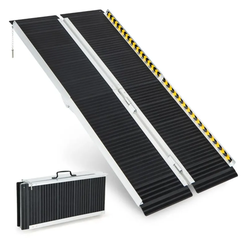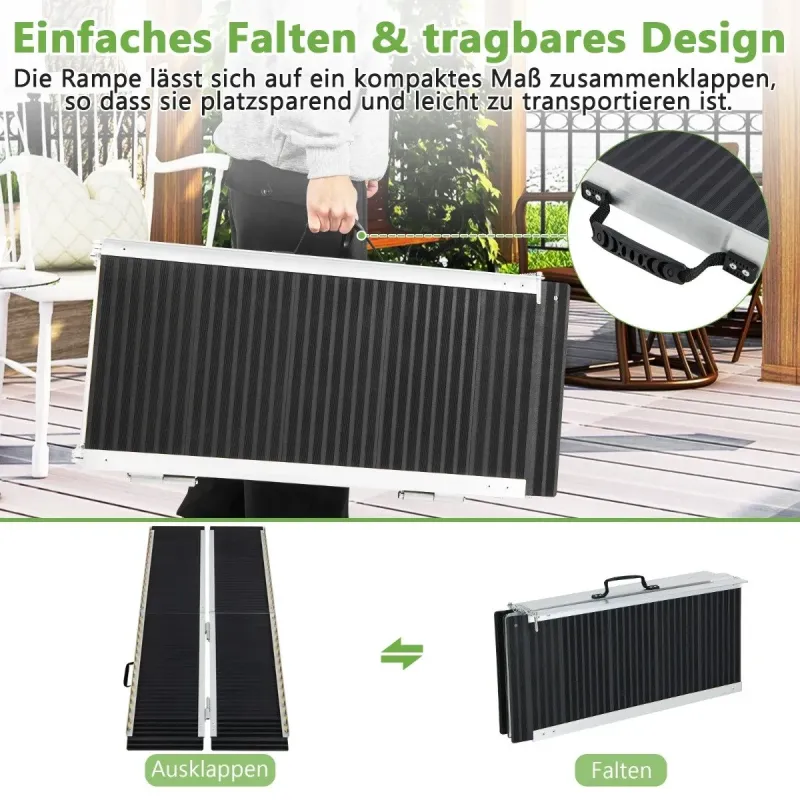 Zúfalo hľadáte rampu pre invalidné vozíky, ktorá zaručí bezpečnosť a pohodlie? Potom máte šťastie! Prechodová doska a protišmykový povrch našej rampy spoločne zlepšujú prispôsobenie sa podlahe, poskytujú maximálnu stabilitu a minimalizujú riziko pošmyknutia a pádu. Okrem toho má naša rampa jednoduchú skladaciu konštrukciu, takže ju môžete zložiť do kompaktných rozmerov na úsporu miesta pri skladovaní a prenášanie bez námahy. Vďaka robustnému hliníkovému rámu je táto rampa skonštruovaná tak, aby vydržala. Tento výrobok je vyrobený z pevného a nehrdzavejúceho hliníkového materiálu a spája v sebe ľahkú prenosnosť s robustnou stabilitou a oporou. Naša rampa je vhodná aj na širokú škálu aplikácií. Poskytuje bezpečný a stabilný prístup pre rôzne potreby, od ručných invalidných vozíkov až po elektrické vozíky, kočíky, vozíky a ďalšie. Bezpečnosť je našou najvyššou prioritou, preto je naša rampa premyslene navrhnutá a na oboch stranách vybavená reflexnými výstražnými nálepkami. Tým je zabezpečená maximálna viditeľnosť a minimalizuje sa riziko pádu. V neposlednom rade sú rampa vďaka bezpečnostným čapom a robustným závesom ešte odolnejšia. Vlastnosti: Prechodová doska a protišmykový povrch: Prechodové dosky na spodnej strane tejto rampy zlepšujú prispôsobenie sa podlahe a minimalizujú riziko pošmyknutia alebo pádu. Protišmykový povrch poskytuje dodatočnú trakciu a robí rampu bezpečnou a stabilnou pre plynulé a bezproblémové prechody. Jednoduché skladanie a prenosná konštrukcia: Vďaka funkcii jednoduchého skladania možno rampu zložiť do kompaktnej veľkosti, čím sa ušetrí miesto a uľahčí sa jej preprava. Vezmite si ju so sebou, kamkoľvek pôjdete, a zabezpečte si, že bude k dispozícii všade, kde ju budete potrebovať. Robustný hliníkový rám: Táto rampa je vyrobená z robustného a nehrdzavejúceho hliníkového materiálu a je konštruovaná tak, aby vydržala. Vďaka ľahkému materiálu je preprava hračkou, zatiaľ čo robustný rám poskytuje stabilitu a oporu. Široké použitie: Naša prenosná rampa pre invalidné vozíky má nosnosť 272 kg. Táto rampa poskytuje bezpečný a stabilný prístup pre rôzne vozidlá alebo asistenčné zariadenia, od ručných invalidných vozíkov až po elektrické invalidné vozíky, kočíky, vozíky a ďalšie. Väčšia bezpečnosť: Táto prenosná prahová rampa je premyslene navrhnutá s reflexnými výstražnými nálepkami na oboch stranách, ktoré poskytujú maximálnu viditeľnosť a minimalizujú riziko pádu. V neposlednom rade bezpečnostný kolík a robustné závesy poskytujú dodatočnú odolnosť. Vlastnosti: Zvýšená bezpečnosť vďaka protišmykovému povrchu a prechodovej doske Jednoduché skladanie na pohodlnú prepravu a skladovanie Robustný hliníkový rám bez hrdze na dlhodobé používanie Široké použitie pre invalidné vozíky, kočíky a ďalšie zariadenia Reflexné nálepky na zvýšenie viditeľnosti a bezpečnosti Protišmykový povrch na bezpečné a stabilné uchopenie Ľahká a robustná konštrukcia na prepravu bez námahy Bezpečnostné čapy a robustné pánty na zvýšenie odolnosti Pôsobivá nosnosť 272 kg pre všetkých používateľov