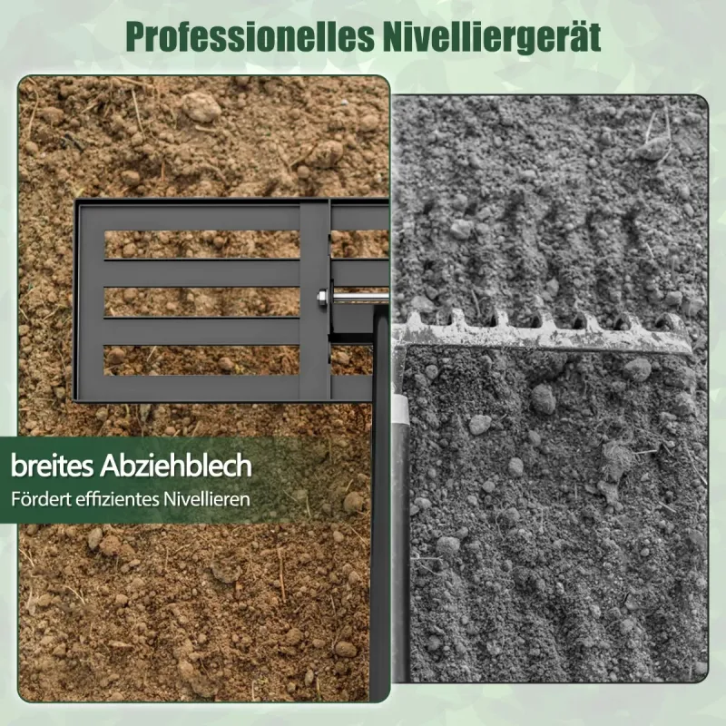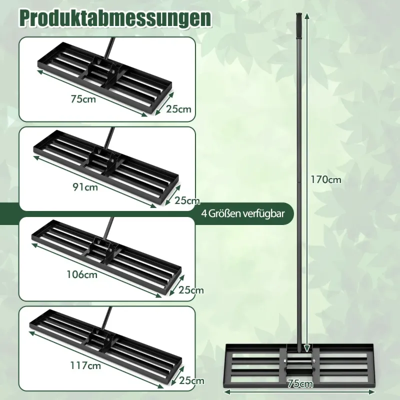 Naše hrable na trávu sú určite dobrým pomocníkom pri starostlivosti o trávnik! Vyrovnávacie hrable na záhradu sa dodávajú s veľkou doskou s rozmermi 75 x 25 cm, takže môžete ľahko udržiavať trávnik rovný a krásny. Dve odnímateľné tyče sú navyše dostatočne dlhé na to, aby ste mohli bez námahy pracovať bez toho, aby ste sa museli zohýbať. A keď ich nepoužívate, môžete ich ľahko rozložiť na uskladnenie. Vďaka gumovej rukoväti sa s ním pracuje aj pohodlne. V porovnaní s inými kovmi s hrúbkou 0,8 mm používame kov s hrúbkou 1,8 mm, ktorý sa vyznačuje vynikajúcou odolnosťou a robustnosťou. A prášková farba na povrchu dokáže zabrániť hrdzaveniu. Okrem toho sa hrable na trávu ľahko montujú a pred použitím stačí namontovať hlavu v tvare U a priskrutkovať tyč. Preto je tento užívateľsky prívetivý hrablič trávnika dobrou voľbou na vyrovnanie trávnika na dvore, v záhrade a na golfovom ihrisku. Atribúty: Ergonomická dlhá rukoväť: Nivelačný prístroj je vybavený 170 cm dlhou tyčou a umožňuje bezproblémové ovládanie, ktoré zvyšuje efektivitu vašej práce bez toho, aby ste sa museli zohýbať. Tyč má protišmykovú PVC rukoväť, ktorá zaisťuje pevné a pohodlné uchopenie. Účinné a široké ploché hrable: V porovnaní s inými vyhladzovačmi trávnika majú tie naše rozprestierajúci sa tanier s rozmermi 75 cm x 25 cm, ktorý pokrýva veľkú plochu na jednoduché odstraňovanie kameňov zo zeme a rozbíjanie malých zhlukov. Má tiež flexibilnú rotačnú hlavu v tvare písmena U, ktorá vám urýchli prácu pri urovnávaní. Robustný kovový rám: Naše hrable na trávu sú vyrobené z lakovaného kovu s hrúbkou 1,8 mm a sú odolné voči deformácii a hrdzi, čo zaručuje dlhú životnosť. Hlava hrablí a tyč sú navyše pevne spojené skrutkami, ktoré sa len tak neuvoľnia ani nezlomia. Jednoduchá montáž a skladovanie: Hrable na terénne úpravy sa ľahko montujú. Stačí si pripraviť všetky diely, zarovnať hlavu v tvare U so skrutkami, potom naskrutkovať násadu a utiahnuť, aby sa montáž dokončila. Skladovanie je tiež veľmi jednoduché vďaka oddeleniu dvoch častí tyče. Vhodné na rôzne druhy trávy: Tieto hrable sú vhodné na trávniky na dvoroch, v záhradách, na pastvinách, farmách, golfových ihriskách a futbalových ihriskách. Zároveň sú hrable na trávnik ideálne na urovnávanie pôdy, piesku, ornice, rašelinového machu a kompostu. Vlastnosti: Dvojdielna dlhá tyč pomáha znižovať bolesť chrbta Nekĺzavá rukoväť poskytuje pevný úchop Veľká hrabacia hlava jemne vyrovná trávnik Kovové rúrky s práškovou povrchovou úpravou sú odolné proti korózii a robustné 180° otočná hlava v tvare U podporuje efektívnu prevádzku Vybavená skrutkovacou tyčou na jednoduchú montáž Odnímateľná tyč umožňuje jednoduché skladovanie Ideálne na všetky druhy trávy na dvore, v záhrade a na golfovom ihrisku