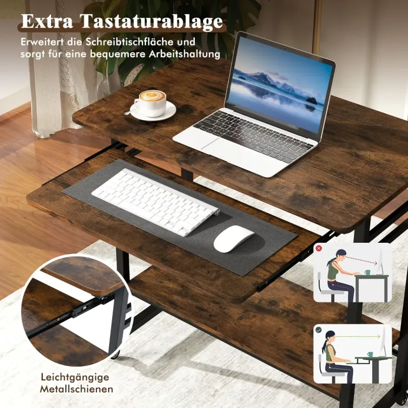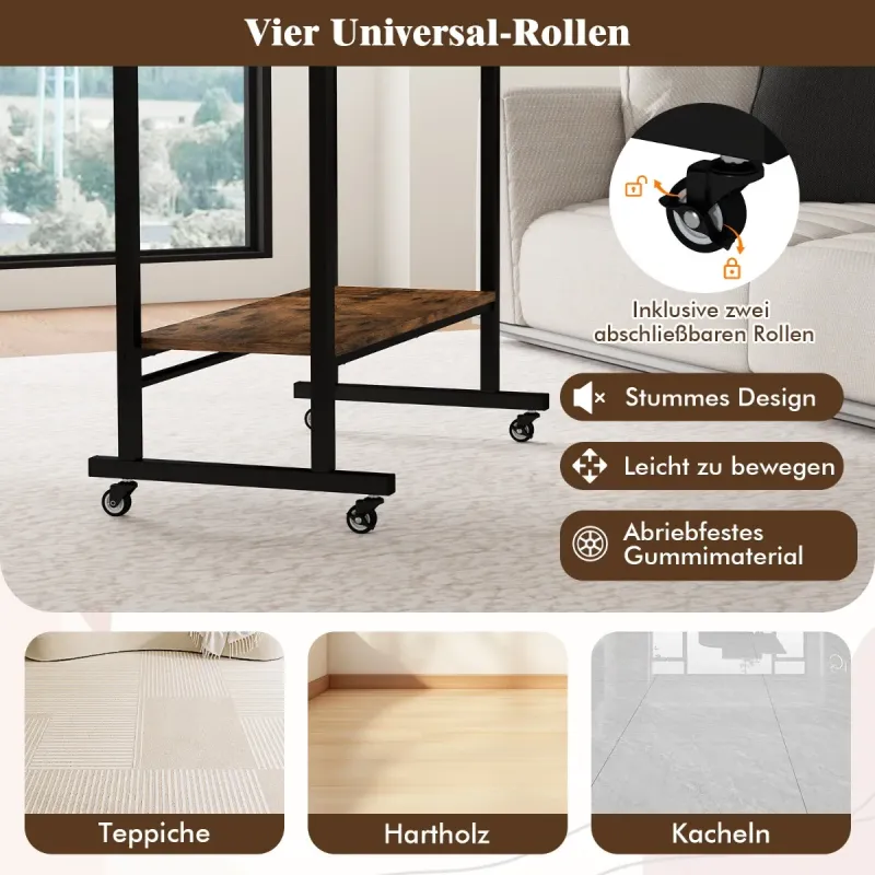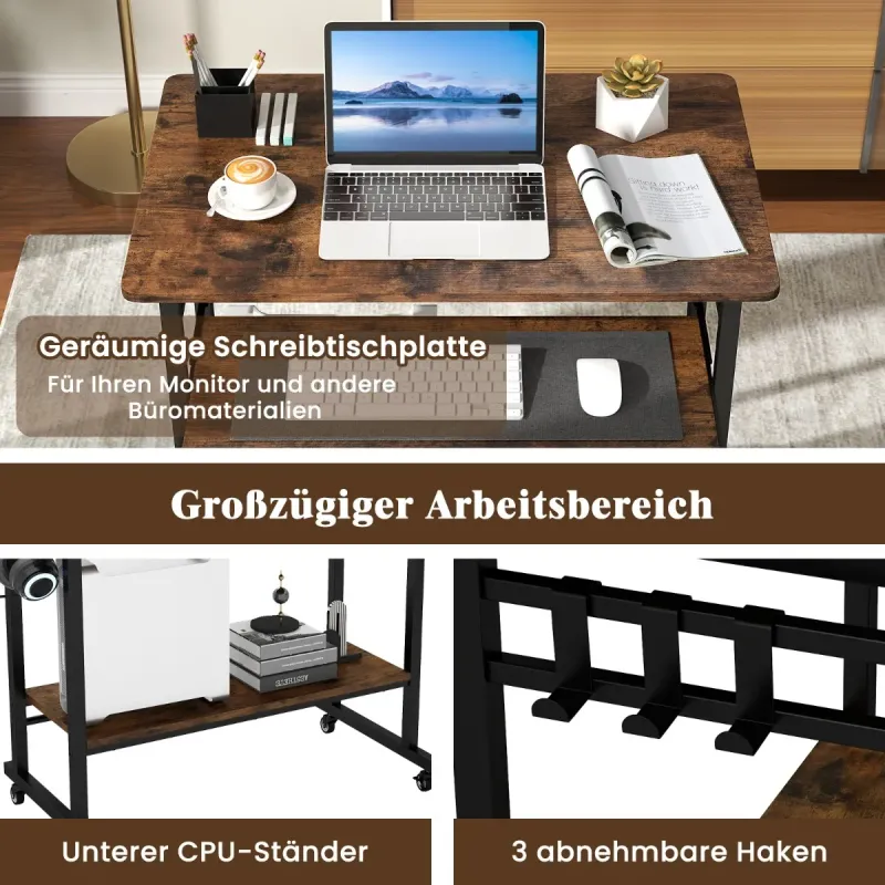Maximalizujte svoj priestor s naším všestranným a štýlovým mobilným počítačovým stolom! Tento elegantný a kompaktný stôl s rozmermi 80 cm x 50 cm x 78 cm (D x Š x V) je ideálny pre úzke kúty vášho domova alebo kancelárie. Či už potrebujete produktívny pracovný alebo študijný priestor, tento stôl je pre vás. Navyše vždy udržiava poriadok vďaka dostatku úložného priestoru, praktickej výsuvnej priehradke na klávesnicu, 3 odnímateľným háčikom a spodnej poličke na uvoľnenie miesta na doske stola. A stolík na notebook sa dá jednoducho premiestniť a uzamknúť pomocou 4 univerzálnych koliesok. Vďaka robustnému kovovému rámu zostáva počítačový stôl vždy stabilný a odolný. V neposlednom rade vám ľahko čistiteľný povrch ušetrí čas a námahu pri každodenných domácich prácach. Vlastnosti: Vhodný do obmedzených priestorov: Mobilný počítačový stôl s rozmermi 80 cm D x 50 cm Š x 78 cm V je vhodný na domáce alebo kancelárske použitie a hodí sa aj do malých rohov, aby sa ušetrilo miesto. Funguje dobre ako pracovný stôl pre tých, ktorí pracujú z domu, alebo ako študijný priestor pre študentov. Rozumné využitie vertikálneho priestoru: Rolovací vozík na notebook vám ponúka dostatok úložného priestoru vrátane priestrannej stolovej dosky, výsuvnej priehradky na klávesnicu, 3 odnímateľných háčikov a spodnej police. To znamená, že všetky nástroje, ktoré potrebujete na prácu, môžete mať na dosah. Presuňte ich, kam chcete: Pracovná stanica mobilného počítača stojí na štyroch hladkých a tichých kolieskach, každé s brzdou na zastavenie vozíka. Navyše kolieska otočné o 360° nezanechávajú škrabance a sú šetrné k tvrdým dreveným, dláždeným alebo betónovým podlahám. Kvalitne spracovaný stolík na notebook: Počítačový stolík na kolieskach sa vyznačuje pevným kovovým rámom, robustnou konštrukciou a veľkou nosnosťou. Vďaka práškovému lakovaniu je kovový rám odolný a odolný voči hrdzi. Užívateľsky prívetivé detaily: Dizajn s okrúhlym rohom malého počítačového stola zabraňuje nehodám spôsobeným nárazom a robí ho bezpečným pre každodenné používanie. Krásny povrch dreva je navyše vodeodolný a uľahčuje čistenie. Vlastnosti: Stolová doska s priehradkou na klávesnicu ponúka priestor pre kompletné pracovné náčinie Súčasťou balenia sú 3 háčiky pre flexibilné možnosti uloženia Spodná polica ponúka pohodlný priestor pre počítačového hostiteľa Vďaka hladkým kovovým koľajničkám sa dá priehradka na klávesnicu jednoducho vytiahnuť 4 plynulý chod kolieska sa prispôsobia rôznym podlahám Vybavené brzdami na udržanie rolovacieho stola na mieste Odolný materiál a robustná konštrukcia zaručujú dlhú životnosť Podrobné pokyny prispievajú k ľahkej montáži