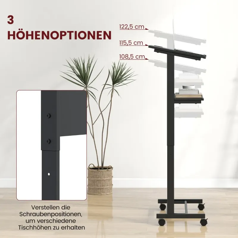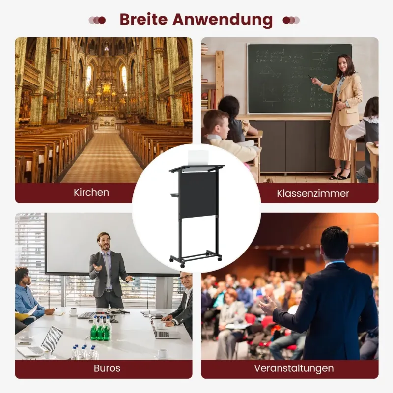 Objavte elegantný, mobilný a nastaviteľný pult, ktorý je ideálny pre každé miesto – od vašej domácej kancelárie až po triedu. Už nebudete mať problémy, ako sú bolesti chrbta alebo neporiadok, pretože tento pult sa dá nastaviť do 3 výšok a je vybavený inteligentným sklonom pre čítanie bez námahy. Udržujte svoje poznámky v bezpečí pomocou praktickej okrajovej zarážky a ďalší materiál si uložte do prídavného úložného priestoru. Už vás nebavia zamotané káble? Tento problém vyrieši integrovaný otvor na kábel. Bez námahy sa posúvajte z jednej miestnosti do druhej na robustných kolieskach a zaistite ich na mieste, keď je čas začať svoju úlohu. Náš profesionálny, prenosný a pripravený reproduktorový stôl je navrhnutý tak, aby vylepšil akúkoľvek prezentáciu. Posuňte svoj profesionálny imidž na vyššiu úroveň! Vlastnosti: Profesionálny vzhľad: Urobte dojem pri akomkoľvek prejave alebo prezentácii s všestranným stolom navrhnutým pre domácnosť, kanceláriu, triedu alebo kostol. Jeho čisté línie a elegantná povrchová úprava dodávajú prostrediu nádych elegancie a profesionality. Nastaviteľný pre optimálne pohodlie: Stôl na státie má 3 možnosti nastavenia výšky podľa vašej postavy a zaisťuje ergonomický komfort. To vám pomôže nájsť dokonalé držanie tela, vďaka čomu bude každá interakcia vzrušujúcejšia a menej stresujúca. Zabezpečte svoje pracovisko: Stolová doska stojaceho stola, ktorá je naklonená o 11°, ponúka optimálny pozorovací uhol a znižuje tak namáhanie krku a očí. Navyše, premyslený dizajn okrajovej zarážky udrží vaše poznámky a zariadenia bezpečne na mieste. Optimalizuje vaše nastavenie: S praktickým prídavným úložným priestorom a integrovaným otvorom na kábel je pódium navrhnuté pre efektívnosť. Udržujte svoje materiály usporiadané a svoj pracovný priestor uprataný a vytvorte elegantný obraz, ktorý odráža vašu profesionalitu. Pohybujte sa s istotou: Mobilný stolík na notebook stojí na odolnom kovovom podstavci a je pripravený na použitie so 4 360° univerzálnymi kolieskami vrátane 2 uzamykateľných koliesok pre stabilitu. Plynule prechádzajte z miestnosti do miestnosti a uvidíte, že tento stojaci stôl je ideálny takmer do každého prostredia. Vlastnosti: 3 výškové možnosti prispôsobenia potrebám rôznych skupín používateľov Umožňuje vám nastaviť polohy skrutiek, aby ste dosiahli rôzne výšky stola Ergonomicky naklonená doska stola pre pohodlný uhol pohľadu Prídavná polica na udržanie dôležitých vecí na dosah Dostatok priestoru na značky, poháre, diaľkové ovládače a notebooky Pevný kovový rám zaisťuje spoľahlivú podporu Vybavený 2 univerzálnymi kolieskami a 2 uzamykateľnými kolieskami pre mobilitu a stabilitu Všestranné použitie v kostoloch, triedach, kanceláriách a na podujatiach S otvorom pre kábel pre prehľadné vedenie káblov Okrajové zarážky zabraňujúce skĺznutiu predmetov Užívateľsky príjemné detaily so zaoblenými rohmi pre bezpečné použitie