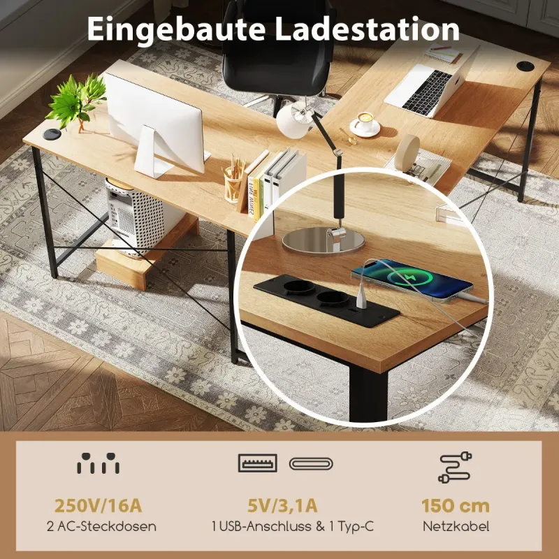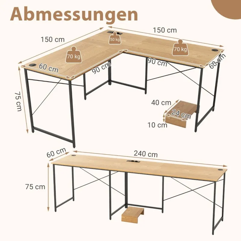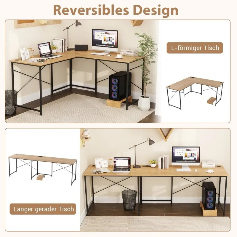 Náš prispôsobivý počítačový stôl v tvare L efektívne maximalizuje váš pracovný priestor. Môže sa plynulo meniť z tvaru L na dlhý rovný a prispôsobí sa akémukoľvek usporiadaniu miestnosti. So vstavanou napájacou lištou pre 2 AC zásuvky, porty USB a Type-C je nabíjanie zariadení jednoduché. Pohyblivý stojan na CPU možno použiť aj ako stojan na monitor. Pevný kovový rám a krížové výstuhy v tvare X poskytujú stolu spoľahlivú oporu. Priestranná plocha stola umožňuje efektívnu prácu. S naším obojstranným rohovým stolom jednoducho zvládnete viacero úloh! Vlastnosti: Prispôsobiteľný dizajn rozloženia: Náš obojstranný stôl v tvare L vám umožňuje bez námahy prepínať medzi rohovým stolom a rovným stolom. Prispôsobí sa rôznym usporiadaniam miestností v domácich kanceláriách a je ideálny pre akúkoľvek úlohu od práce až po hranie hier. Vstavaná rozvodka: Tento počítačový stôl má 2 AC zásuvky, 1 USB port a 1 port Type-C, čo umožňuje súčasné nabíjanie viacerých zariadení. Vaše dôležité nástroje sú vždy plne nabité a pripravené na použitie. Veľkorysý pracovný priestor: Veľkorysý pracovný priestor poskytuje dostatok priestoru pre projekty, organizovanie materiálov a umiestnenie viacerých monitorov alebo periférnych zariadení. Otvory na vedenie káblov zaisťujú čistý a efektívny pracovný priestor na rohovom stole. Všestranný stojan na CPU: Náš herný stôl obsahuje mobilný stojan na CPU, ktorý možno flexibilne umiestniť pozdĺž stola a použiť ho ako stojan na monitor pre viac miesta. Táto funkcia zvyšuje funkčnosť stola a prispôsobuje sa rôznym nastaveniam. Robustná a stabilná konštrukcia: Stôl do domácej kancelárie je vyrobený z pevného kovového rámu vystuženého krížovými výstuhami v tvare X, aby bola zaistená maximálna stabilita. Unesie až 190 kg. Nastaviteľné podložky na nohy navyše zaisťujú rovnováhu na nerovných podlahách a zaručujú pevný stojan Vlastnosti: Obojstranný dizajn na prepínanie medzi stolom v tvare písmena L a dlhým rovným stolom Vstavaná nabíjacia stanica na nabíjanie viacerých elektronických zariadení Otvory na vedenie káblov pre úhľadný a efektívny pracovný priestor Pohyblivý stojan na procesor poskytuje stabilnú platformu pre počítačovú vežu Priestorný povrch stola zaisťuje dostatočný pracovný priestor Pevný kovový rám so zosilnenými krížovými podložkami v tvare X.