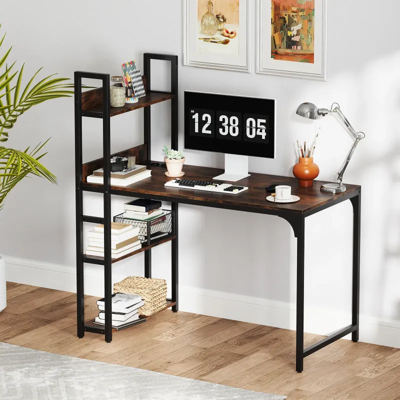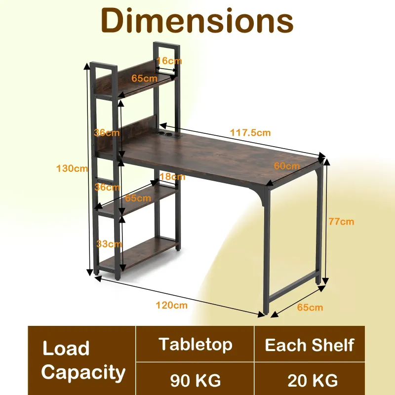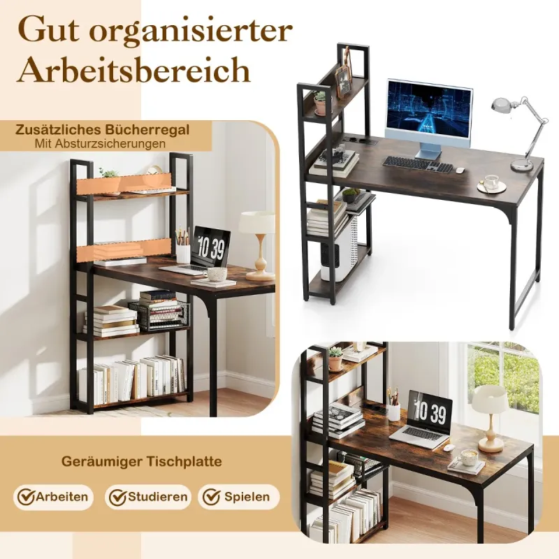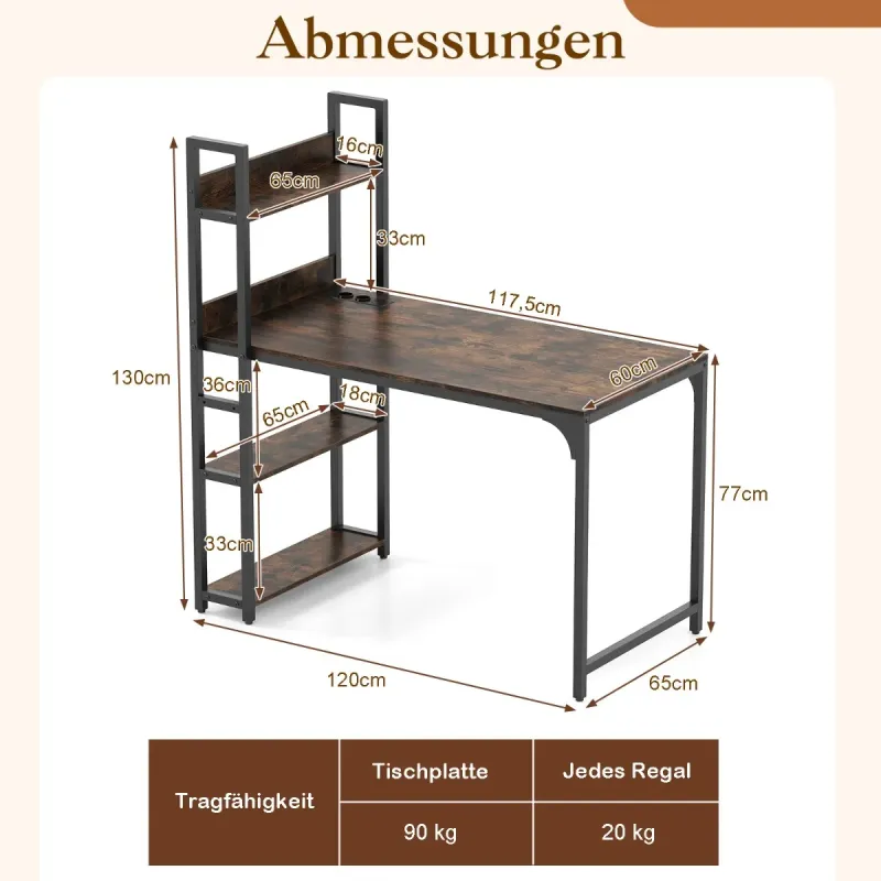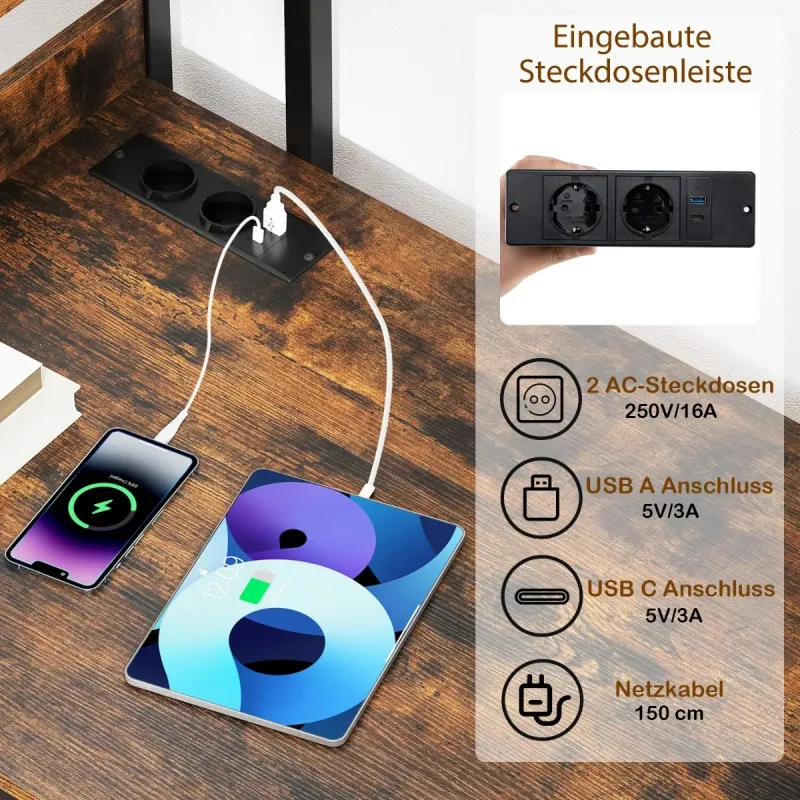 Tento všestranný počítačový stôl ponúka zabudovanú napájaciu lištu na pohodlné nabíjanie, ktorá je vybavená zásuvkami na striedavý prúd, portom USB-A a portom USB-C. Okrem toho má stôl robustný kovový rám s nastaviteľnými podložkami pod nohy pre stabilitu a vysokú nosnosť 150 kg. S praktickou policou na knihy a tyčami proti prevráteniu na bezpečné uloženie predmetov maximalizuje efektívnosť využitia priestoru v každej miestnosti. Veľkorysá stolová doska je vhodná na rôzne činnosti, napríklad na prácu alebo hranie hier. Tento stôl možno použiť ako pracovnú stanicu na notebook, herný stôl, toaletný stolík a ďalšie, v závislosti od vašich potrieb. Vlastnosti: Stolík je vhodný na prácu v domácnosti, ale aj na prácu s deťmi: Praktická nabíjacia stanica: počítačový stôl je vybavený vstavanou napájacou lištou, ktorá ponúka 2 zásuvky AC s napätím 250 V/16 A, port USB-A s napätím 5 V/3 A a port USB-C s napätím 5 V/3 A. Táto pracovná stanica zabezpečí, že všetky vaše zariadenia budú vždy po ruke a nabité. Dobre organizovaná pracovná stanica: Stôl má prídavnú policu, ktorá naplno využíva vertikálny priestor a je vybavená tyčami proti prevráteniu na bezpečné uloženie vašich predmetov. Je to dokonalé riešenie pre malé priestory. Robustný & Stabilná konštrukcia: PC stôl má pevnú kovovú konštrukciu a ponúka vysokú nosnosť 150 kg. Okrem toho je tento pracovný stôl vybavený nastaviteľnými podložkami pod nohy, ktoré zabezpečujú optimálnu stabilitu na nerovnom povrchu. Všestranné použitie: Vďaka veľkorysej doske stola je počítačový stôl vhodný na rôzne činnosti, ako je práca, štúdium, hranie hier a ďalšie. Vďaka svojmu dizajnu je ideálnou voľbou na rôzne miesta, ako je domáca kancelária, obývacia izba, spálňa a iné. Štýlový dizajn & jednoduchá údržba: Stôl do domácej kancelárie s rozmermi 120 x 65 x 130 cm sa môže pochváliť štýlovým dizajnom, ktorý doplní akýkoľvek interiér. Jeho povrch je navyše hladký a ľahko sa čistí, takže zostane v perfektnom stave dlhé roky. Vlastnosti: Zabudovaná napájacia lišta s 2 zásuvkami na striedavý prúd a 2 portami USB Prídavná polička na knihy s tyčou proti nakloneniu Veľká stolová doska ideálna na prácu, štúdium a hranie hier Spoľahlivá kovová konštrukcia pre veľkú stabilitu S trojuholníkovým rámom na spevnenie stola Vybavený nastaviteľnými podložkami pod nohy pre nerovnú podlahu Ideálny do vašej pracovne, obývačky, spálne a ďalších priestorov Podrobný návod na presnú inštaláciu