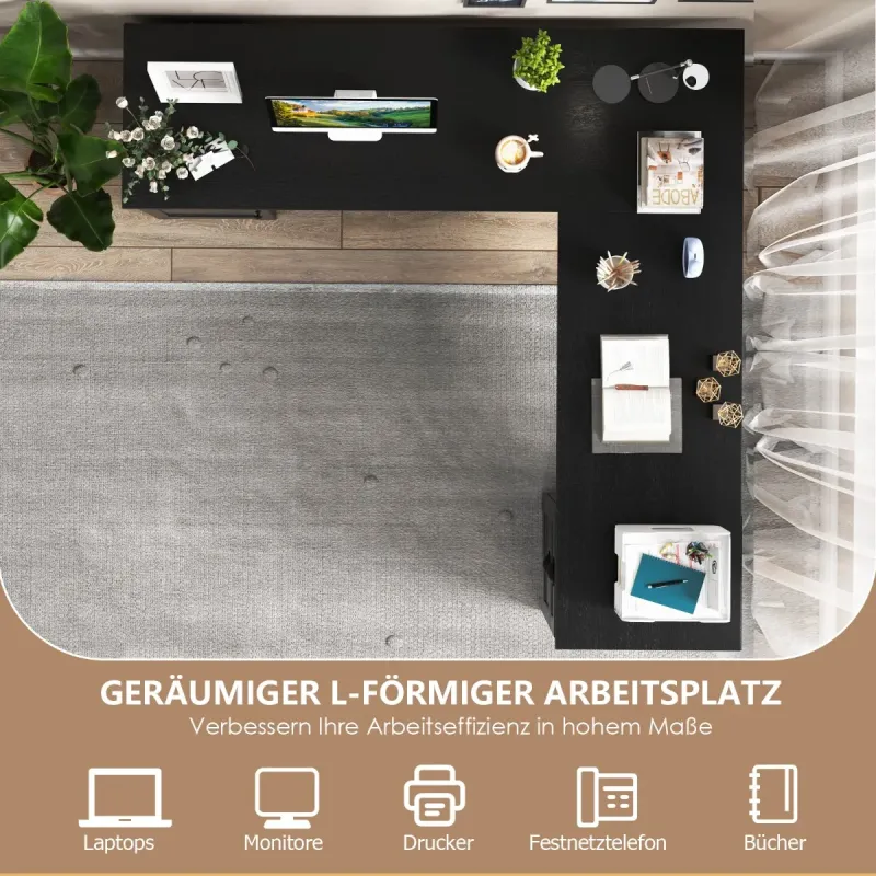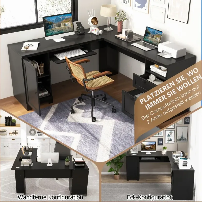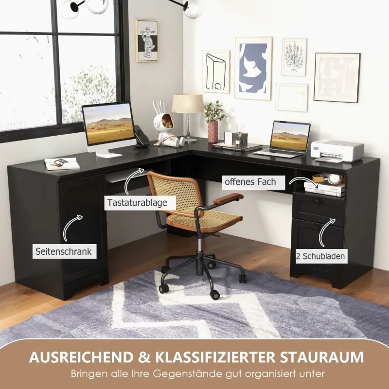 Tento počítačový stôl v tvare písmena L bol navrhnutý tak, aby maximalizoval funkčnosť a efektivitu pri práci. Vďaka svojmu dizajnu v tvare písmena L sa stôl bez problémov zmestí do každého rohu a efektívne šetrí cenný priestor. Okrem toho má stôl širokú dosku, ktorá je ideálna na notebooky, monitory, tlačiarne, pevné telefóny a knihy. Možno ho umiestniť aj ako rohový stôl alebo v šikmej konfigurácii, takže je ideálny do rôznych prostredí, ako je kancelária, pracovňa alebo dokonca herňa. Či už chcete študovať, pracovať alebo hrať hry, tento stôl v tvare L bude nepochybne skvelou voľbou. Vlastnosti: Funkčný dizajn v tvare písmena L: Počítačový stôl v tvare písmena L môžete ľahko zasunúť do rohu miestnosti a ušetriť tak veľa miesta. Okrem toho tento priestranný pracovný stôl v tvare písmena L výrazne zlepší váš pracovný výkon. Dostatok úložného priestoru: Okrem širokej stolovej dosky má stôl aj bočnú skrinku, priehradku na klávesnicu, otvorenú policu a 2 zásuvky. Veľká zásuvka na spisy je vybavená držiakom na dokumenty veľkosti listu. Tento rozsiahly a prehľadný úložný priestor zaručuje, že všetky vaše veci budú dobre usporiadané. Možno ho umiestniť kamkoľvek: Počítačový stôl možno umiestniť 2 spôsobmi: do rohu alebo od steny. Spĺňa tak rôzne požiadavky. Či už v kancelárii, pracovni alebo herni, tento stôl v tvare L je vždy príjemným doplnkom. Dômyselný dizajn: Nastaviteľná polica v skrinke s 1 cm hrubými stupňami umožňuje ukladať predmety rôznych veľkostí. A otvor na vedenie káblov udrží všetky vaše napájacie káble v poriadku. Hladká kovová bočná lišta navyše uľahčuje vysúvanie alebo zasúvanie zásuviek. Pevný & robustný stôl: Rohový stôl je vyrobený prevažne z vysokokvalitného materiálu a je dostatočne robustný na to, aby pojal všetky vaše kancelárske potreby. A odolný kovový záves skrine vydrží časté otváranie a zatváranie. Vlastnosti: - Vhodný na skladovanie potravín, ktoré sa dajú použiť na skladovanie potravín: Dodáva sa v 2 krabiciach, takže čas doručenia sa môže líšiť, a skrutky sú v krabici 1 Dizajn v tvare písmena L šetrí miesto a zvyšuje efektivitu práce Dostatok úložného priestoru dobre organizuje vaše predmety Nastaviteľná polica v skrini na predmety rôznych veľkostí Veľká zásuvka na spisy veľkosti listu Otvor na vedenie káblov udržuje napájacie káble dobre organizované Možno umiestniť do rohu alebo odvráteným spôsobom podľa vašich predstáv Farebné rozdiely sa môžu vyskytnúť v dôsledku rôzneho osvetlenia
