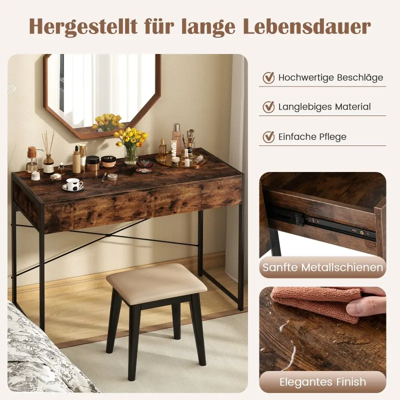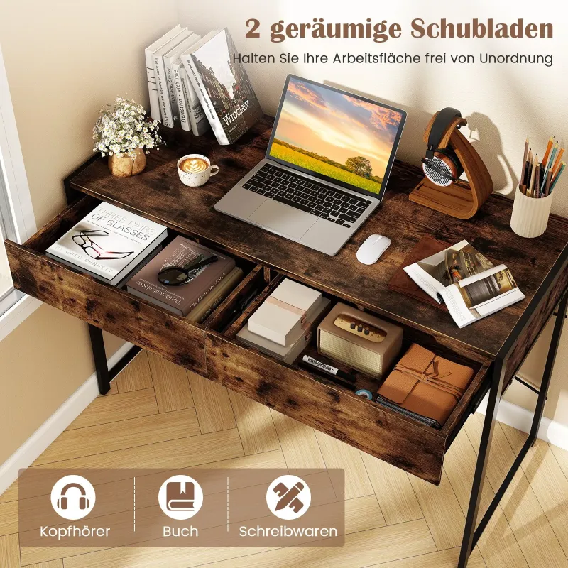 Či už v stiesnených priestoroch alebo na rozšírenie priestoru, tento multifunkčný počítačový stôl mení pravidlá hry! Je navrhnutý tak, aby bol stabilný, má odolný kovový rám a podpery v tvare písmena X a unesie až 90 kg - ideálny pre všetky vaše zariadenia. Máte už dosť neporiadku? Rozlúčte sa s neporiadkom vďaka 2 hlbokým zásuvkám s hladkým chodom! Zvýšte svoju produktivitu vďaka tomuto upokojujúcemu dizajnu vrátane zabezpečenia proti prevráteniu. Ideálny do malých bytov, internátnych izieb alebo útulných kancelárií, bez námahy sa premení z hernej stanice na elegantnú kozmetickú skrinku. Nielen organizujte, ale aj revolučne upravte svoj pracovný priestor s eleganciou a efektivitou! Premeňte svoj profesionálny a osobný priestor hneď teraz! Vlastnosti: - Vhodné pre použitie v domácnosti: Dostatok úložného priestoru: počítačový stôl je vybavený 2 hlbokými zásuvkami, ktoré udržia perá, zošity a nabíjačky mimo dohľadu, ale na dosah. Vďaka praktickému úložnému riešeniu bude váš pracovný priestor usporiadaný a váš pracovný proces nerušený. robustná konštrukcia: Kompaktný stôl je postavený na odolnom kovovom ráme s podperou v tvare X a zosilnenou priečkou pre absolútnu stabilitu. Vďaka nastaviteľným podložkám pod nohy a stolovej doske s nosnosťou až 90 kg je tento stôl spoľahlivý pre vaše pracovné zariadenia. bezpečnostná ochrana: Kancelársky stôl obsahuje 2 súpravy proti nakloneniu, ktoré sú bezpečne ukotvené do steny. Tento dodatočný bezpečnostný prvok zaručuje pokoj pri práci, či už pod tlakom termínov, herných maratónov alebo tvorivých projektov. premyslené detaily: Pracovný stôl je zakončený elegantným povrchom odolným proti poškriabaniu, ktorý sa dá vyčistiť za niekoľko sekúnd. Vďaka premysleným detailom, ako sú hladké kovové koľajničky, je každodenné používanie bezproblémové a ľahko sa čistí. všestranné použitie: PC stôl s rozmermi 111 × 48 × 76 cm sa dokonale hodí do bytov, ubytovní alebo malých kancelárií a stále ponúka priestor na klávesnicu, podložku pod myš a monitor. Jeho všestranné rozmery znamenajú, že sa ľahko zmení z písacieho stola pre domácu kanceláriu na toaletný stolík alebo streamovaciu stanicu.vlastnosti:2 priestranné zásuvky udržiavajú pracovnú plochu upratanúX-tvarovaná konštrukcia pre vynikajúcu stabilituVystužená priečka zlepšuje celkovú konštrukciuNastaviteľné podložky pod nohy sa prispôsobia nerovným podlahám2 súpravy proti prevráteniu zabezpečia stôl, aby sa zabránilo nehodámVyrobený z vysokokvalitných materiálov pre dlhú životnosťBezporuchové kovové koľajničky uľahčujú vysúvanie zásuviekLekká povrchová úprava pre jednoduchú údržbuVyžaduje sa montáž