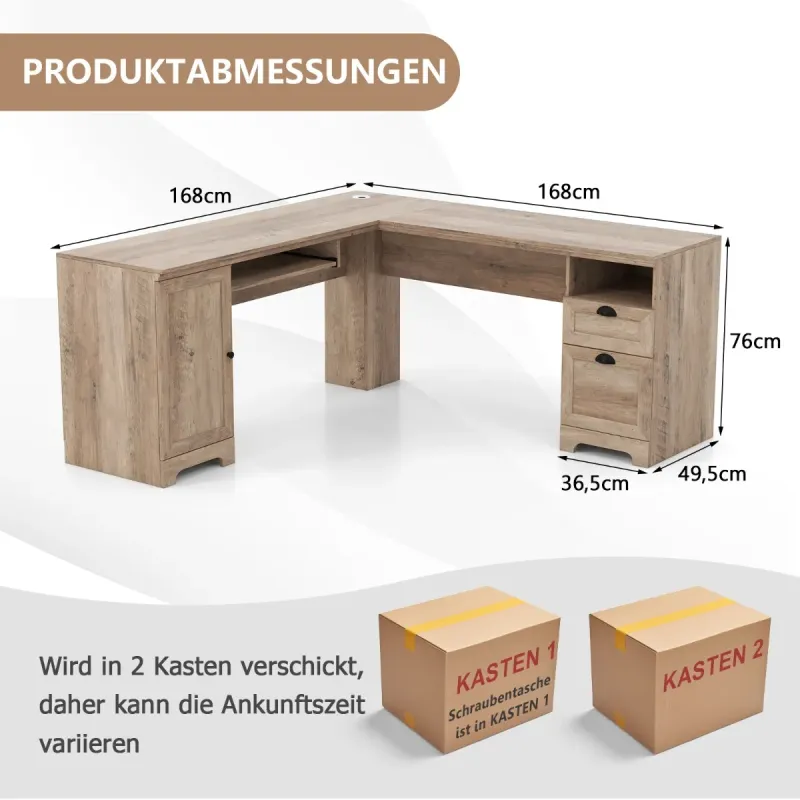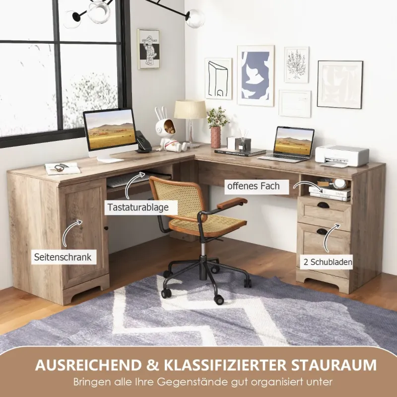 Tento počítačový stôl v tvare L je navrhnutý tak, aby maximalizoval funkčnosť a efektivitu pri práci. Vďaka dizajnu v tvare L sa stôl bez námahy zmestí do každého rohu a efektívne šetrí cenný priestor. Okrem toho má stôl širokú dosku, ktorá dokonale pojme notebooky, monitory, tlačiarne, pevné telefóny a knihy. Dá sa umiestniť ako rohový stôl alebo v konfigurácii otočenej smerom od seba, vďaka čomu je ideálny do rôznych prostredí, ako je kancelária, pracovňa alebo dokonca herňa. Či už chcete študovať, pracovať alebo hrať hry, tento stôl v tvare L bude nepochybne skvelou voľbou. Vlastnosti: Funkčný dizajn v tvare L: Počítačový stôl v tvare L sa dá ľahko zasunúť do rohu vašej miestnosti, čím sa ušetrí značné miesto. Okrem toho táto priestranná pracovná stanica v tvare L výrazne zlepší váš pracovný výkon. Dostatok úložného priestoru: Okrem širokej dosky stola má stôl aj bočnú skrinku, odkladaciu plochu na klávesnicu, otvorenú policu a dve zásuvky. Veľká zásuvka na spisy je vybavená držiakom na dokumenty veľkosti Letter. Takýto rozsiahly a organizovaný úložný priestor zaisťuje, že všetky vaše veci budú dobre zorganizované. Umiestniteľný kdekoľvek: Počítačový stôl je možné umiestniť dvoma spôsobmi: do rohu alebo od steny. To spĺňa rôzne potreby. Či už v kancelárii, pracovni alebo herni, tento stôl v tvare L je vždy skvelým doplnkom. Premyslený dizajn: Nastaviteľná polica v skrinke s 1 cm krokom umožňuje uloženie predmetov rôznych veľkostí. Otvor na vedenie káblov udržiava všetky vaše napájacie káble upratané. Hladká kovová bočná lišta navyše uľahčuje vyťahovanie alebo zasúvanie zásuviek. Pevný a robustný stôl: Rohový stôl je vyrobený prevažne z vysoko kvalitného materiálu a je dostatočne stabilný na to, aby sa doň zmestili všetky vaše kancelárske potreby. Odolný kovový pánt skrinky znesie časté otváranie a zatváranie. Vlastnosti: Bude dodaný v 2 krabiciach, takže čas doručenia sa môže líšiť a skrutky sú v krabici 1 Dizajn v tvare L šetrí miesto a zlepšuje efektivitu práce Dostatok úložného priestoru dobre organizuje vaše predmety Nastaviteľná polica vo vnútri skrinky pre predmety rôznych veľkostí Veľká zásuvka na spisy veľkosti Letter Otvor na vedenie káblov udržiava napájacie káble dobre organizované Možno umiestniť do rohu alebo otočiť smerom od steny podľa potreby Farebné rozdiely sa môžu vyskytnúť v dôsledku rôzneho osvetlenia.