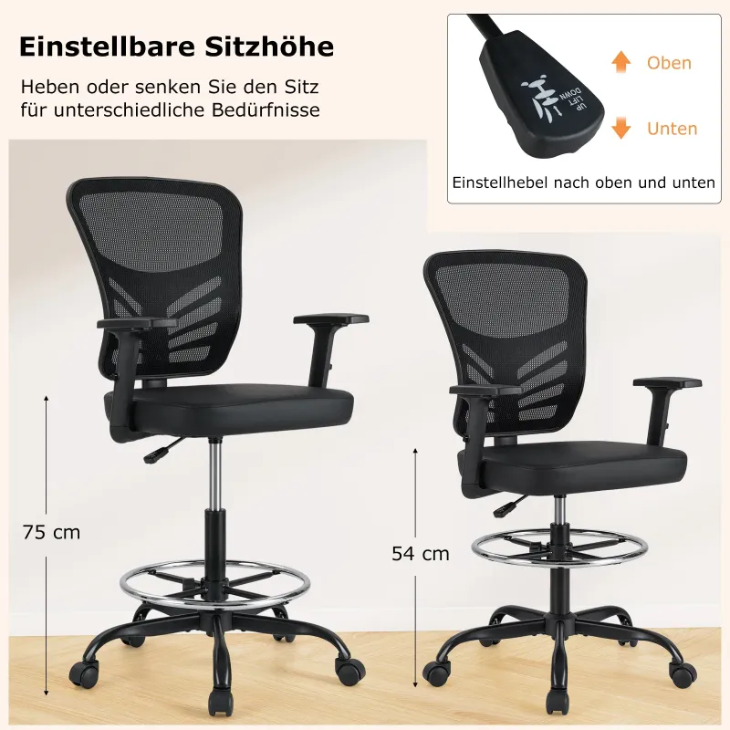 Operadlo v tvare písmena S a bedrová opierka v tvare písmena Y podporujú vzpriamené sedenie. Hustá sieťovina, hladká imitácia kože a elastická pena zaručujú pohodlné sedenie. Sedadlo sa dá otáčať o 360° a je nastaviteľné v rozsahu 54 až 75 cm. Výšku podrúčky možno nastaviť pomocou nastavovacích gombíkov, zatiaľ čo aretačný gombík fixuje výšku krúžku podnožky. Vďaka 5-ramennej hviezdicovej základni a kvalitnej plynovej tlakovej pružine je otočná kancelárska stolička stabilná. Flexibilnú mobilitu zabezpečuje 5 koliesok. Či už pri stojacom pracovnom stole, alebo pri kresliacom stojane - táto stolička je dokonalým riešením. Vylepšite si svoje pracovisko touto všestrannou a štýlovou kancelárskou stoličkou ešte dnes! Vlastnosti: Výškovo nastaviteľné otočné sedadlo: Páčka na nastavenie výšky sedadla umožňuje prispôsobiť sedadlo stoličky vašim individuálnym potrebám. Výšku sedadla možno nastaviť od 54 do 75 cm, takže je vhodné pre stoly s rôznou výškou. Flexibilitu a pohodlie vám ponúka aj 360-stupňové otočné sedadlo. nastaviteľné podrúčky & krúžok na nohy: Výšku podrúčky možno nastaviť stlačením tlačidla, aby ste si mohli optimálne oprieť ruky. Krúžok na opierku nôh sa dá nastaviť od 20 do 38 cm a poskytuje optimálnu oporu pre vaše nohy. odolné &; pohodlné materiály: Opierka chrbta je potiahnutá priedušnou sieťovinou, ktorá zabraňuje poteniu. Sedák je zasa vyrobený z umelej kože šetrnej k pokožke a mäkkej penovej výplne pre optimálne pohodlie. ergonomické operadlo &; bedrová opierka: Operadlo v tvare písmena S sa prispôsobí tvaru vášho tela a poskytuje ergonomickú oporu na ochranu chrbtice. Bedrová opierka v tvare písmena Y tiež podporuje správne držanie tela pri sedení. vynikajúca stabilita & flexibilná mobilita: základňa s 5 nožičkami a plynová tlaková pružina zabezpečujú vynikajúcu stabilitu a vysokú nosnosť 150 kg. Okrem toho je pracovná stolička vybavená 5 univerzálnymi kolieskami na plynulú mobilitu. Vlastnosti: Nastaviteľná výška sedadla 54 - 75 cm sa prispôsobí ľuďom s rôznou výškou. podrúčky sa dajú nastaviť o 9 cm pomocou nastavovacích gombíkov. výškovo nastaviteľný krúžok podnožky (20 - 38 cm) podoprie vaše nohy.Otočením gombíka uvoľníte alebo zablokujete krúžok na opierku nôh.ergonomické operadlo v tvare písmena S a bedrová opierka na zmiernenie únavy.hustá sieťovina pre vysokú priedušnosť.pena s vysokou hustotou pre maximálne pohodlie.syntetická koža odolná voči škvrnám pre jednoduché čistenie