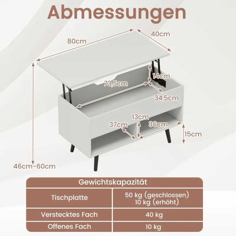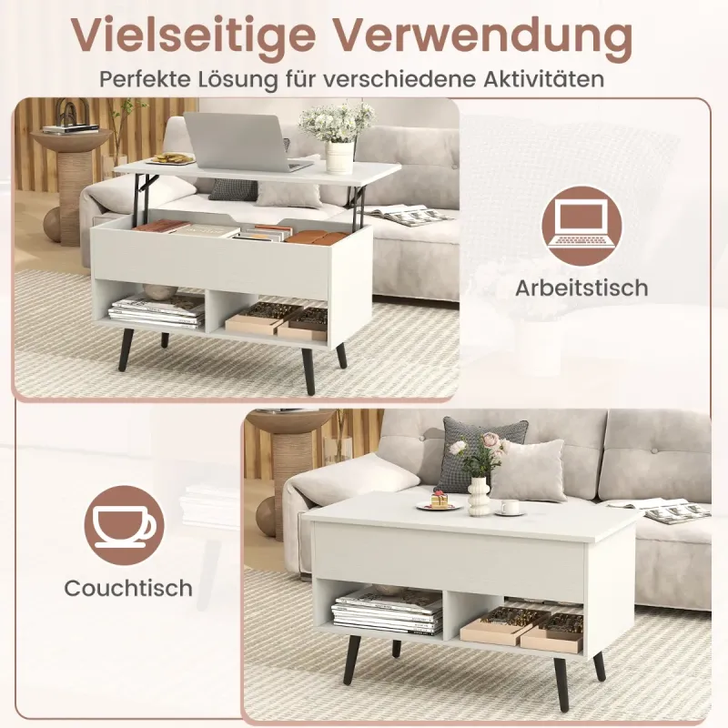 Jednoducho vylepšite estetiku svojho domova s týmto moderným konferenčným stolíkom. Či už potrebujete miesto na štúdium alebo si len chcete vychutnať večeru, bude vyhovovať vašim potrebám. Kovový pružinový zdvíhací mechanizmus uľahčuje zdvíhanie a spúšťanie dosky stola a poskytuje vám pohodlný pracovný stôl alebo koktailový stôl. S veľkou skrytou priehradkou a 2 otvorenými policami ponúka konferenčný stolík dostatok úložného priestoru pre vaše každodenné nevyhnutnosti, aby ste vytvorili viac miesta na stole. Vďaka pevnej konštrukcii sa nemusíte báť o jeho nosnosť a spoľahlivosť. Prineste si domov tento konferenčný stolík, ktorý predstavuje dokonalú rovnováhu medzi funkčnosťou a štýlovým dizajnom. Vlastnosti: Praktický dizajn so zdvíhateľnou doskou stola: Vysokokvalitný zdvíhací mechanizmus s plynovou vzperou uľahčuje zdvíhanie a spúšťanie dosky stola zo 44,5 cm na 58 cm a poskytuje vám vhodnú a prispôsobenú výšku. Vyrezaný dizajn vám umožňuje bez námahy zdvihnúť vrchnú časť a vytvoriť tak personalizovaný pracovný alebo jedálenský kút, keď sedíte na pohovke. Pestrý úložný priestor: Široká stolová doska nielen uľahčuje umiestnenie potrebného náčinia, ale ponúka aj dostatok priestoru pre domáce kancelárske aktivity. Okrem toho má zdvíhací horný bočný stolík veľkú skrytú priehradku a 2 otvorené police, ktoré zväčšujú úložný priestor a priestor na vystavenie predmetov každodennej potreby. Spoľahlivá konštrukcia: Konferenčný stolík so zdvíhateľnou doskou je pevný a dobre vyrobený kus. Tento stredový stôl je vyrobený z hrubého upraveného dreva a MDF a je dostatočne pevný, aby uniesol celkovo až 60 kg. Jeho nohy z masívneho dreva tiež poskytujú spoľahlivú oporu a protišmykové podložky chránia podlahu pred poškriabaním. Moderný štýl pre mnoho použití: Konferenčný stolík je tak jednoduchý a elegantný, že ho môžete použiť ako pracovný stôl, jedálenský stôl alebo koktailový stôl v obývacej izbe, recepcii alebo kancelárii. Nepochybne bude dobrým doplnkom k ostatnému zariadeniu a dodá vášmu domovu estetickú krásu. Jednoduchá montáž a čistenie: S ilustrovanými pokynmi a kompletným príslušenstvom je zostavenie konferenčného stolíka hračkou. Vzdialenosť od podlahy k poličke je navyše 14,5 cm, čím zostáva dostatok miesta na čistenie podlahy. Vlastnosti: Kovový pružinový zdvíhací mechanizmus na ľahké zdvíhanie alebo spúšťanie stolovej dosky Široká stolová doska vám poskytuje dostatok pracovnej plochy a úložného priestoru Skryté priehradky a otvorené police vyhovujú vašim požiadavkám na skladovanie Hrubé drevo a MDF pre trvácne použitie Nohy z masívneho dreva zaisťujú spoľahlivú konštrukciu Ochranné oplotenie spodnej police tomu bráni Padajúce predmety Používa sa ako konferenčný stolík, kokteilový alebo pracovný stôl atď. Jednoduchý a moderný štýl sa hodí k bytovej dekorácii 14,5 cm medzera medzi policou a podlahou pre jednoduché čistenie podlahy Jednoduchá inštalácia podľa podrobného návodu