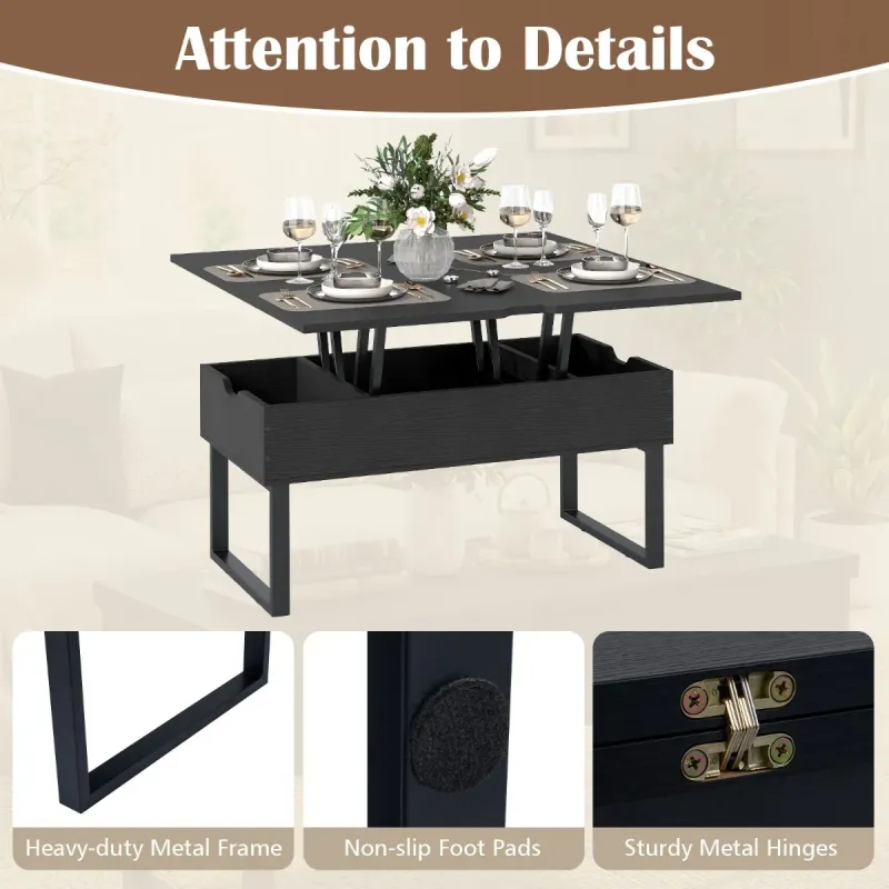 Plynový tlmič a výrezová rukoväť pre bezpečné zdvíhanie. Dizajn 3 v 1 pre rôzne požiadavky, ako je jedenie, prácu a relaxáciu. Možno ho používať ako bežný konferenčný stolík, stolík s dvojitou zdvíhateľnou doskou alebo jedálenský stôl. 2 zdvíhateľné dosky a 3 skryté priehradky na udržiavanie poriadku. Robustný kovový rám pre dlhú životnosť a stabilitu. Protiskluzové podložky na nohách na ochranu podlahy. Vyvýšený dizajn umožňuje prechod väčšiny vysávačov.
