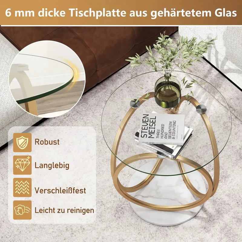Premeňte svoj obývací priestor s týmto skleneným konferenčným stolíkom! Okrúhly stolík má vysokokvalitnú dosku z tvrdeného skla, ktorá presvedčí svojou zvýšenou stabilitou a bezpečnosťou. Geometrický zlatý kovový rám zaisťuje stabilitu a zároveň je nápadným dizajnovým prvkom, ktorý skvele dopĺňa moderné interiéry. Veľkorysá plocha stolíka ponúka dostatok priestoru na odkladanie každodenných predmetov. Zaoblené hrany chránia pred poraneniami, zatiaľ čo kovové nohy bezpečne fixujú sklenenú dosku. Ideálny do obývacej izby, kancelárie alebo malých priestorov, tento akcentový stolík kombinuje funkčnosť a elegantný dizajn do univerzálneho pútavého kúsku.
