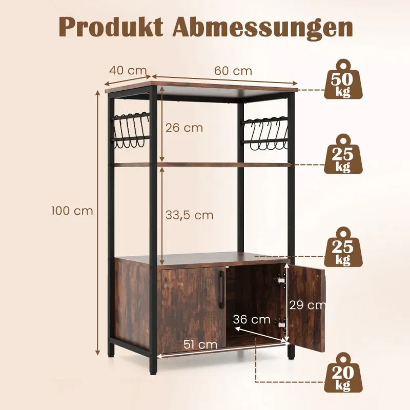 Vylepšite svoju kuchyňu alebo jedáleň univerzálnym stojanom na pečenie. Otvorené police poskytujú pohodlný prístup a priestor na vystavenie kuchynského náčinia, ktoré dopĺňa skrinka na odkladanie hrncov, panvíc alebo riadu. Desať háčikov v tvare písmena S je ideálnych na zavesenie kuchynského náčinia, uterákov alebo chňapiek a pod. Robustný kovový rám zabezpečuje spoľahlivú konštrukciu a poskytuje stabilitu a dlhú životnosť. Spodná skrinka je špeciálne vybavená zariadením proti prevráteniu a je dostatočne stabilná na to, aby udržala vaše každodenné predmety bez kolísania. Celkovo je tento priemyselný úložný regál inteligentným riešením pre každého, kto chce optimalizovať svoj obytný priestor. Atribúty: Dokonalé riešenie na uskladnenie: 2 otvorené police poskytujú dostatok priestoru na mikrovlnnú rúru, nádoby s korením alebo iné nevyhnutné veci a zároveň sú ľahko dostupné. Veľká skrinka navyše ponúka skrytý úložný priestor a udržiava nevzhľadný kuchynský neporiadok mimo dohľadu. 10 háčikov v tvare písmena S: Vďaka 10 háčikom v tvare písmena S poskytuje kuchynská polica ďalší závesný úložný priestor na náčinie, uteráky alebo čokoľvek iné, čo potrebujete mať po ruke. Takže sa už nemusíte obávať neporiadku v kuchyni. Robustný kovový rám: Skriňa je vyrobená zo zhrubnutého dreva pre dlhšiu trvanlivosť a stabilitu. Priemyselný úložný regál sa našťastie nebude ľahko deformovať ani kývať, pretože ho podopiera kovový rám s práškovou povrchovou úpravou. Navrhnutý pre stabilitu: Funkcia proti prevráteniu vám poskytne pokoj, pretože udrží regál na pečenie pevne na mieste. Nastaviteľné podložky pod nohy sú dôvodom, prečo kuchynská skrinka zostáva vyvážená a stabilná aj na nerovných podlahách. Industriálny & univerzálny kúsok: Industriálna estetika dopĺňa rôzne interiérové motívy. Tento kuchynský regál je ideálny na použitie v obývacej izbe, jedálni alebo kdekoľvek, kde je potrebný ďalší úložný priestor, a možno ho použiť aj ako praktickú špajzu alebo policu na knihy. Vlastnosti: 2 otvorené police poskytujú ľahký prístup k spotrebičom 2-dverová skrinka udržiava rôzne kuchynské potreby usporiadané 10 kovových háčikov je vhodných na zavesenie utierok alebo kuchynského náčinia Robustný kovový rám poskytuje pevnú oporu Nádherná povrchová úprava zaručuje dlhú životnosť Nastaviteľné podložky pod nohy zlepšujú stabilitu a zabraňujú poškriabaniu Vybavená ochranou proti prevráteniu pre väčšiu stabilitu a bezpečnosť Kovové úchyty a záves s mäkkým zatváraním uľahčujú otváranie dvierok Vhodná do obývačky, jedálne, kuchyne atď. Jednoduchá montáž s návodom