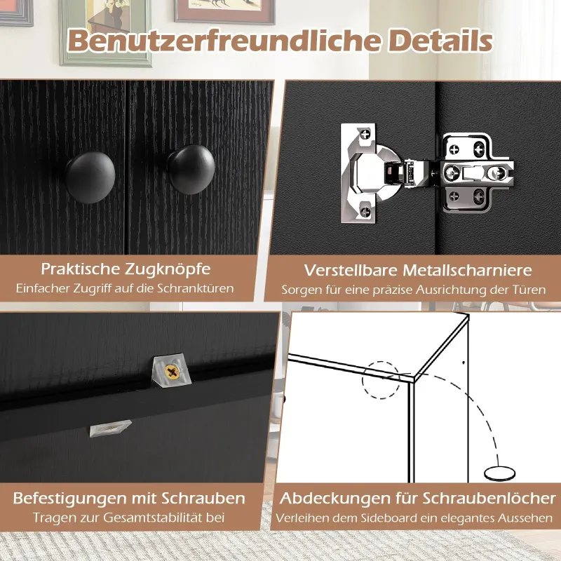 Vielseitig und stilvoll – dieser Küchen-Buffetschrank ist ein wahres Stauraumwunder mit Arbeitsplatte, Schrank und Fach. Er hält wichtige Dinge stets griffbereit und sorgt für Ordnung. Ob Dekoration, Geschirr, Küchenutensilien, Lebensmittel oder Getränke – hier findet alles seinen Platz. Die stabile Konstruktion trägt bis zu 110 kg und wird durch zwei Kippschutz-Kits und Metallbeine zusätzlich gesichert. Das 5-fach verstellbare Regal lässt sich flexibel an unterschiedliche Gegenstände anpassen. Das moderne, schlichte Design mit abgedeckten Schraubenlöchern verleiht jedem Raum zusätzlichen Charme. Weitere benutzerfreundliche Details warten auf Sie.Attribute:Mehr Stauraumoptionen: Der Buffetschrank bietet eine breite Arbeitsplatte zum Servieren, ein geschlossenes Schrankfach zur Aufbewahrung von Geschirr und ein offenes Fach für Küchenutensilien. Das 2-Türen-Design sorgt dafür, dass alle Inhalte leicht zugänglich sind.Anpassbare Konfiguration: Passen Sie den Stauraum individuell an – das Sideboard verfügt über ein in 5 Positionen verstellbares Regal mit einem Abstand von 3,2 cm. Entfernen oder verstellen Sie das Regal ganz einfach, um Küchenmaschinen, gestapeltes Geschirr oder andere Haushaltsgegenstände unterzubringen.Robuste Konstruktion: Für Langlebigkeit konzipiert – der Küchenschrank trägt bis zu 110 kg und steht stabil auf robusten Metallbeinen. Die Sicherheit steht im Vordergrund, wie durch die beiden Kippschutz-Kits belegt wird, die den Schrank zu einer sicheren Wahl für Haushalte machen.Elegantes, modernes Design: Der Kaffeebar-Schrank verfügt über Abdeckungen für Schraubenlöcher und sorgt so für ein nahtloses Aussehen. Seine klaren Linien und die funktionale Gestaltung machen ihn zu einem attraktiven und zugleich praktischen Möbelstück.Vielseitige Verwendung: Der Buffetschrank mit den Maßen 75 x 35 x 95 cm lässt sich perfekt in Küchen, Esszimmern, Wohnzimmern oder Fluren einsetzen. Dank seiner Multifunktionalität ist er ideal zur Aufbewahrung und Organisation.Eigenschaften:Breite Arbeitsplatte, geschlossener Schrank und offenes FachInnenregal verstellbar oder herausnehmbar für unterschiedlich hohe Gegenstände2 Kippschutz-Kits zur sicheren WandbefestigungMetallstützbeine zur strukturellen Verstärkung2-Türen-Design für bequemen ZugriffPraktische Griffe zum einfachen Öffnen der TürenVerstellbare Metallscharniere für präzise TürausrichtungVerbindungselemente mit Schrauben für zusätzliche StabilitätAbdeckungen für Schraubenlöcher für ein elegantes Gesamtbild12 cm Bodenfreiheit für einfaches ReinigenHinweis: Der Buffetschrank erfordert Montage