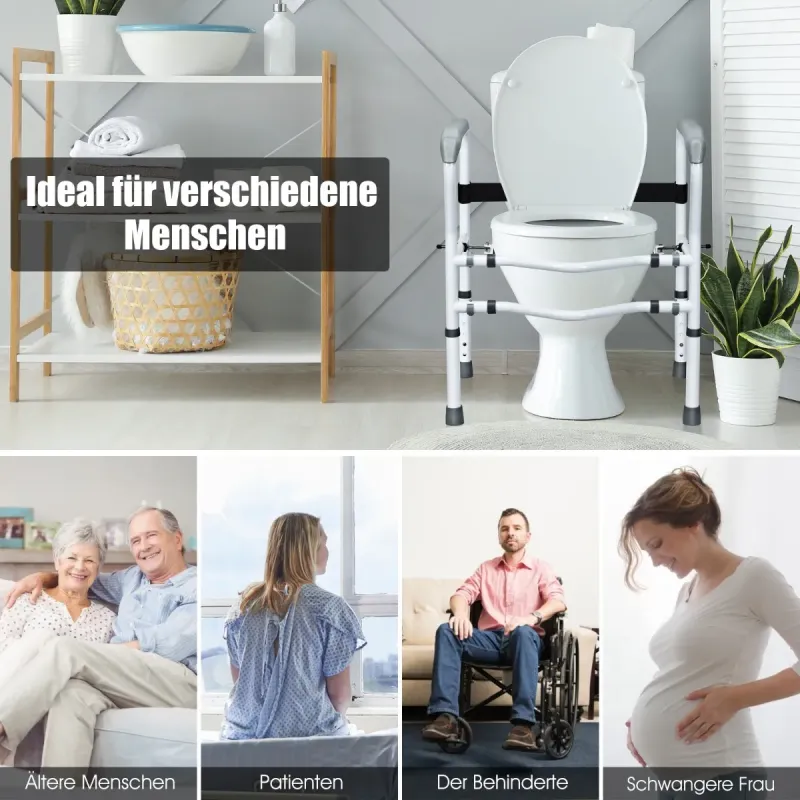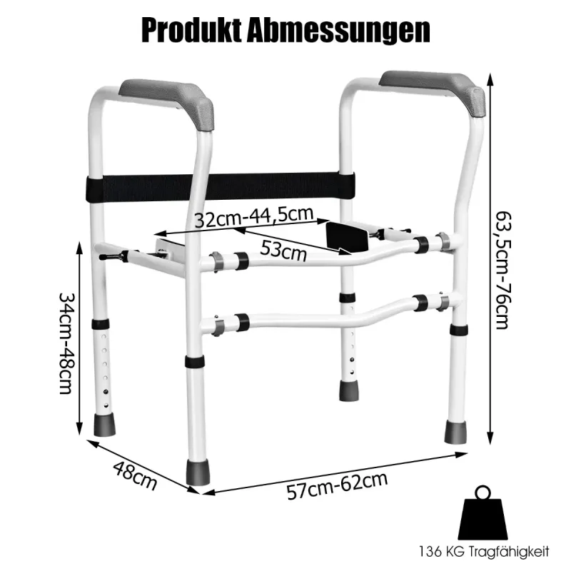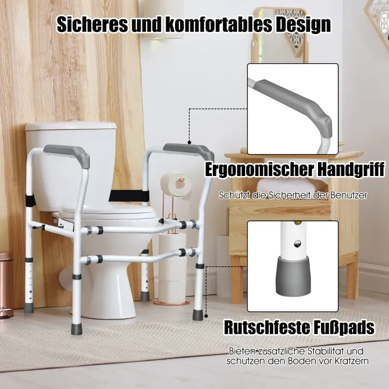 S týmto voľne stojacim záchodovým madlom môžete bezpečne sedieť na záchode! Vďaka nastaviteľnej výške (63-76 cm) a šírke (56,5 cm/62 cm) sa tento záchodový bezpečnostný rám s otočným klipom o 360° hodí na väčšinu záchodov a je vhodný pre užívateľov rôznych výšok a tvarov tela. Maximálna nosnosť 136 kg navyše umožňuje používať túto záchodovú zábranu rôznym osobám a zaisťuje bezpečné sedenie a státie. Protišmykové rukoväte a podlahové rohože tiež poskytujú dodatočnú bezpečnosť. Montáž tejto voľne stojacej záchodovej tyče nevyžaduje žiadne náradie, a preto je veľmi praktická. Vlastnosti: Vhodné pre väčšinu toaliet: S nastaviteľnou výškou 63-76 cm a nastaviteľnou šírkou (56,5 cm/62 cm) toto zábradlie nielenže funguje s väčšinou štandardných toaliet, ale tiež umožňuje užívateľovi prispôsobiť si veľkosť a tvar tela. Vylepšená pevná spona: Na rozdiel od iných tradičných záchodových rámov je toto voľne stojace zábradlie vybavené otočnými príchytkami o 360°, ktoré pomáhajú záchodovej tyči pevne pripojiť k záchodu. Spony sú vybavené EVA vankúšikmi, aby sa zabránilo poškriabaniu toalety. Bezpečné sedenie a státie: Vyrobený zo zosilneného rámu z uhlíkovej ocele, tento zdravotnícky kúpeľňový bezpečnostný pomocný rám obstál v skúške času a má silnú nosnosť až 300 libier. Preto ho môžu používať rôzni ľudia, ako napríklad: B. staršími a tehotnými ženami atď. Protišmykový dizajn: Pohodlné a ergonomické rukoväte s protišmykovým povrchom poskytujú bezpečný a pohodlný úchop pri sedení a státí. 4 protišmykové koberčeky zároveň poskytujú dodatočnú stabilitu a zabraňujú poškriabaniu podlahy. Jednoduchá montáž bez náradia: Inštalácia tejto samostatnej záchodovej bezpečnostnej lišty je celkom jednoduchá. Pre veľké pohodlie nie sú potrebné žiadne nástroje. Vlastnosti: Hodí sa na väčšinu toaliet vďaka nastaviteľnej výške a šírke Možno použiť dvoma rôznymi spôsobmi podľa vašich potrieb Pevne sa pripevní k toalete pomocou otočnej spony o 360° Zabraňuje poškriabaniu toalety pomocou ochranného EVA vankúšika Unesie až 136 kg s odolný rám z uhlíkovej ocele Vhodné pre starších ľudí, tehotné ženy a iné osoby v núdzi Vodotesné a protišmykové rukoväte pre bezpečné a pohodlné uchopenie Protišmykové Podlahové rohože pre väčšiu stabilitu a bezpečnosť Inštalácia bez použitia náradia pre veľké pohodlie a dobrý používateľský zážitok