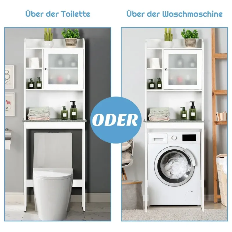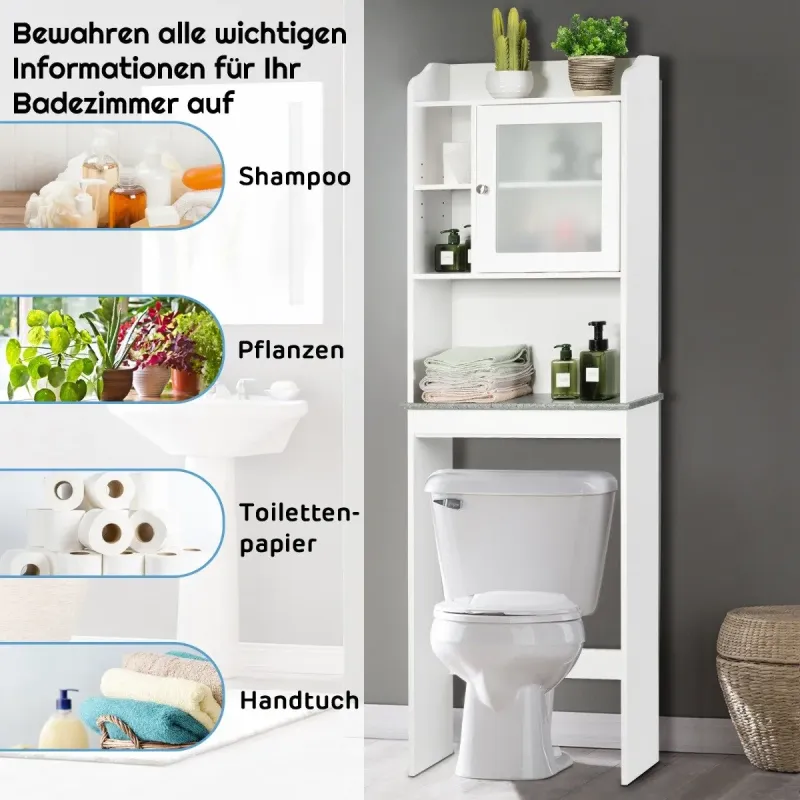 Naša robustná WC polica vám ponúka veľký vertikálny úložný priestor na každodenné použitie. je navrhnutá s rôznymi policami, možno ju použiť na organizované ukladanie a ponúka rôzne možnosti rozdelenia. Vďaka jeho flexibilite môžete výšku políc nastaviť podľa potreby. Je tiež dostatočne široký, aby sa dal umiestniť nad toaletu alebo práčku. Vďaka voľne stojacej konštrukcii sa optimálne využíva aj nevyužitý priestor, takže regál je ideálny do kúpeľní, na balkóny a do práčovní. Ľahko sa montuje a potom vyzerá veľmi atraktívne. Vlastnosti: Prispôsobiteľné úrovne: Naša toaletná skrinka má 2 malé poličky v tvare kocky, ktoré sa dajú posúvať podľa vašich rôznych potrieb na uskladnenie. Vďaka tomu môžete nastaviť výšku poličky do 5 úrovní v závislosti od veľkosti predmetu, ktorý chcete umiestniť, a pohodlne uložiť predmety na dosah. Úložný priestor všetko v jednom: Táto všestranná kúpeľňová skrinka, navrhnutá s viacerými policami, ponúka dostatok úložného priestoru. Objemné predmety môžete usporiadať na hornej otvorenej polici alebo na priestrannej mramorovej polici, vonné sviečky na strednej otvorenej polici a predmety citlivé na škvrny môžete umiestniť do úložného priestoru s dvierkami, ktorý zabraňuje tvorbe prachu a vlhkosti. Inteligentná úspora miesta: Táto bočná skrinka maximálne využíva nevyužitý úložný priestor nad toaletou a poskytuje viac miesta na odkladanie vecí. Jej voľne stojaci, priestorovo úsporný dizajn zaberá minimum miesta a maximalizuje dostupný priestor v kúpeľni, čo je ideálne pre malé byty. Robustná konštrukcia &jednoduchá údržba: Robustná drevená konštrukcia zaisťuje celkovú stabilitu a zaručuje vašu bezpečnosť pri každodennom používaní. Polička bola natretá farbou šetrnou k životnému prostrediu a má vynikajúcu odolnosť proti korózii a vlhkosti, vďaka čomu sa ľahko čistí vlhkou handričkou. Jednoduchá montáž&moderný dizajn: Táto jednoduchá kúpeľňová polica sa dodáva so všetkými dielmi a dobre ilustrovaným návodom. Všetko príslušenstvo je očíslované a ľahko rozlíšiteľné, aby ste ho mohli ľahko zostaviť. Polička na šetrenie miesta má moderný vzor a jej žilkovanie z umelého mramoru dodá vašej kúpeľni eleganciu. Vlastnosti:Nastaviteľné police na rôzne veľkosti predmetovViacero políc na dostatok úložného priestoru2 otvorené police na organizované ukladanieSkrinka so sklenenými dvierkami na súkromnejšie predmetyVyrobená z kvalitných drevených materiálov na dlhodobé používanieOptimálne využitie inak nevyužitého priestoru nad toaletouVodoodolná a ľahko sa čistí vďaka farebnej úprave