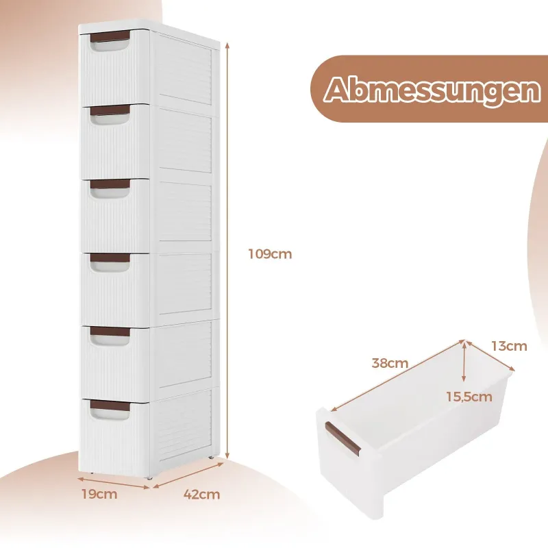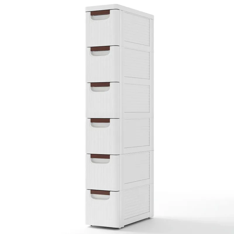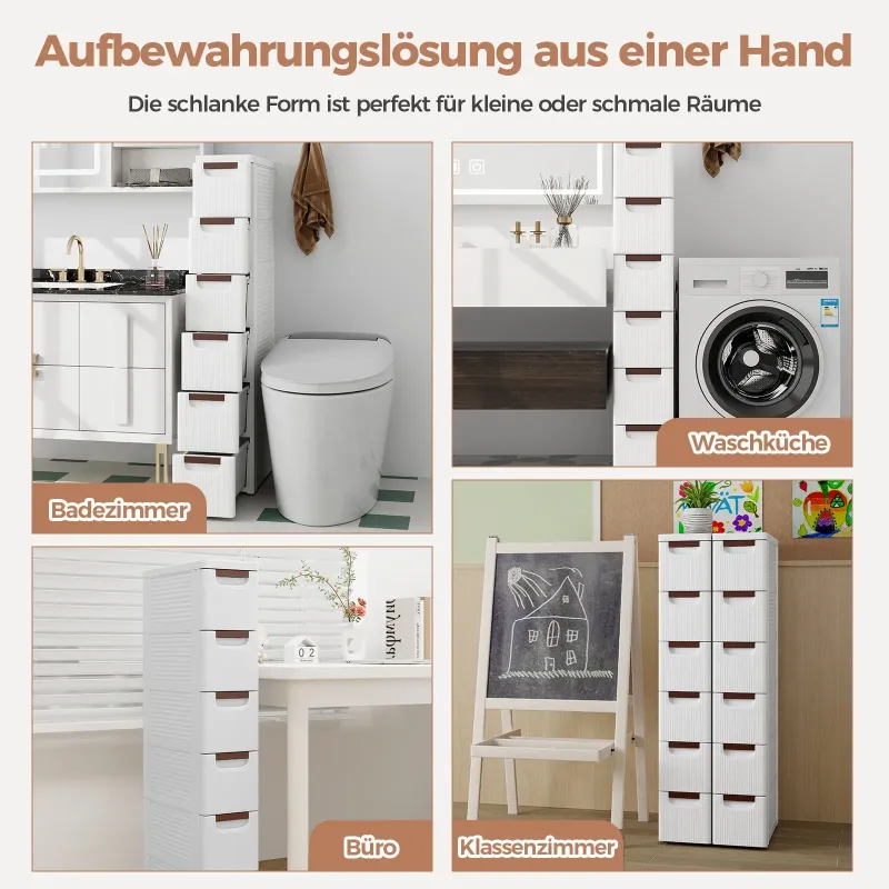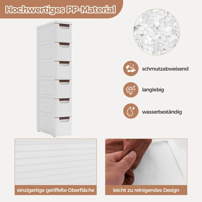 Táto pojazdná úložná jednotka vyrobená z vysokokvalitného PP má 6 zásuviek a ponúka dostatok priestoru na vytvorenie vlastného úložného systému. Vďaka svojmu štíhlemu dizajnu sa bez problémov zmestí do úzkych priestorov v každej miestnosti. Zabudované smerové kolieska zabezpečujú plynulú a efektívnu mobilitu, vďaka čomu sa skrinka ľahko presúva z miestnosti do miestnosti. Povrch úložnej skrine odpudzujúci nečistoty a vodu uľahčuje jej čistenie. Má užívateľsky prívetivé detaily, ako sú napríklad ľahko uchopiteľné rukoväte na ľahký prístup. Montáž je jednoduchá, bez potreby zložitého náradia - jednoducho pripevnite kolieska a začnite využívať funkčnosť a pohodlie tohto všestranného úložného riešenia. Vlastnosti: Viacero zásuviek: Úložná skriňa má 4 zásuvky, ktoré umožňujú kategorizovať a ukladať rôzne predmety. Či už ide o kancelárske potreby, kuchynské náčinie, hračky, občerstvenie alebo predmety do kúpeľa, všetko zostane prehľadne uložené a zároveň ľahko dostupné. Pre úzke priestory: Vďaka svojmu štíhlemu tvaru je mobilný stolík navrhnutý tak, aby sa zmestil do úzkych priestorov, takže je ideálnym doplnkom do každej miestnosti, od ateliéru až po triedu, pracovňu, kúpeľňu, kanceláriu alebo práčovňu. Efektívna mobilita: Presúvajte svoje potrebné veci bez problémov z miestnosti do miestnosti pomocou elegantného úložného boxu, ktorý je vybavený zabudovanými smerovými kolieskami, ktoré zabezpečujú elegantný dizajn aj pohyb bez námahy. Vysokokvalitný materiál: Rolovací úložný organizér vyrobený z vybraného PP zaručuje nielen dlhú životnosť, ale ponúka aj povrch odolný voči nečistotám a vode na pohodlné čistenie. Jednoduchá inštalácia: Voľne stojaca úložná skriňa je navrhnutá na jednoduché zostavenie. Stačí pripojiť kolieska a je pripravený na použitie. Nie sú potrebné žiadne zložité nástroje, takže si môžete takmer okamžite užívať pohodlie a funkčnosť. Vlastnosti:Vyrobená z vysokokvalitného PP materiálu, ktorý je odolný voči škvrnám, trvácny a vodotesnýUkladacie riešenie "všetko v jednom" so štíhlym tvarom je ideálne pre malé alebo úzke priestoryNavrhnutá s praktickými ťahacími úchytkami na jednoduché otváranie a zatváranieZabudované smerové kolieska pre atraktívnejší vzhľadJednoduchý dizajn, ktorý uľahčuje každodennú údržbuPraktická voľba do kúpeľne, práčovne, kancelárie, triedy a ďalších priestorovPredstavuje štýlový vzhľad vďaka jedinečnému drážkovanému povrchuNenáročná montáž si vyžaduje len pripevnenie koliesok