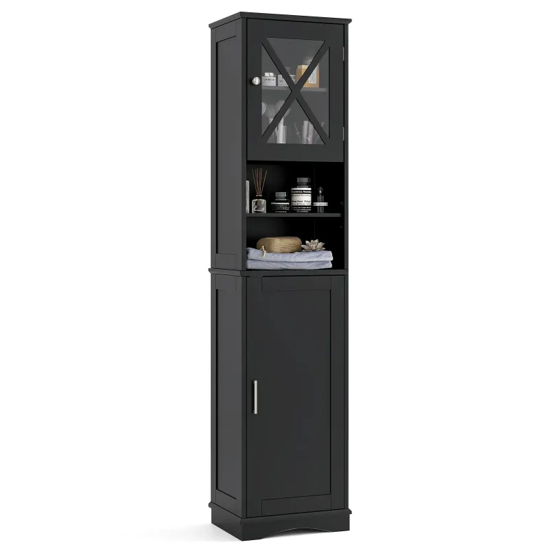 Využite úložný priestor v stiesnených priestoroch naplno s našou vysokou kúpeľňovou skrinkou! S dvoma otvorenými priehradkami a dvoma uzavretými skrinkami ponúka skrinka dostatok miesta pre vaše každodenné potreby. Obsahuje tiež päť nastaviteľných políc, ktoré je možné nastaviť tak, aby sa do nich zmestili predmety rôznych veľkostí. Skrinka je vyrobená z vysoko kvalitného akrylového panelu a MDF s vodeodolnou úpravou, ktorá zaisťuje dlhotrvajúcu odolnosť. Zariadenie proti prevráteniu poskytuje dodatočnú stabilitu a bezpečnosť. Kompaktný dizajn sa bez námahy zmestí do úzkych rohov, vďaka čomu je ideálny do kúpeľní, obývacích izieb, kuchýň, domácich kancelárií a ďalších miestností. Optimalizujte svoj priestor s touto praktickou rohovou podlahovou skrinkou. Vlastnosti: Priestranné úložné možnosti: Naša vysoká kúpeľňová skrinka obsahuje dve otvorené priehradky a dve uzavreté skrinky, ktoré ponúkajú dostatok miesta na vaše dekorácie, uteráky, toaletné potreby, čistiace prostriedky a mnoho ďalšieho. Nastaviteľné police: Vysoká skrinka má päť nastaviteľných poličiek, ktoré je možné nastaviť do troch výšok alebo vybrať. To umožňuje jednoduché nastavenie skrinky na bielizeň tak, aby sa do nej zmestili predmety rôznych veľkostí, čo umožňuje maximálnu efektivitu a organizáciu podľa vašich potrieb. Kompaktný dizajn pre malé priestory: S rozmermi 40 x 30 x 170,5 cm (D x Š x V) zaberá táto voľne stojaca vysoká skrinka málo miesta a ľahko sa zmestí do úzkych rohov. Kompaktný dizajn šetrí miesto bez straty úložného priestoru, vďaka čomu je ideálna do malých priestorov. Spoľahlivá konštrukcia: Kúpeľňová skrinka je vyrobená z vysoko kvalitného akrylového panelu a MDF, čo zaručuje odolnosť. Zariadenie proti prevráteniu navyše poskytuje zvýšenú stabilitu a bezpečnosť, aby sa predišlo pádom a zabezpečilo sa bezstarostné používanie. Všestranné použitie: Jednoduchý dizajn štýlovo zapadne do vašich obytných priestorov. Naša štíhla kúpeľňová skrinka je vhodná nielen do kúpeľní, ale aj do obývacích izieb, kuchýň alebo domácich kancelárií a ponúka praktické úložné riešenia. Vlastnosti: 2 otvorené priehradky a 2 uzamykateľné skrinky na vaše každodenné potreby 3-úrovňové nastaviteľné police na predmety rôznych veľkostí Vysokokvalitné akrylové panely sú vysoko odolné voči vode a rozbitiu Kompatibilný dizajn, ktorý sa ľahko zmestí do úzkych priestorov a rohov Zariadenie proti prevráteniu poskytuje dodatočnú stabilitu a bezpečnosť Pohodlné rukoväte a vysoko kvalitné pánty dverí pre jednoduché otváranie a zatváranie Ľahko čistiteľný povrch pre nejednoduchú údržbu Vhodné do kúpeľne, obývačky, kuchyne, domácej kancelárie atď.