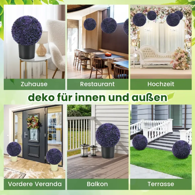 Naša súprava umelých rastlín obsahuje 2 gule topiary zo zimostrázu v žiarivej fialovej farbe, ktoré sú navrhnuté tak, aby imitovali pokojnú krásu prírodnej levandule a dodali elegantný a živý nádych každej miestnosti. Zelené gule vyrobené z vysokokvalitných PE listov sú spoľahlivé a časom nevyblednú, nevyžadujú zalievanie, strihanie, slnečné svetlo ani hnojenie. Navyše sa neuveriteľne ľahko inštalujú - každá guľa je vyrobená z dvoch polovíc, ktoré sa dajú ľahko spojiť pomocou praktických spojok a káblových viazačov. Vlastnosti: Živý a prirodzený vzhľad: Každá súprava obsahuje 2 topiary gule zo zimostrázu s priemerom 38 cm. Fialové listy imitujú umeleckú krásu levandule a dodajú vášmu obytnému priestoru prirodzenú eleganciu. Vysokokvalitný PE materiál: Listy sú vyrobené z vysokokvalitného PE materiálu, ktorý je odolný voči slnečnému žiareniu, farebne stály, nealergický a odolný voči praskaniu, čím poskytuje vždyzelenú expozíciu, ktorá je bezpečná a zároveň spoľahlivá pre dlhodobú životnosť. Bezúdržbový: Na rozdiel od skutočných rastlín, ktoré ľahko vädnú a blednú a vyžadujú si starostlivosť, tieto umelé levanduľové topiary nie sú ovplyvnené ročnými obdobiami a nevyžadujú žiadnu údržbu, takže zostanú vždy živé. Jednoduchá inštalácia: Každá guľa zo zimostrázu sa dodáva v 2 poloviciach, ktoré sa dajú ľahko spojiť pomocou priložených spojok a zabezpečiť priloženými káblovými páskami, takže inštalácia je rýchla a bezproblémová. Ak chcete dosiahnuť estetickejší vzhľad, odstrihnite všetky prebytočné časti káblových zväzkov. Univerzálna dekorácia do interiéru aj exteriéru: Tieto umelé zelené gule možno umiestniť na zem, zavesiť alebo umiestniť do kvetináča. Sú ideálne na skrášlenie terasy, záhrady, balkóna, vchodových dverí, vstupného priestoru alebo dokonca na podujatia, ako sú svadby a večierky. Vlastnosti: Sýtofialové listy napodobňujú očarujúci vzhľad skutočnej levandule PE listy sú bez zápachu a odolné voči slnku, vode a vyblednutiu, na dlhodobé používanie Nevyžadujú žiadnu údržbu, sú stále zelené, zachovávajú si svoju krásu v priebehu času Každý zimostráz sa skladá z 2 polovíc a možno ho upevniť pomocou spojok Inštalácia je jednoduchá, stačí spojiť 2 polovice pomocou svoriek a káblových viazačov, nie je potrebné žiadne náradie Ako obnoviť deformovaný tvar po preprave? Umiestnite ho na slnko alebo ho vyfúkajte fénom Ideálny na výzdobu domu, reštaurácie, svadby, vchodu, balkóna, terasy atď. Dodáva sa s 2 kusmi umelých gúľ na dekoráciu, zavesenie, na podlahu alebo do vázy