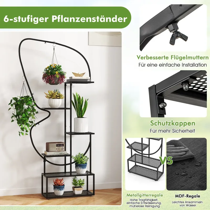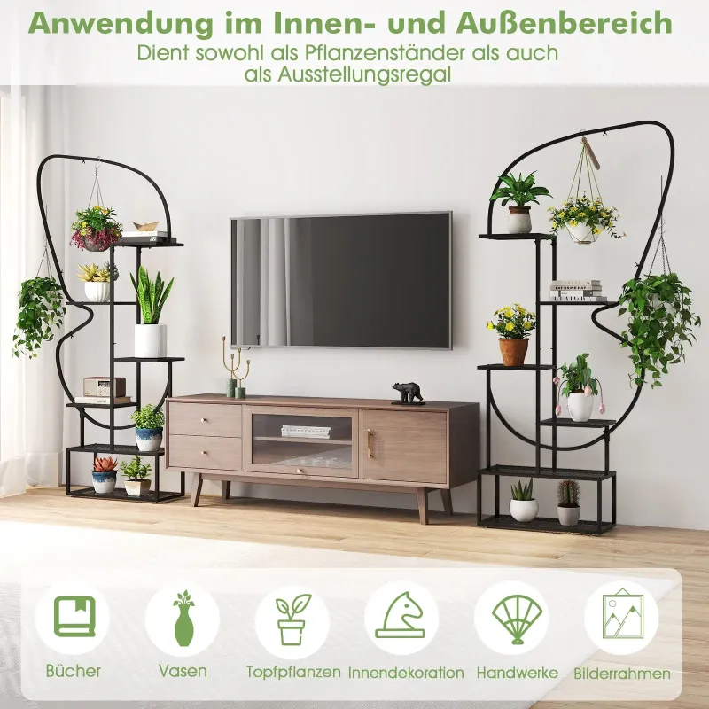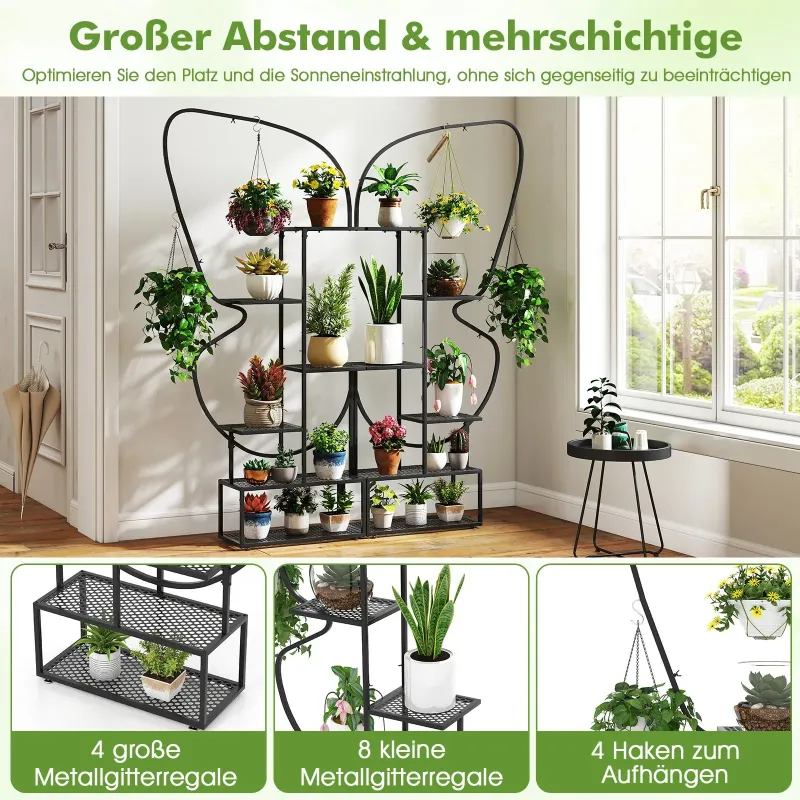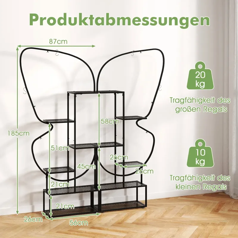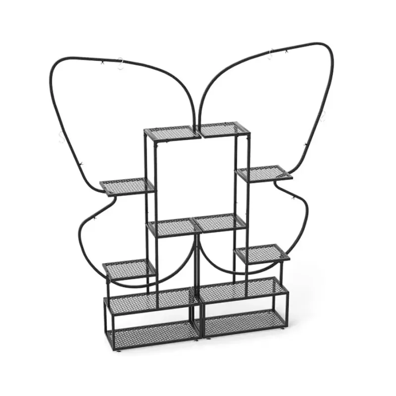 Vneste do svojej obývačky nádych jari! Naša 6-poschodová sada kovových políc na rastliny obsahuje dva stojany, každý s rozmermi 56 x 26 x 185 cm (D x Š x V), ktoré sa dajú použiť ako dve samostatné jednotky alebo ako jeden harmonický kus v jedinečnom tvare motýľa, vďaka čomu sú pútavým prvkom v každej miestnosti. Každá zo 6 úrovní je optimálne rozmiestnená, aby poskytovala dostatok slnečného svetla a podporovala zdravý rast rastlín na veľkých aj malých policiach. Vlastnosti: Široké rozstupy a viacvrstvová konštrukcia: Táto 6-poschodová polica na rastliny obsahuje 4 veľké kovové sieťované police, 8 malých kovových sieťovaných políc a 4 závesné háky, ktoré poskytujú dostatok priestoru na vystavenie kvetináčov a zavesných kvetinových košov. Okrem toho šikovne usporiadané police optimalizujú priestor a slnečné svetlo bez toho, aby si navzájom prekážali. Pevná a spoľahlivá konštrukcia: Vysoká polica na rastliny je vyrobená z pevného kovového rámu, ktorý poskytuje silnú oporu a je odolný. Je tiež vybavená nastaviteľnými nožičkami pre vyrovnanie nerovného povrchu a ochranou proti prevráteniu na upevnenie police k stene. Kreatívny tvar motýľa: Sada obsahuje dva zakrivené stojany na rastliny, ktoré sa dajú skombinovať a vytvoriť tak elegantný tvar motýľa, ktorý dodá vášmu obytnému priestoru nádych romantiky a hravosti. Tieto dva stojany sa dajú použiť spoločne ako očarujúci stredobod alebo samostatne na individuálne vystavenie. Premyslené detaily: Na rozdiel od typických políc z MDF má tento stojan na rastliny kovové sieťované police s vysokou nosnosťou, jednoduchým odvodňovaním a bezproblémovým čistením. Vylepšené krídlové matice umožňujú rýchlu a jednoduchú montáž, zatiaľ čo ochranné krytky zaisťujú bezpečnosť. Všestranné použitie v interiéri aj exteriéri: Okrem vystavenia kvetináčov sú tieto rebríkové police na rastliny všestranné aj na vystavenie rôznych predmetov, ako sú knihy, bytové doplnky, umelecké diela alebo rámy na obrazy. Bezproblémovo sa hodia do obývačky, na balkón, verandu, do kancelárie alebo štúdia. Vlastnosti: 2 nezávislé police na rastliny sa dajú použiť samostatne alebo kombinovane. 12 políc v rôznych veľkostiach na vystavenie kvetináčov. 4 závesné háky sú vhodné na vystavenie závesných košov a dekorácií. Vysoká a nízka konštrukcia umožňuje rastlinám dostatočný príjem slnečného svetla. Zariadenia proti prevráteniu zabezpečujú, že polica na rastliny zostane bezpečne na svojom mieste. Nastaviteľné nožičky ju udržiavajú v rovnováhe na nerovnej podlahe. Kovové sieťované police pre jednoduché čistenie a vynikajúce odvodňovanie. Krídlové matice pre jednoduchú montáž a ochranné krytky pre zvýšenú bezpečnosť.