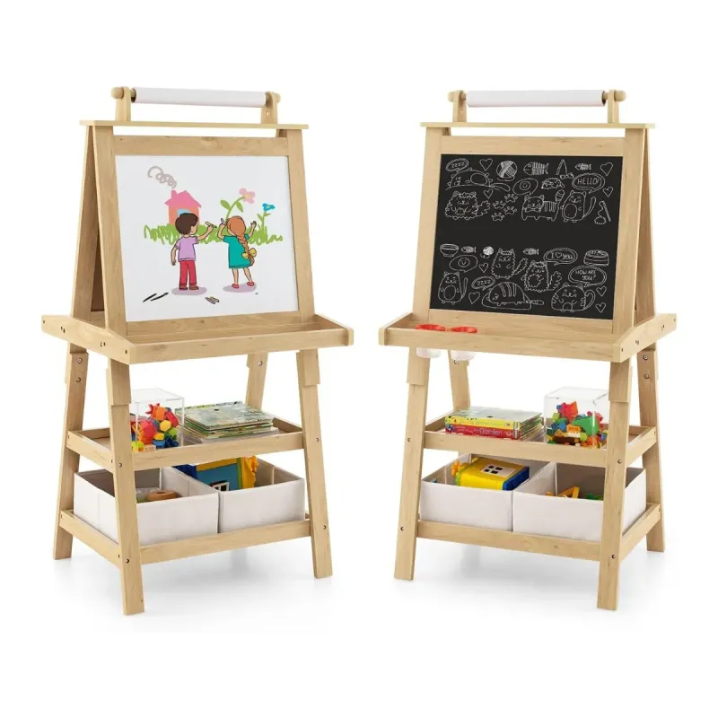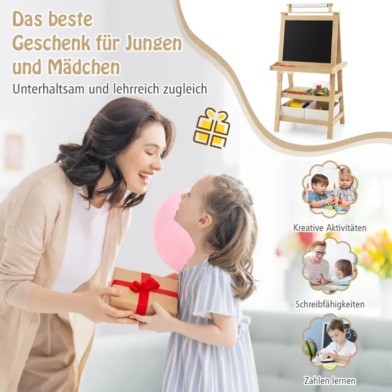 Náš stojan je dokonalým darčekom pre malé kresliarske talenty, aby popustili uzdu svojej kreativite! Malí umelci môžu maľovať so svojimi najlepšími kamarátmi na magnetickú tabuľu a tabuľu a prehlbovať tak svoje priateľstvo. Papierová rolka pripevnená v hornej časti tiež poskytuje dodatočnú plochu na kreslenie pre ďalšie umelecké diela. Dve odkladacie plochy, každá umiestnená pod tabuľou a tabuľou, ponúkajú dostatok miesta na príslušenstvo na maľovanie, ktoré je kedykoľvek rýchlo dostupné. Dve spodné policové úrovne ponúkajú ďalší úložný priestor a vďaka dvom úložným boxom dostatok miesta na usporiadanie umeleckých doplnkov. Stojan navyše zaisťuje vašim deťom vysokú bezpečnosť pri používaní vďaka použitiu pevných MDF dosiek a stabilnej trojuholníkovej konštrukcii. Dajte svojim deťom príležitosť objavovať a rozvíjať svoju kreativitu a predstavivosť s týmto stojanom. Vlastnosti: Stojan 3 v 1: Tento drevený stojan má kresliace plochy na oboch stranách a držiak na rolku papiera. Tabuľu je možné maľovať kriedou, zatiaľ čo vaše deti môžu na tabuľu používať vhodné perá bez toho, aby vytvárali prach. Papier môžete odvíjať aj z rolky smerom nadol a prichytiť dvoma magnetmi, aby ste naň mohli maľovať. Veľkorysý úložný priestor: Pod kresliacou plochou je na každej strane stojana polica, ktorá ponúka dostatok miesta na maliarske doplnky. Deti tak majú rýchly prístup k perám, pastelkám atď., aby mohli kedykoľvek vytvárať umelecké diela. Stojan má tiež dve úrovne políc, ktoré sú prístupné z oboch strán a pomôžu vášmu malému kresliarskemu talentu udržať všetky dôležité doplnky upratané a upratané na jednom mieste. Bezpečný materiál a stabilná štruktúra: Vďaka výrobe vysokokvalitných MDF dosiek je tento stojan ekologický a mimoriadne stabilný, čo vám zaisťuje dlhú životnosť. Starostlivo zaoblené rohy tiež chránia vaše dieťa pred náhodným zranením o ostré hrany. Trojuholníkový tvar, ktorý stojan zaujme po rozložení, mu dodáva vysokú úroveň stability a dobrú oporu. PERFEKTNÝ DARČEK PRE DETI: Tento vzdelávací stojan je ideálnym darčekom pre všetky deti staršie ako 3 roky. Pomáha deťom prehĺbiť ich záujem o umenie a kreslenie a podnecuje ich predstavivosť a kreativitu. Tento obojstranný stojan umožňuje deťom maľovať a hrať sa súčasne, čím sa rozvíja množstvo interakcií a nekonečná zábava. Veľa príslušenstva a jednoduché nastavenie: Tento obojstranný stojan obsahuje aj rolku papiera na kreslenie, ako aj dva magnety, 2 látkové úložné boxy na rôzne predmety a dve nepriepustné nádobky na farbu, ktoré možno rýchlo vyčistiť aj po použití olejových farieb. Okrem toho sa tento stojan dá ľahko a rýchlo zostaviť podľa návodu. Vlastnosti: Obojstranný stojan s tabuľou a tabuľou, pre 2 deti súčasne Stojan 3 v 1 s papierovou rolkou ako doplnkovou plochou na kreslenie Vyrobené z MDF dosiek, ktoré ponúkajú vysokú stabilitu a odolnosť Trojuholníková konštrukcia a pevné skrutky zaisťujú vynikajúcu stabilitu2 priestranné úrovne políc a 2 police ponúkajú dostatok priestoru pre príslušenstvo2 praktické, vyberateľné úložné boxy vyrobené z látkyMagnety na pripevnenie kresliaceho papiera k stojanu2 zabraňujú vytečeniu nádob na farbu Postriekanie farbami Zaoblené rohy starostlivo chránia pred zraneniamiVhodné pre deti od 3 rokovIdeálne na umelecké aktivity v triede, škôlke, herni atď.Umožňuje deťom objavovať a rozširovať ich predstavivosť a kreativitu Jednoduché zostavenie s podrobným návodom