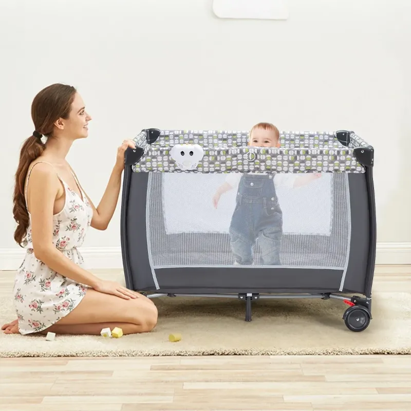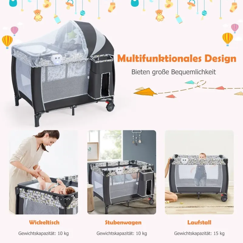 Táto prenosná detská postieľka ponúka pohodlné spanie a zároveň vytvára priestor na aktivity pre dieťa! Odnímateľná a nastaviteľná sieť s hrazdičkou s hračkami zaručuje útulný spánok a upúta pozornosť vášho dieťaťa, keď je bdelé. Funkcia hudby so svetlom poskytuje nekonečnú zábavu. Odnímateľná prebaľovacia stanica vám navyše ponúka skvelý komfort pri starostlivosti o dieťa. Pohodlný matrac možno vybrať a vytvoriť tak pre vaše dieťa priestor na hranie. Vďaka skladaciemu dizajnu s tlačidlom sa tento hrací kútik ľahko používa a skladuje. Vďaka prenosnej taške ho môžete aj ľahko prenášať. Táto detská postieľka je vybavená 2 uzamykateľnými kolieskami, vďaka ktorým sa dá pohodlne premiestňovať. Odnímateľná & nastaviteľná sieť: Na rozdiel od iných hracích zariadení je táto prenosná postieľka vybavená odnímateľnou a nastaviteľnou sieťou, ktorá nielen chráni vaše dieťa pred komármi, ale tiež zabraňuje priamemu slnečnému žiareniu. Pozornosť vášho dieťaťa upúta aj hrazdička s hračkami a hudobný prehrávač. Odnímateľná prebaľovacia stanica: Vďaka odnímateľnej prebaľovacej stanici sa môžete s touto prenosnou postieľkou pohodlne postarať o svoje sladké bábätko. Pohodlný matrac navyše ponúka komfortné ležanie. Možno ho tiež opäť vybrať, aby sa detská izba mohla premeniť na hrací kútik. Skladacie a prenosné detské ihrisko: Táto prémiová detská postieľka vybavená tlačidlom sa ľahko skladá a rozkladá, takže ju môžete ľahko používať a skladovať. Priložená prenosná taška vám tiež uľahčí prenášanie a cestovanie s postieľkou. Robustná konštrukcia: Táto prenosná postieľka na hranie, vyrobená z vysokokvalitnej tkaniny Oxford a železného rámu odolného proti hrdzi, má vysokú nosnosť a zaručuje dlhú životnosť, ktorá je vhodná pre deti do 3 rokov. Sieťované okná poskytujú lepšiu viditeľnosť a vetranie. Uzamykateľné kolieska s brzdami: Vďaka 2 uzamykateľným kolieskam s brzdami sa toto skladacie detské centrum ľahko prepravuje, takže ho môžete ľahko premiestniť na ľubovoľné miesto. Úložná taška je ideálna na uloženie potrebných vecí pre dieťa, aby ich malo vždy na dosah. Vlastnosti: Vhodné pre deti do 3 rokov Jednoduché uloženie vecí vďaka úložnej taške Sieťované okienko pre lepšiu viditeľnosť a vetranie Funkcia hračiek a hudby so svetlom pre nekonečnú zábavu Jednoduché premiestňovanie vďaka 2 uzamykateľným kolieskam a brzdám Jednoduchá starostlivosť o dieťa vďaka prebaľovacej stanici Skladacia konštrukcia s prenosnou taškou pre jednoduché používanie, skladovanie a prepravu Chráni vaše dieťa pred hmyzom vďaka odnímateľnej a nastaviteľnej sieťke Poskytuje útulné ležadlo a hraciu plochu s odnímateľným matracom