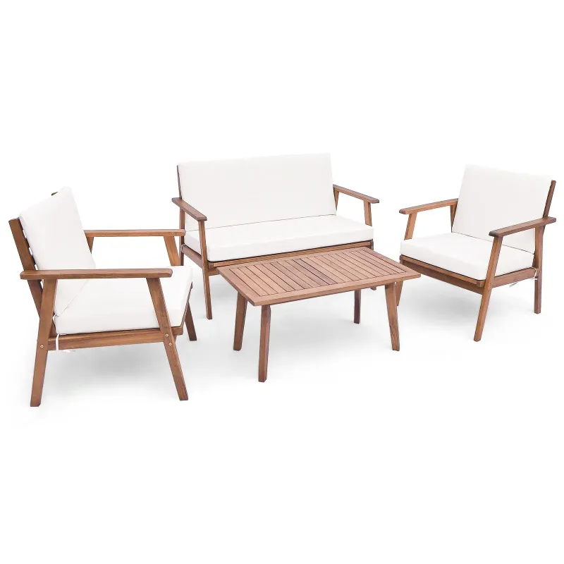 Zažite optimálne pohodlie s touto 4-dielnou súpravou terasového nábytku z agátového dreva. Sedacia súprava a jednotlivé pohovky sú vybavené sedacími a operadlovými vankúšmi s výplňou s vysokou hustotou pre príjemné a relaxačné posedenie. Hlavný rám súpravy nábytku je vyrobený z vysokopevnostného agátového dreva, ktoré ponúka stabilitu, odolnosť voči deformácii a prirodzenú eleganciu. Usporiadajte 4 kusy tak, aby sa hodili do požadovaného vonkajšieho priestoru, čím sa dokonale hodia do záhrady, k bazénu alebo na terasu. Atribúty: Vychutnajte si optimálne pohodlie: Sedacia súprava aj jednotlivé kreslá sú vybavené sedacími a operadlovými vankúšmi vyplnenými výplňami s vysokou hustotou pre väčšiu útulnosť. Upínacie popruhy udržia vankúše na mieste a praktické zipsy uľahčujú snímanie a starostlivosť o poťahy vankúšov. Robustný drevený rám: Hlavný rám 4 kusov je vyrobený z vybraného akáciového dreva, ktoré poskytuje silnú oporu a odolnosť. Drevený rám je nielen stabilný a odolný voči deformácii, ale aj bez otrepov a prírodný. Dobre navrhnuté sedadlá: K dispozícii sú aj ďalšie detaily, ktoré zvyšujú váš používateľský zážitok. Sedacie súpravy a jednotlivé kreslá majú naklonené operadlo a pohodlné podrúčky, aby ste sa cítili uvoľnenejšie. Vystužené priečne vzpery zvyšujú celkovú stabilitu. Usporiadajte si ich podľa svojich predstáv: Súprava obsahuje 1 loveseat, 2 samostatné kreslá a 1 konferenčný stolík. Súprava vám umožňuje ľubovoľne usporiadať jednotlivé časti tak, aby vyhovovali vašej zóne pohodlia. Vďaka prírodnému vzhľadu je súprava ideálna do záhrady, k bazénu, na verandu a na mnohé ďalšie miesta. Potrebná montáž: Jasný návod a kompletné príslušenstvo vám pomôžu efektívne dokončiť montáž. Pre predĺženie životnosti sa vyhnite dlhodobému vystaveniu dažďu. Rozmery sedacej súpravy: 123 x 69 x 81,5 cm. Rozmery každého kresla: 67 x 69 x 81,5 cm. Rozmery konferenčného stolíka: 90 x 50 x 43 cm. Vlastnosti: Vankúše s vysokou hustotou výplne pre optimálne pohodlie Pohodlné zipsy na jednoduchú údržbu poťahov vankúšov Silný a odolný rám z agátového dreva pre vysokú stabilitu Naklonené operadlo a pohodlné podrúčky poskytujú dodatočnú útulnosť Zosilnené priečne výstuhy pre zvýšenú stabilitu konštrukcie Voľné usporiadanie jednotlivých častí podľa vášho priestoru Ideálne na vonkajšie použitie, napr. v záhrade alebo pri bazéne Jednoduchá montáž s jasným návodom a kompletným príslušenstvom