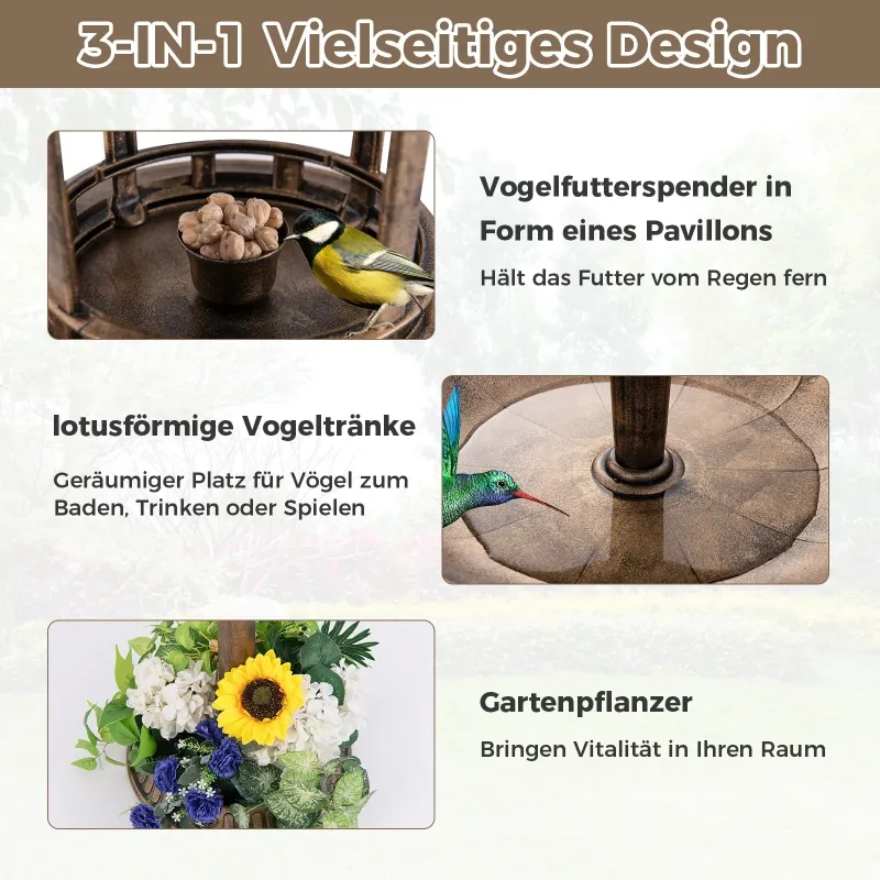Naša solárne napájaná vaňa pre vtáky vybavená LED lampou osvetlí váš vonkajší priestor a zároveň minimalizuje spotrebu energie. Tento všestranný vtáčí kúpeľ sa dodáva s dvoma nádržami, ktoré slúžia ako vtáčí kúpeľ aj ako kŕmidlo pre vašich operených návštevníkov. Na zvýšenie hmotnosti môžete pridať aj kamene alebo piesok. Vtáčie kŕmidlo je vyrobené z odolného PP materiálu a je konštruované tak, aby odolalo rôznym poveternostným podmienkam. Vďaka elegantnému vintage dizajnu toto voľne stojace kŕmidlo pre vtáky dokonale doplní vašu záhradu, terasu alebo dvor. atribúty: So solárnym osvetlením: Vintage vtáčie vane s LED lampou a vodotesným solárnym panelom. Po úplnom nabití solárneho panela počas dňa sa tieto svetlá automaticky zapnú a vytvoria vo vašej záhrade čarovnú atmosféru, ktorá priláka vtáky. všestranný dizajn: Ľahké vtáčie kúpele vybavené kŕmidlom v tvare pavilónu zabezpečujú, že krmivo pre vtáky zostane suché a dostupné. Priestranná misa s oválnymi otvormi slúži ako vtáčia vaňa a pozýva operených priateľov na odpočinok a kúpanie, čím vytvára príjemné prostredie pre ich potešenie. funkčný kvetináč s podstavcom: Veľký kvetináč so 4 odtokovými otvormi umožňuje rozkvitnúť vašim obľúbeným kvetom. Okrem toho možno kvetináč zaťažiť pridaním kameňov, zeminy alebo piesku na zvýšenie stability. K dispozícii sú aj 3 zemné hroty na pevné ukotvenie vintage záhradného kvetináča v zemi. odolný & materiál odolný voči poveternostným vplyvom: Kombinácia kvetináča a zavlažovacieho zariadenia je vyrobená z vysokokvalitného PP materiálu a ľahko sa premiestňuje. Zvolený materiál je zároveň vodoodolný, mrazuvzdorný a odolný voči slnečnému žiareniu, čo zaručuje dlhodobé používanie v exteriéri. rustikálny štýl &; jednoduchá montáž: Voľne stojaci vonkajší vtáčí kúpeľ, navrhnutý s nádherným kvetinovým vzorom a retro bronzovou povrchovou úpravou, dodá vašej záhrade, terase alebo dvoru nádych elegancie. Vďaka jednoduchej konštrukcii je montáž stojaceho vane pre vtáky jednoduchá a nevyžaduje žiadne náradie.Vlastnosti:Solárne napájané svetlo dokáže vyžarovať teplú bielu žiaru pre príjemnú atmosféruSolárny panel dokáže po úplnom nabití fungovať 8 hodínMateriál odolný voči poveternostným vplyvom je mrazuvzdorný, vodotesný a odolný voči slnečnému žiareniuMôžete pridať piesok alebo kamene, na pridanie dodatočnej váhy do základne3 zemné hroty pevne ukotvia vtáčiu vaňu v zemiKrepina s drenážnymi otvormi zabraňuje zamokreniuVintage vzor a povrchová úprava zatraktívňujú vtáčiu vaňuRustikálna dekorácia pre vonkajšie priestory, ako sú záhrady, balkóny alebo terasy