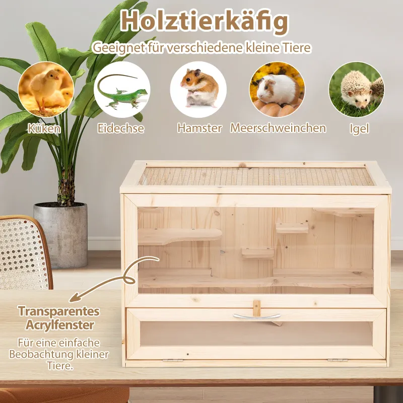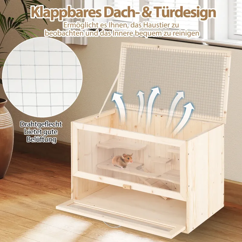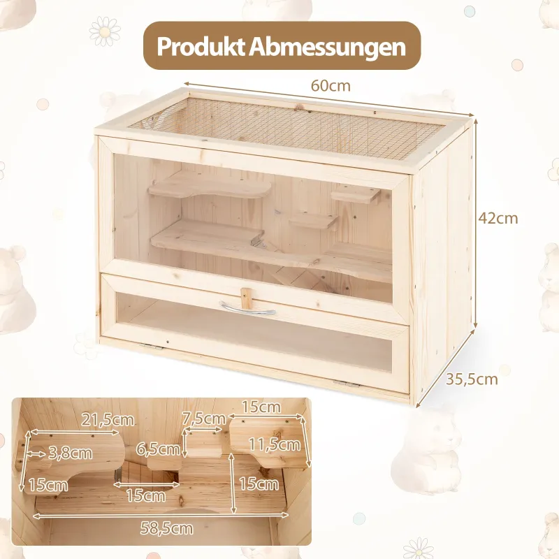 Táto klietka pre škrečky má praktickú výklopnú strechu s pevným pásikom pre jednoduché pozorovanie a kŕmenie vašich domácich miláčikov. Drôtené pletivo na hornom paneli zaisťuje vynikajúce vetranie a zabraňuje úteku škrečkov. Uzamykateľné dvierka umožňujú bezproblémové čistenie interiéru. Klietka poskytuje priestranný biotop pre rôzne malé zvieratá, ako sú škrečky, morčatá, ježkovia, kuriatka a leguány. Odolný, priehľadný akrylový panel poskytuje jasný výhľad na vašich domácich miláčikov. Je tiež vybavená niekoľkými rebríkmi na aktivity, vrátane horného bidla, dvoch skákacích plošín, kŕmnej plochy, oddychovej plochy a rebríka, čo umožňuje škrečkom ľahko liezť a objavovať okolie. Preto je táto drevená klietka ideálna pre malé zvieratá, ako sú škrečky, morčatá, leguány a ježkovia. Vlastnosti: Dizajn s výklopnou strechou a dvierkami: Táto klietka pre škrečky má praktickú výklopnú strechu s pevným pásikom, čo vám umožňuje ľahko pozorovať a kŕmiť vašich domácich miláčikov. Drôtené pletivo na hornom paneli zaisťuje vynikajúce vetranie a zabraňuje úteku škrečkov. Uzamykateľné dvierka sa navyše bez námahy otvárajú, čo vám umožňuje ľahko čistiť interiér. Vhodné pre rôzne zvieratá: S vnútornými rozmermi 56 cm x 31,5 cm x 39 cm (D x Š x V) poskytuje táto drevená klietka priestranný biotop pre rôzne malé zvieratá, ako sú škrečky, morčatá, ježkovia, kuriatka a leguány. Odolný, priehľadný akrylový panel poskytuje jasný výhľad pre jednoduché pozorovanie vašich domácich miláčikov. Viacúčelové aktivity s rebríkmi: Kŕmna klietka pre malé zvieratá je vybavená niekoľkými aktivitnými oblasťami s rebríkmi, vrátane horného bidla, dvoch skákacích plošín, kŕmnej plochy, oddychovej plochy a praktického rebríka. Tieto rozdelené oblasti umožňujú vašim škrečkom ľahko liezť a objavovať svet, čím im poskytujú širokú hraciu plochu. Robustný a stabilný rám: Táto klietka pre domáce zvieratá je vyrobená z prírodného borovicového dreva, je odolná voči deformáciám a spoľahlivá, vhodná na dlhodobé používanie. Okrem toho robustné kovové pánty dodávajú celému rámu dodatočnú stabilitu. Jednoduché skladovanie a montáž: Celkové rozmery tohto ihriska pre škrečky sú 60 cm x 35,5 cm x 42 cm (D x Š x V), vďaka čomu je vhodná do malých priestorov alebo bytov. Navyše, vďaka podrobnému návodu môžete toto ihrisko pre škrečky jednoducho zostaviť. Vlastnosti: Výklopné veko s kovovou sieťovinou pre dobré vetranie a jednoduché pozorovanie. Viacúrovňové akrylové panely poskytujú priestranné obytné priestory pre malé zvieratá. Súčasťou je praktický rebrík a polica, po ktorých môže váš domáci miláčik liezť a odpočívať. Vyrobené zo spoľahlivého dreva a akrylových materiálov pre dlhotrvajúce používanie. Spodný úložný priestor poskytuje ďalší priestor na úhľadné uloženie potrieb pre domáce zvieratá. Vhodné pre rôzne malé zvieratá, ako sú škrečky, morčatá a myši. Kompaktný dizajn šetrí miesto a zároveň poskytuje pohodlný obytný priestor. Akrylové dvierka sa ľahko otvárajú pre rýchly prístup do vnútra klietky. Prírodná drevená konštrukcia je stabilná a bezpečná pre život a hranie vašich domácich miláčikov. Vyžaduje sa montáž.