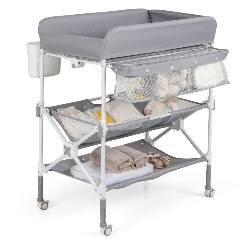 Užite si pohodlné prebaľovanie s naším skladacím prebaľovacím stolom. Organizér ponúka dostatok úložného priestoru s 3-priehradkovým košom, 2 policami a odpadkovým košom pre jednoduchý prístup k nevyhnutným veciam pre bábätko. Pevný kovový rám, základňa a ochranné panely zaisťujú bezpečnosť vášho dieťaťa. Ľahko sa skladá pre úsporu miesta pri skladovaní a cestovaní. Ľahko čistiteľný, vodeodolný povrch a umývateľný poťah uľahčujú čistenie.