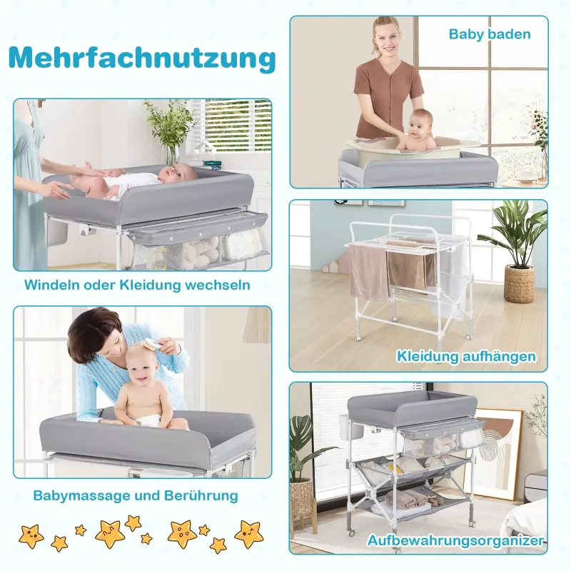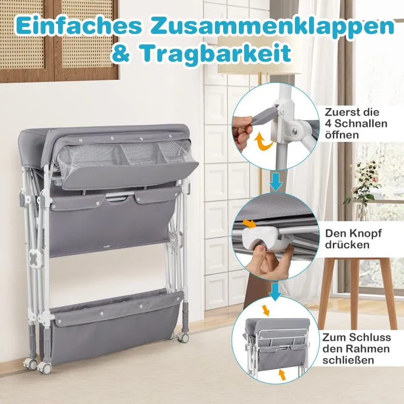 Multifunkčný dizajn: Tento detský kútik je vhodný na prebaľovanie alebo prebaľovanie, maznanie a masáže bábätka, kúpanie alebo vešanie oblečenia a slúži aj ako úložný organizér. Pevná konštrukcia a jednoduché skladanie: Robustný kovový rám, integrovaný prepravný pult a 4-stranné ochranné panely zaisťujú bezpečnosť bábätka. Organizér sa dá kompaktne zložiť bez použitia náradia, čím sa šetrí miesto alebo sa ľahko prenáša.