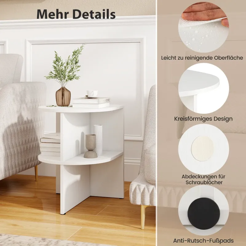 JV12639WH-1Tento polkruhový príručný stolík je praktickým a elegantným riešením úložného priestoru, ktoré neplytvá miestom. S kompaktnými rozmermi 38 x 38 x 48,5 cm je ideálny do stiesnených priestorov a ponúka 2 police na pohodlné uloženie. Jeho elegantný polkruhový dizajn umožňuje nielen flexibilnú kombináciu s väčším konferenčným stolíkom, ale hodí sa aj k rôznym interiérovým dekoráciám. Ďalšie premyslené detaily, ako napríklad ľahko čistiteľný povrch a kryty otvorov na skrutky, dodávajú stolíku štýl a pohodlie. Okrem toho protišmykové podložky pod nohy zabezpečujú stabilitu pre váš pokoj.JV12639WH-2Tieto malé polkruhové bočné stolíky sú praktickým a elegantným riešením na odkladanie, ktoré neplytvá miestom. Oba stolíky s kompaktnými rozmermi 38 x 38 x 48,5 cm, ktoré sú ideálne do stiesnených priestorov, ponúkajú 2 police na pohodlné ukladanie. Ich elegantný polkruhový dizajn umožňuje nielen flexibilnú kombináciu s väčším konferenčným stolíkom, ale hodí sa aj k rôznym interiérovým dekoráciám. Premyslené detaily, ako napríklad ľahko čistiteľný povrch a kryty otvorov na skrutky, zvyšujú štýl a pohodlie. Navyše protišmykové podložky pod nohy zabezpečujú stabilitu pre váš pokoj. atribúty:Praktický úložný priestor: tento polkruhový bočný stolík má priestrannú stolovú dosku a 2 otvorené police, ktoré poskytujú dokonalé miesto na knihy, rastliny v kvetináčoch, ozdoby a rámy na obrazy, čo umožňuje organizované ukladanie.Flexibilné kombinácie: Vďaka polkruhovému tvaru možno tento príručný stolík flexibilne rozmiestniť. Odporúčame používať každý kus ako samostatný bočný stolík alebo skombinovať 2 stolíky do jedného stolíka, ktorý je ideálny na umiestnenie pred pohovku. užívateľsky prívetivý dizajn: Tento polmesiacový bočný stolík, navrhnutý s ohľadom na vaše pohodlie, má ľahko čistiteľný povrch na nenáročnú údržbu vrátane krytov otvorov na skrutky pre lepší vzhľad a protišmykových podložiek pod nohy na zaistenie bezpečnosti. estetický vzhľad: Tento nočný stolík má inovatívny okrúhly dizajn, ktorý je jednoduchý a zároveň elegantný, takže je nádherným akcentom v každej miestnosti. Doplní rôzne štýly interiéru a zvýrazní jeho celkovú estetiku: Praktický úložný priestor: každý polkruhový stolík má priestrannú dosku a 2 otvorené police, ktoré poskytujú dokonalé miesto na knihy, rastliny v kvetináčoch, ozdoby a rámy na obrazy a umožňujú organizované ukladanie: Vďaka polkruhovým tvarom sa dajú tieto stolíky flexibilne rozmiestniť. Odporúčame používať každý kus ako samostatný príručný stolík alebo skombinovať 2 stolíky do jedného konferenčného stolíka, ktorý je ideálny na umiestnenie pred pohovku. užívateľsky prívetivý dizajn: Tieto príručné stolíky sú navrhnuté s ohľadom na vaše pohodlie, majú ľahko čistiteľný povrch na nenáročnú údržbu, obsahujú kryty otvorov na skrutky pre lepší vzhľad a protišmykové podložky pod nohy na zaistenie bezpečnosti. estetický vzhľad: Tieto nočné stolíky majú inovatívny kruhový dizajn, ktorý je jednoduchý a zároveň elegantný, vďaka čomu sa stanú nádherným doplnkom každej miestnosti. Dopĺňajú rôzne štýly interiéru a zvyšujú celkovú estetiku: Tieto polkruhové úložné police s kompaktnými rozmermi 38 x 38 x 48,5 cm pre malé priestory sa pohodlne zmestia do stiesnených priestorov obývačky, spálne alebo kancelárie ako praktické úložné riešenia.Vlastnosti:Veľká stolová doska a 2 otvorené police na pohodlné ukladanieMožno použiť ako samostatný stolík alebo skombinovať do konferenčného stolíkaĽahko sa čistí vďaka hladkému povrchuKryty otvorov na skrutky na zvýšenie estetikyZlepšená stabilita s protišmykovými podložkami na nohyPrehľadný, okrúhly dizajn dodáva nádych elegancieVhodný do obývačky, spálne a kancelárieVyžaduje sa montáž