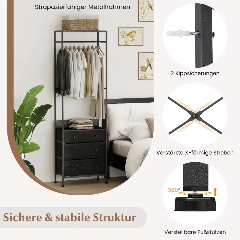 Voľne stojaci vešiak na oblečenie má závesnú tyč, ktorú možno namontovať do troch polôh podľa vašich rôznych potrieb. Celkovo sú tu 3 odnímateľné textilné zásuvky so sklopnou konštrukciou a jedna z nich je vybavená 1 deliacou súpravou na triedenie. Zatiaľ čo horná a stredná polica poskytujú ďalší úložný priestor. Robustný kovový rám so zosilnenými vzperami v tvare X zároveň zaisťuje celkovú stabilitu. Zariadenia proti nakloneniu a nastaviteľné podložky pod nohy stabilizujú stojan. V každom prípade je tento stojan na kabáty priestorovo úsporným prvkom vo vašej domácnosti, ktorý je vhodný do predsiení, spální, šatní atď. atribúty: Veľkorysý úložný priestor: Tento stojan na kabáty pozostáva z hornej police, tyče na oblečenie, stredovej police a 3 sklopných zásuviek. Takto sú predmety dobre usporiadané a ľahko dostupné vrátane oblečenia, tašiek, topánok, úložných boxov, drobností atď. bezpečný & stabilná konštrukcia: Tento vešiak na oblečenie so zásuvkami má pevný kovový rám a stojí stabilne. Praktické vzpery v tvare písmena X zlepšujú celkovú stabilitu a nastaviteľné podložky pod nohy sa prispôsobia nerovnej podlahe. Vďaka 2 zariadeniam proti prevráteniu môžete voľne stojaci vešiak na šaty pripevniť k stene pre väčšiu bezpečnosť. detaily orientované na používateľa: Tyč na šaty tohto vysokého vešiaka na šaty možno podľa potreby pripevniť v troch polohách. Jedna zo zásuviek je vybavená aj deliacimi priečinkami, aby vyhovovala vašim rôznym potrebám. A vďaka praktickým gombíkom môžete zásuvky ľahko vysúvať. multifunkčný dizajn: Ako dokonalá kombinácia úložného vešiaka, šatníkovej skrine a komody sa tento vešiak na oblečenie dobre hodí do vášho vstupného priestoru, spálne, šatníka a ďalších priestorov. Industriálny vzhľad navyše dodá vášmu domovu nadčasový nádych a dobre sa kombinuje s ostatným nábytkom. jednoduchá inštalácia & úspora miesta: Voľne stojaci vešiak na šaty sa dodáva s kompletným príslušenstvom a jasnými pokynmi, ktoré zjednodušujú inštaláciu. A čo je ešte dôležitejšie, vysoká komoda s tyčou na šaty nezaberá príliš veľa miesta na podlahe, čím poskytuje ideálne riešenie úložného priestoru pre obmedzené obytné priestory. Vlastnosti: Vhodné na zavesenie na vešiak na šaty:Koľajnička na šaty s 3 polohami na zavesenie podľa vašich preferenciíHorná a stredná polica na ďalšie možnosti úložného priestoru3 vyberateľné zásuvky so súpravou 1 deliacej priehradky a gombíkov na pohodlné používanie2 držiaky proti prevráteniu na bezpečné pripevnenie k stenePevný kovový rám so zosilnenými výstuhami v tvare X na zabezpečenie stabilityNastaviteľné podložky pod nohy na prispôsobenie sa nerovným podlahámStylové tkané vzory dodávajú miestnosti nadčasový šmrncProstorovo úsporný a univerzálny dizajn pre obmedzené priestoryIdeálny doplnok do šatníka, spálne, predsiene a ďalších priestorov