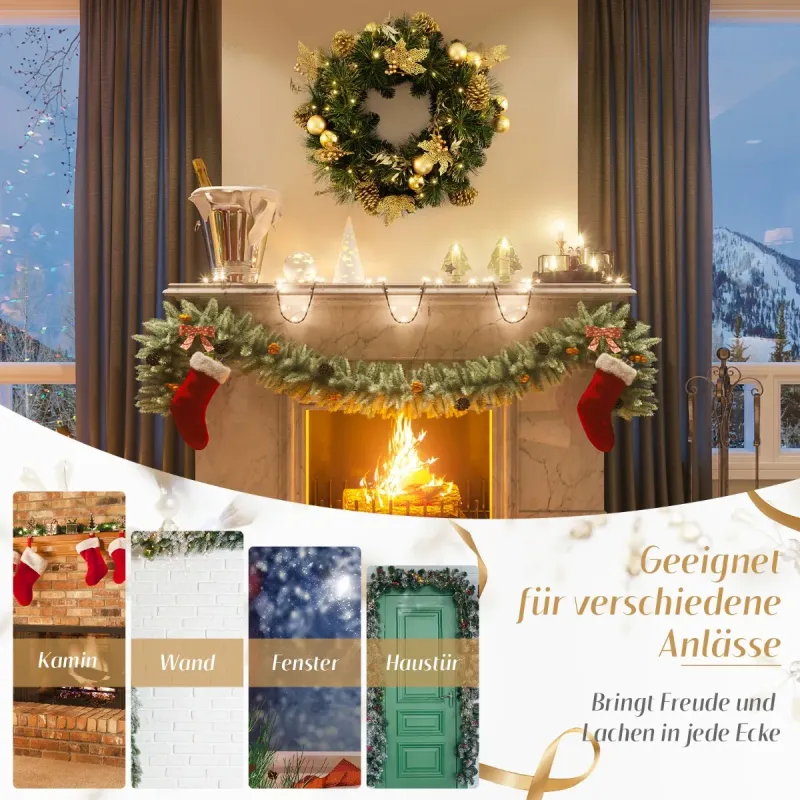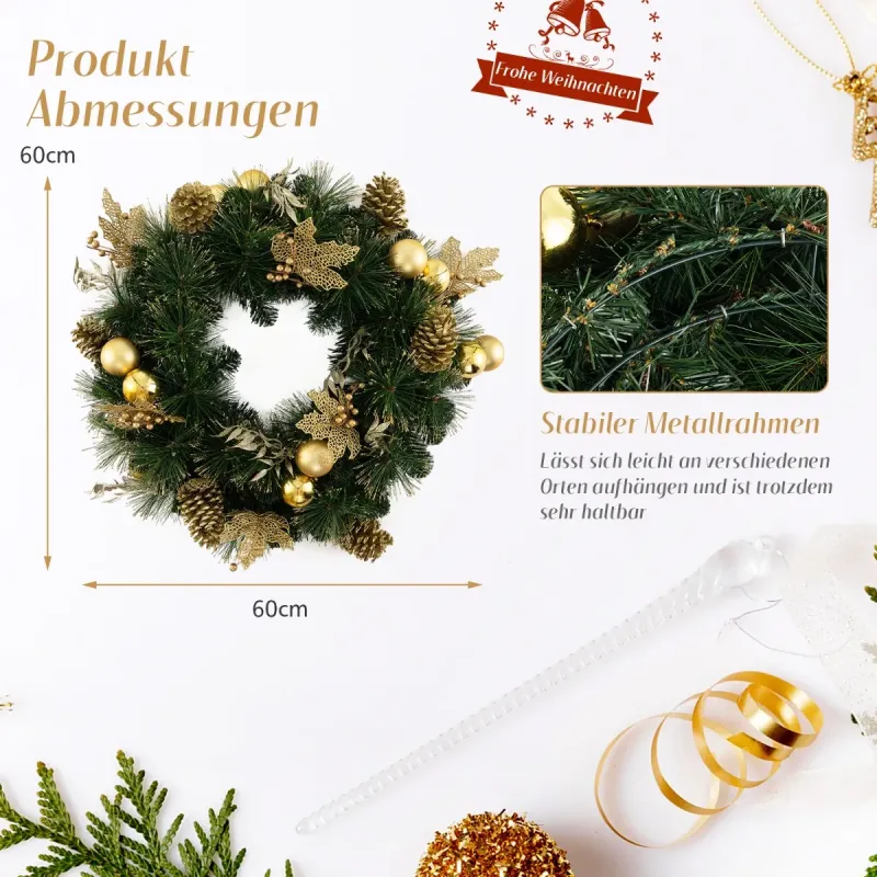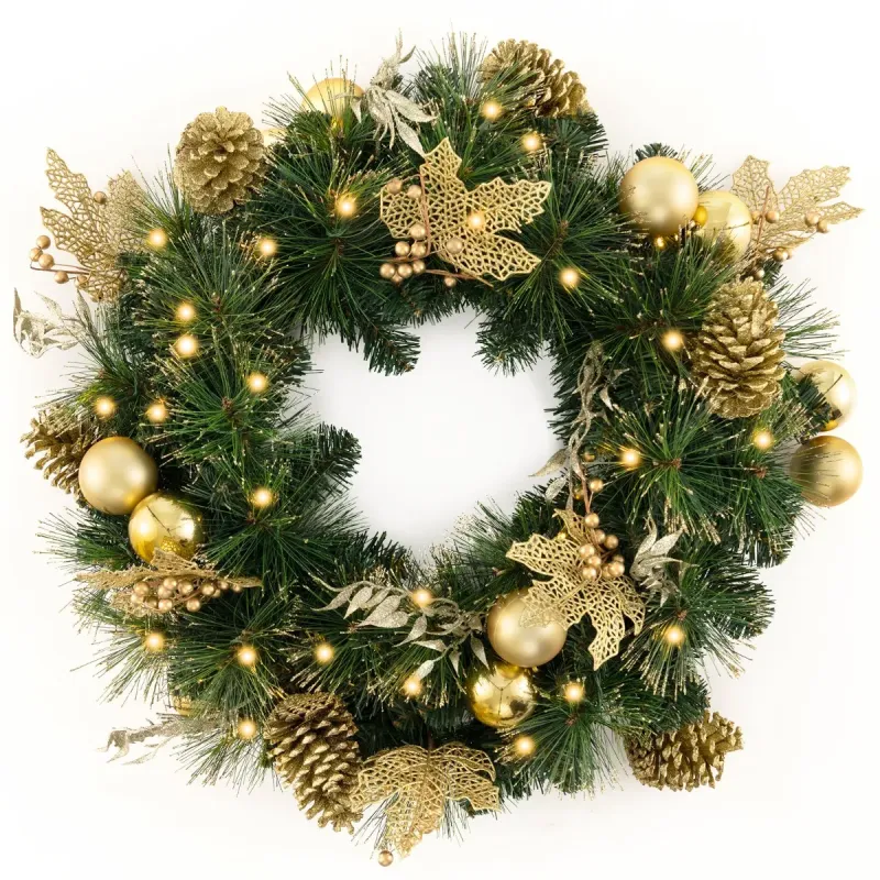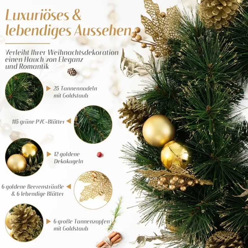 Dodajte svojmu domovu teplo a eleganciu s naším vianočným vencom! Tento 60 cm predsvietený umelý vianočný veniec s krásnymi a slávnostnými prvkami je navrhnutý tak, aby priniesol radosť a teplo Vianoc do vášho domova. Dodáva sa s 25 starostlivo vyrobenými vetvičkami z ihličia so zlatým práškom a 115 zelenými PVC listami, ktoré mu dodávajú trblietavý a očarujúci vzhľad. Tento veniec, ozdobený 12 zlatými dekoratívnymi guľami, 6 strapcami zlatých bobúľ, 6 farebnými listami a 6 veľkými šiškami so zlatým práškom, je skutočným pútačom pozornosti. Obsahuje tiež 35 jasných LED svetiel, ktoré vyžarujú útulnú žiaru a vytvárajú magickú atmosféru v každej miestnosti. Vďaka vstavanej funkcii časovača sa svetlo automaticky zapne na 6 hodín a vypne na 18 hodín. Bezpečnosť je našou najvyššou prioritou, a preto je tento vianočný veniec vyrobený z ohňovzdorného PVC materiálu. Či už chcete vylepšiť slávnostnú atmosféru vo svojom dome alebo vytvoriť príjemnú atmosféru v komerčných priestoroch, ako sú kancelárie alebo hotely, náš predsvietený vianočný veniec je ideálny do každého prostredia. Vlastnosti: Luxusný a žiarivý vzhľad: Umelý vianočný veniec má dva druhy listov: 25 ihličia so zlatým práškom a 115 zelených PVC listov. Je tiež ozdobený 12 zlatými dekoratívnymi guľôčkami, 6 strapcami zlatých bobúľ, 6 žiariacimi listami a 6 veľkými šiškami so zlatým práškom, čím vytvára skutočne úžasnú dekoráciu. Predsvietený dizajn a funkcia časovača: Predsvietený vianočný veniec je vybavený 35 teplými bielymi LED svetlami, ktoré vytvárajú útulnú a príjemnú atmosféru vo vašej domácnosti. Má tiež funkciu časovača (6 hodín zapnutia a 18 hodín vypnutia), ktorá šetrí energiu a eliminuje starosti s manuálnym zapínaním a vypínaním svetiel každý deň. Prevádzka na batérie: Svetlá sú napájané batériami a vyžadujú 3 AA batérie (nie sú súčasťou balenia). Bezdrôtový dizajn vám navyše poskytuje flexibilitu zavesiť ho kdekoľvek bez potreby elektrickej zásuvky. Ohňovzdorný a odolný materiál: Umelý vianočný stromček je vyrobený zo 100 % nového PVC materiálu, ktorý je ohňovzdorný, bez zápachu a nealergénny, čo zaisťuje bezpečnosť. Umelé listy sú tiež odolné voči praskaniu a vyblednutiu, čo zaručuje dlhodobé používanie. Všestranné použitie: Tento 60 cm predsvietený umelý vianočný veniec je vhodný na rôzne príležitosti a prinesie radosť a smiech do každého kúta vášho domova. Môžete ho zavesiť na krb, stenu, okno alebo vchodové dvere, čím dodá každej miestnosti nádych elegancie. Vlastnosti: Ihličie so zlatým práškom a PVC listy vytvárajú svieži a žiarivý vzhľad. Zdobené rôznymi ornamentmi dodajú vašej vianočnej dekorácii nádych elegancie a romantiky. Teplé biele LED svetlá vytvárajú v noci útulnú a príjemnú atmosféru. Vybavený 6-hodinovým časovačom, ktorý je energeticky úsporný a ľahko sa ovláda. Obsahuje puzdro na batérie, ktoré vyžaduje 3 x AA batérie (nie sú súčasťou balenia). Ponúka bezproblémovú inštaláciu bez potreby zásuviek alebo káblov. PVC listy a ihličie sú nehorľavé, bez zápachu, nealergénne a bezpečné. Pevný kovový rám poskytuje pohodlie pri zavesení na rôznych miestach a zároveň zaisťuje vynikajúcu odolnosť. Môže byť použitý v interiéri alebo exteriéri, napríklad doma, v kancelárii, na verande, vo výklade obchodu atď.