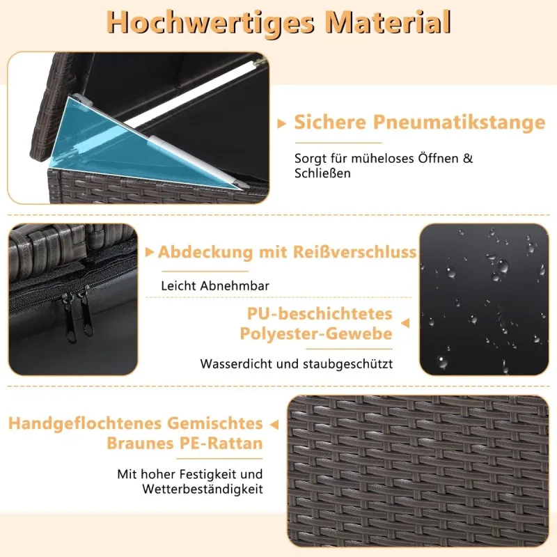 Tento 662 l palubný box vám ponúka ideálne miesto na uloženie vonkajších predmetov. Veľké vnútorné rozmery boxu umožňujú uložiť do neho viacero predmetov. A vodeodolná podšívka poskytuje cennú ochranu pre vaše veci. Okrem toho je palubný box super stabilný vďaka svojmu robustnému kovovému rámu. K väčšej stabilite prispieva aj PP doska veka. A energeticky úsporné pneumatické tyče na oboch stranách zaisťujú väčšiu bezpečnosť pri otváraní alebo zatváraní veka. Tento úložný box môžete navyše bez námahy presúvať, pretože je vybavený 2 univerzálnymi kolieskami. Celkovo vzaté, tento úložný box urobí váš relaxačný priestor uprataný a dobre organizovaný. Vlastnosti: Veľký úložný priestor: Tento veľkoformátový úložný box vám ponúka 662 l vnútorného priestoru na uloženie viacerých predmetov. Keď sa nepoužíva, môžete do boxu uložiť prikrývky, deky, vankúše, hračky, náradie atď. So zatvoreným vekom možno úložný box použiť aj ako konferenčný stolík na terase. Funkčná podšívka na zips: Obloženie úložného boxu je vyrobené z kvalitného polyesteru s PU potiahnutým povrchom, ktorý je odolný voči prachu a vode. Preto sú všetky vaše veci vo vnútri dobre chránené. Vysoká stabilita a odolnosť: Robustný kovový rám s PP doskou veka a prídavné stredové nožičky zaisťujú vysokú stabilitu. A pneumatická bezpečnostná tyč šetrí veľa energie a spomaľuje rýchlosť otvárania a zatvárania. Ručne tkaný mix hnedého PE ratanu zaisťuje aj dlhodobé vonkajšie použitie. 2 univerzálne kolieska: Vybavený 2 univerzálnymi kolieskami, box sa dá plynulo presúvať, čo vám ušetrí veľa námahy. Funkčný úložný priestor a jednoduchý pohyb robia z úložného boxu dokonalý doplnok na rôzne miesta, ako napríklad: Napr. pri bazéne, na verande, na dvore a podobne. Jednoduchá inštalácia: So všetkým potrebným príslušenstvom a jasnými pokynmi sa záhradný box ľahko montuje. Prosím, nedoťahujte všetky skrutky, kým nie sú všetky otvory zarovnané. A vyhnite sa vystaveniu dažďu pre dlhšiu životnosť. Celkové rozmery: 150 x 77 x 73 cm (D x Š x V). Vnútorné rozmery: 146 x 72 x 63 cm (D x Š x V) Vlastnosti: 662 L veľká kapacita ponúka dostatok miesta na uloženie predmetov Možno použiť aj ako terasový stolík so zatvoreným vekom Polyesterová podšívka potiahnutá PU chráni predmety vo vnútri pred prach a voda Vystužený kovový rám, prídavné stredové nožičky a PP platňa pre vysokú stabilitu Prémiová pneumatická tyč pre vysokú bezpečnosť Ručne tkaná zmes hnedého PE ratanu pre oveľa eleganciu a dlhšiu životnosť 2 univerzálne kolieska uľahčujú pohyb Vhodné na verandu, dvor, bazén, atď. Jednoduchá montáž s jasným návodom Vyhnite sa vystaveniu dažďu, aby ste predĺžili životnosť