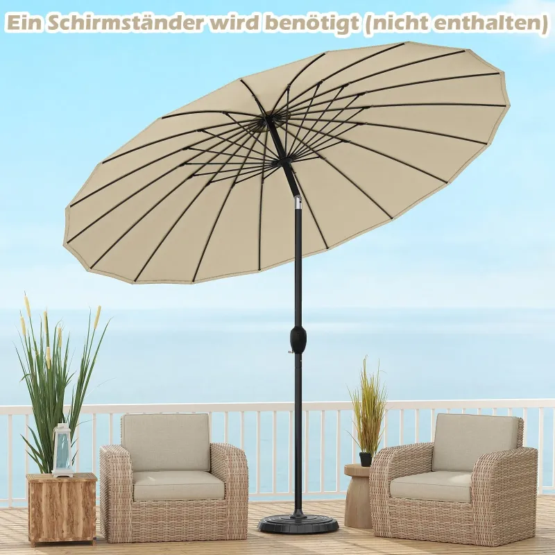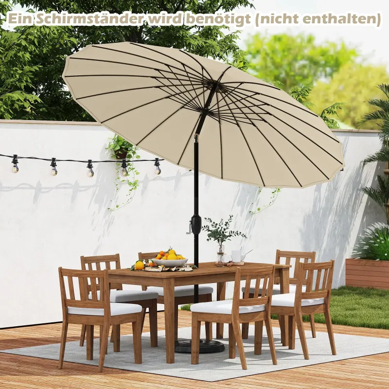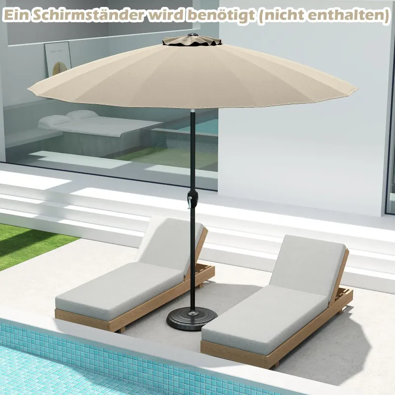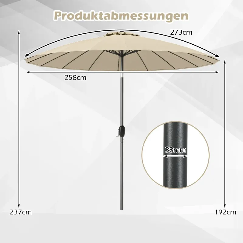 Nevyhnutný slnečník na terasu pre každého, kto miluje pobyt v prírode! Tento slnečník na terasu je vyrobený z polyesterovej tkaniny s PA povlakom, ktorá je nielen stálofarebná, ale aj vodeodolná a odolná voči slnku. Je vybavený 18 robustnými rebrami zo sklenených vlákien a poskytuje spoľahlivú oporu. Vetraná strecha podporuje cirkuláciu vzduchu, čo vám umožňuje vychutnať si čerstvý vánok a zároveň byť chránený pred slnkom. Slnečník je podopretý odolnou hliníkovou tyčou odolnou voči hrdzi. Je tiež vybavený systémom naklápania. Či už uprednostňujete úplný tieň alebo čiastočnú ochranu, slnečník je možné nastaviť podľa vašich predstáv. Kľuka tiež umožňuje rýchle otváranie a zatváranie. Vďaka dvom častiam tyče je možné okrúhly vonkajší slnečník rýchlo postaviť. Vlastnosti: Vysokokvalitná potiahnutá polyesterová strieška: Strieška slnečníka na terasu je vyrobená z svetlostálej a odolnej polyesterovej tkaniny, ktorá zaručuje dlhú životnosť. Povlak PA chráni materiál pred mrholením a slnečným žiarením, vďaka čomu je ideálny na vonkajšie použitie. Pevná a odolná konštrukcia: Slnečník s 18 rebrami zo sklenených vlákien a hliníkovou tyčou ponúka vynikajúcu odolnosť proti hrdzi a trvalú oporu. Vetraná strieška podporuje cirkuláciu vzduchu, poskytuje chladivý účinok a dodatočnú stabilitu. Používajte slnečník so závažím (nie je súčasťou balenia). Pohodlné nastavenie sklonu: Slnečník má systém naklápania s tlačidlom, ktorý umožňuje jednoduché naklonenie o 35°. To zaisťuje optimálny tieň počas celého dňa a umožňuje vám vychutnať si pohodlný pobyt vonku. Jednoduchá montáž a obsluha: Plážový slnečník je vybavený dvojdielnym tyčovým systémom so skrutkovou konštrukciou pre rýchlu montáž. Potom sa dá bez námahy otvoriť pomocou kľuky. Široké použitie: Okrúhly slnečník s rozmermi 258 x 258 cm ponúka veľkorysú ochranu pri stretnutiach alebo stolovaní vonku. Jeho klasický dizajn sa bez problémov začlení do rôznych vonkajších priestorov vrátane záhrad, bazénov, pláží a terás. Vlastnosti: Polyesterová tkanina potiahnutá PA je odolná voči vyblednutiu a slnku. 18 robustných rebier zo sklenených vlákien poskytuje zlepšenú stabilitu. Systém naklápania s tlačidlom umožňuje nastaviť plochu tieňa podľa potreby. Slnečník sa dá ľahko otvárať a zatvárať pomocou kľuky. Vetraný vrch podporuje cirkuláciu vzduchu a zabezpečuje dodatočné chladenie. Hliníková tyč odolná voči hrdzi pre dlhú životnosť. Tyče slnečníka sa dajú ľahko vybrať a uskladniť vďaka rýchloupínaciemu uzáveru. Vhodné do rôznych vonkajších priestorov, ako sú terasy, záhrady alebo bazény. Vyžaduje sa montáž.