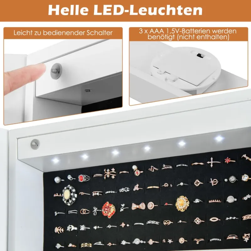 Usporiadajte si svoje šperky úhľadne s našou voľne stojacou skrinkou na šperky! Organizér na šperky so zrkadlom je vyrobený z výberového MDF a skla pre odolnosť a stabilitu. Môžete ho nastaviť do 4 rôznych uhlov podľa vašich potrieb. A stabilná základňa zaisťuje solídny výkon. Jasné LED svetlá navyše zaisťujú lepšiu viditeľnosť. Veľká kapacita zaisťuje, že vaše šperky zostanú na svojom mieste a vy ich rýchlo nájdete. Robustné kovové pánty a magnetický zámok dverí umožňujú plynulé otváranie dverí. Uzamykateľné prevedenie navyše ochráni vaše cenné šperky. Vlastnosti: 4-úrovňový nastaviteľný uhol sklonu: K dispozícii sú 4 nastavovacie otvory na nastavenie uhla sklonu. Voľne stojaca skrinka na šperky je preto dostupná v 4 uhloch sklonu, aby ste vždy našli správnu výšku. Je tiež vybavená zámkom a kľúčmi, aby vaše dieťa nepoškodilo vaše veci. Veľký úložný priestor: So 120 priehradkami na náušnice a dierkami, 1 taškou na zips, 12 háčikmi na náhrdelníky a náramky, 70 priehradkami na prstene, 1 držiakom na rúž, 6 ďalšími háčikmi, 4 odkladacími poličkami a 4 akrylovými zásuvkami vám táto zrkadlová šperkovnica môže uložiť šperky a kozmetiku usporiadaným spôsobom . Dizajn s dvojitým zrkadlom: Okrem vonkajšieho celoplošného zrkadla má voľne stojaca šperkovnica vo vnútri aj HD make-up zrkadlo. Vonkajšie zrkadlo je po celej dĺžke, takže sa pred ním môžete obliecť a skontrolovať svoj outfit. Vnútorné zrkadlo na líčenie vám pomôže, keď sa budete chcieť nalíčiť. LED osvetlená zrkadlová skrinka: Táto voľne stojaca zrkadlová skrinka na šperky je vybavená jasnými LED svetlami pre lepší zážitok z používania. Ľahko použiteľný spínač umožňuje zapnúť alebo vypnúť LED svetlá. Upozorňujeme, že sú potrebné 3 x AAA 1,5 V batérie (nie sú súčasťou balenia). Odolný a stabilný výkon: Táto LED osvetlená šperkovnica so zrkadlom je vyrobená z vysoko kvalitného MDF a vysoko kvalitného skla s vynikajúcim spracovaním a sľubuje dlhšiu životnosť. Robustná základňa navyše zaisťuje dostatočnú stabilitu pri používaní. Vlastnosti: Vysokokvalitná MDF a sklo pre dlhodobú spoločnosť Priestranný úložný priestor pre vaše rozmanité šperky 4-úrovňový nastaviteľný uhol sklonu pre lepší a rozumný výhľad Zrkadlo po celej dĺžke vám umožňuje skontrolovať váš stav Zrkadlo na líčenie vo vnútri vyhovuje vašim potrebám líčenia Uzamknite ho s 2 priloženými kľúčmi pre väčšiu bezpečnosť Ultra jasné LED svetlá pre jasný vizuálny zážitok Pevné kovové pánty a zarážka dverí pre hladké otváranie Pevná základňa pre vynikajúcu stabilitu Jasné pokyny pre jednoduchú inštaláciu Špecifikácie: Farba: Biela Materiál: MDF, sklo, plast, akryl Celkový rozmer: 41 x 36 x 158 cm (D x Š x V) Veľkosť vonkajšieho zrkadla: 120 x 37 cm (D x Š) Veľkosť vnútorného zrkadla: 33,5 x 30 cm (D x Š) Čistá hmotnosť: 15 kg Obsah balenia: 1 x voľne stojaca skrinka na šperky 2 x kľúče 1 x návod
