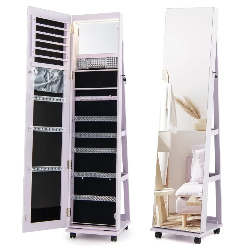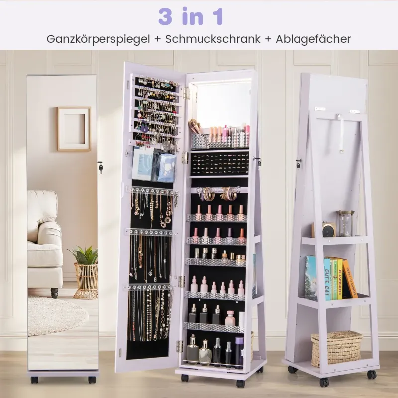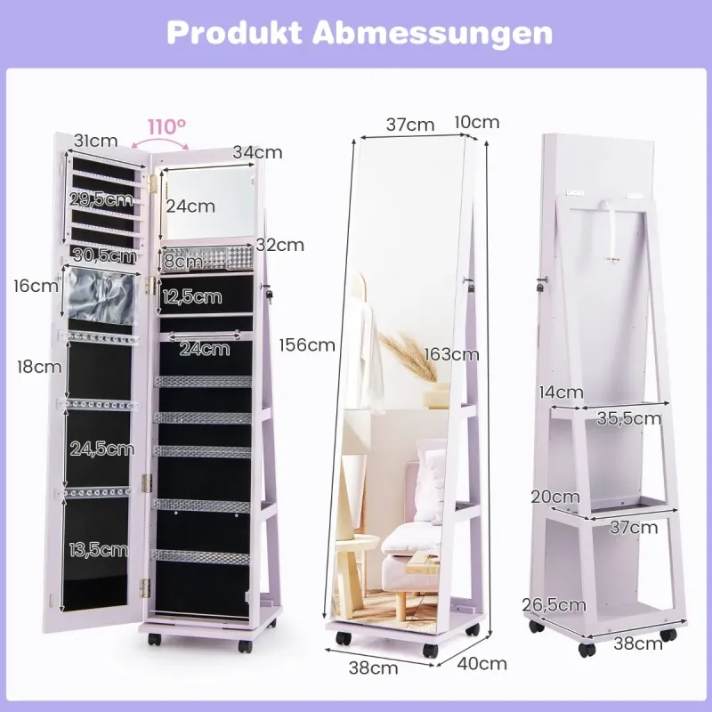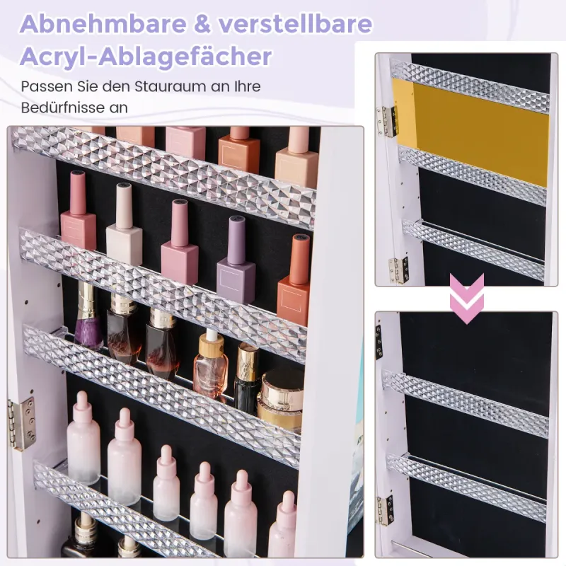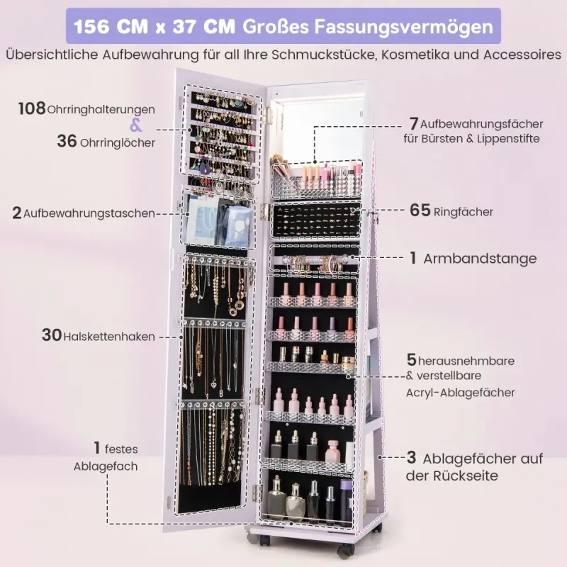 Udržujte svoju zbierku šperkov prehľadnú, organizovanú a krásne prezentovanú pomocou tejto štýlovej stojanovej skrinky na šperky.S viacerými priehradkami, háčikmi a policami poskytuje dostatok úložného priestoru pre všetky vaše náhrdelníky, náušnice, prstene a ďalšie šperky. Zrkadlo po celej dĺžke na vonkajšej strane vám umožní nielen skontrolovať si svoj outfit, ale zároveň dodá vašej miestnosti nádych elegancie. Táto skrinka na šperky je vyrobená z vysokokvalitných materiálov, je pevná a odolná. Rozlúčte sa so zamotanými náhrdelníkmi a nesprávne umiestnenými náušnicami - vneste do svojho každodenného života užitočný kus nábytku s touto funkčnou a elegantnou šperkovnicou. Vlastnosti: Priestorovo úsporný dizajn 3 v 1: Tento organizér kombinuje bezrámové zrkadlo po celej dĺžke, skrinku na šperky a odkladacie police, čo vám umožní maximalizovať efektívnosť využitia priestoru. Je vhodný do malých spální, šatníkov, bytov, ubytovní a pod. priestranný úložný priestor: Skrinka na šperky ponúka klasifikovaný úložný priestor na všetky vaše šperky, kozmetiku a doplnky vrátane 108 priehradiek na náušnice, 36 otvorov na cvočky, 2 vreciek, 30 háčikov na náhrdelníky, 7 priehradiek na štetce a rúže. 65 priehradiek na prstene, 1 tyč na náramky, 5 odnímateľných a nastaviteľných akrylových políc, 1 pevnú policu a 3 zadné police. zabudované zrkadlo s LED osvetlením: Malé vnútorné zrkadlo je vybavené jasným trojfarebným LED osvetlením (modré, biele + modré, žlté), ktoré dodá pohodlie vašej rannej rutine. A ovládanie jedným tlačidlom uľahčuje obsluhu. Poznámka: Na prevádzku sú potrebné 3 batérie AAA (nie sú súčasťou balenia): Akrylové odkladacie police možno nastaviť do rôznych výšok podľa výšky predmetu, takže môžete optimalizovať úložný priestor, kedykoľvek ho potrebujete. 4 univerzálne kolieska s brzdami zabezpečujú pohyb bez námahy a umožňujú ľahký prístup k policiam v zadnej časti. bezpečné uloženie a skvelá ochrana: Uzamykateľné dvierka s kľúčmi a magnetickými západkami zabraňujú neoprávnenému prístupu k vašej zbierke šperkov. Úložný priestor je vystlaný mäkkým zamatom, ktorý chráni vaše cenné šperky pred poškriabaním. Vlastnosti:Zrkadlo po celej dĺžke pre jasný výhľad od hlavy po pätyĽahko sa presúva vďaka 4 uzamykateľným univerzálnym kolieskamVeľký a klasifikovaný úložný priestor s háčikmi, štrbinami, policami, priehradkami a ďalšími prvkamiVybavený 3-farebným LED osvetlením a vnútorným kozmetickým zrkadlomVychádza v ústrety osobným potrebám vďaka nastaviteľným a odnímateľným akrylovým policiamPoskytuje bezpečné úložné riešenie s uzamykateľnými dvierkamiChráni vaše šperky pred poškriabaním vďaka mäkkej zamatovej podšívkeJednoduchá montáž s návodom krok za krokom