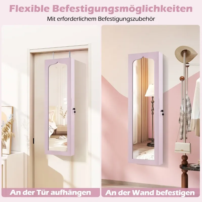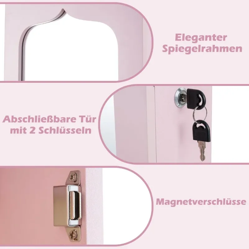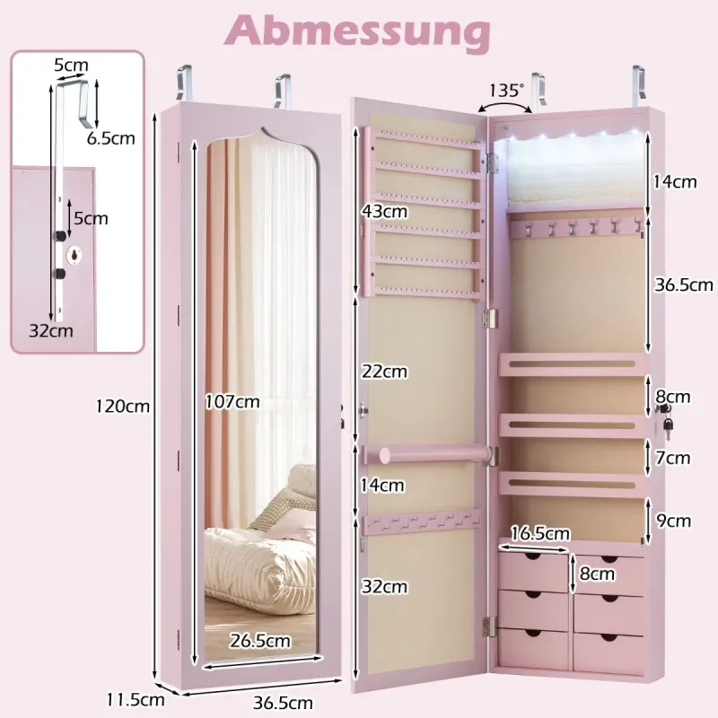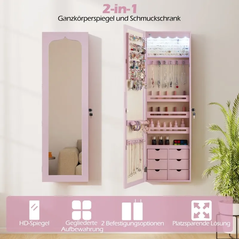 Táto elegantná šperkovnica je ideálnym darčekom pre vašich blízkych! Táto šperkovnica je vyrobená z vysokokvalitnej MDF a je mimoriadne pevná a odolná. Vďaka mnohým priehradkám a integrovanému zámku môžete všetky svoje obľúbené doplnky uložiť jednotlivo, bezpečne a prehľadne. Skrinku môžete zavesiť pomocou háčikov nad dverami alebo ju pripevniť na stenu pomocou skrutiek, čo tiež šetrí miesto. Okrem toho vám 5 automatických svetiel pomôže vybrať tie správne šperky, aby ste ich ľahšie našli aj v tme, alebo dynamicky nastaviť scénu svetlom. Zrkadlo po celej dĺžke poskytuje vynikajúci prehľad o vašom vzhľade a uľahčuje kombinovanie šperkov s oblečením. Atribúty: Zrkadielko je vhodné na nosenie, ale aj na nosenie, pretože sa v ňom dá nájsť veľa zaujímavých vecí: Vysoká kvalita a bezpečnosť: Táto skrinka na šperky je vyrobená z vysokokvalitných MDF dosiek s hladkým práškovým náterom a je odolná voči vlhkosti, opotrebovaniu a mimoriadne robustná. Mäkké vnútorné obloženie navyše chráni vaše šperky pred opotrebovaním a poškriabaním. Skrinka je vybavená aj zámkom dverí, ktorý v prípade potreby poskytuje dodatočnú bezpečnosť vašich šperkov. Dostatok úložného priestoru: Táto skrinka má tyč na šaty, 18 háčikov na náhrdelníky, 84 priehradiek na prstene, 4 otvorené priehradky, 6 drevených zásuviek, 120 priehradiek na náušnice, a tak poskytuje dostatok úložného priestoru pre všetky vaše šperky. Skrinka na šperky 4 v 1 so zrkadlom: Naša skrinka na šperky vám umožňuje využívať výhody skrinky na šperky aj toaletného zrkadla. Na jednej strane má praktickú úložnú funkciu, ale aj zabudované zrkadlo po celej dĺžke pre optimálny a jasný pohľad na kontrolu vášho oblečenia. 5 automatických LED svetiel: Táto šatníková skriňa je vybavená 5 LED svetlami (napájanými 3 batériami AAA, ktoré nie sú súčasťou balenia) a umožňuje vám ľahko nájsť šperky aj v tme a vybrať tie správne. Svetlá LED sa automaticky zapnú hneď po otvorení skrine. Priestorovo úsporný dizajn: Skriňu na šperky môžete zavesiť nad dvere pomocou priložených háčikov alebo ju pripevniť na stenu pomocou skrutiek, aby ste ušetrili miesto. Špeciálne funkcie: Šatníková skrinka je vybavená šatníkovou skrinkou, ktorá je súčasťou balenia: Vyrobené z odolného materiálu MDF pre dlhú životnosť. Veľký úložný priestor, dá sa usporiadať individuálne. 5 LED svetielok na uľahčenie hľadania správnych šperkov. Zrkadlo po celej dĺžke pre jasný obraz a na uľahčenie skúšania šperkov. Priestorovo úsporný dizajn vďaka montáži na stenu alebo dvere. Integrovaný zámok na bezpečné uloženie cenností. Všestranné použitie, napr. v spálni, obývačke alebo kúpeľni.