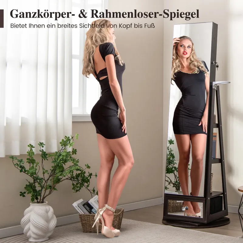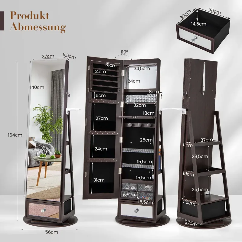 Už vás nebaví neustále sa snažiť mať svoje šperky usporiadané a ľahko dostupné? Táto uzamykateľná, otočná skrinka na šperky je dokonalým riešením! Táto neuveriteľná skrinka má celý rad funkcií, ktoré spĺňajú všetky vaše potreby na uskladnenie šperkov. Nachádza sa v nej 6 radov stojanov na náušnice, 3 rady háčikov na náhrdelníky a 5 radov priehradiek na prstene s 1 výklopnou policou. Okrem toho získate stojan na sušič vlasov, akrylový box na rúž, 3 tyče na náramky, 2 odnímateľné akrylové poličky, 4 akrylové zásuvky a 1 sklopnú zásuvku z netkanej textílie v spodnej časti. Akoby to nestačilo, v zadnej časti sú ďalšie 3 poličky, ktoré poskytujú ešte viac priestoru na vaše doplnky. Na vonkajšej strane šperkovnice sa nachádza zrkadlo v celej dĺžke a na vnútornej strane malé toaletné zrkadlo. Integrované LED svetlá navyše poskytujú dokonalé osvetlenie na nájdenie vašich obľúbených kúskov. Vlastnosti: Dokonalé uloženie šperkov: Táto šperkovnica vybavená 108 priehradkami na náušnice, 36 otvormi na náušnice, 36 háčikmi na náhrdelníky, 1 akrylovou kozmetickou škatuľkou a škatuľkou na rúž, 65 priehradkami na prstene, 3 tyčami na náramky, 2 vyberateľnými akrylovými priehradkami, 1 pevnou priehradkou a 4 akrylovými zásuvkami ponúka možnosť dobre si usporiadať všetky vaše poklady.Viac než len skrinka na šperky: voľne stojaca skrinka na make-up má zrkadlo s rozmermi 140 x 37 cm po celej dĺžke, ktoré vám poskytne široké zorné pole od hlavy až po päty. Mimochodom, skrinka na šperky s tromi ďalšími policami v zadnej časti sa dá použiť aj ako úložný regál alebo výstavný stojan. zabudované zrkadlo a LED osvetlenie: V stojane na šperky je malé toaletné zrkadlo. Spolu s jasným LED osvetlením vám umožní pohodlne sa nalíčiť. Svetlá sú napájané 3 x AAA batériami (nie sú súčasťou balenia). Okrem toho možno akrylovú poličku na make-up sklopiť, aby ste si mohli uložiť kozmetiku počas líčenia. 360° otočná & bezpečnostný zámok: Vďaka flexibilnej 360° otočnej konštrukcii môžete ľahko vyberať predmety uložené v zadnej časti šperkovnice. Okrem toho má šperkovnica uzamykateľné dvierka s kľúčmi, aby boli vaše veci v bezpečí, zatiaľ čo magnetický zámok zabraňuje nechcenému otvoreniu dvierok. zvýšené pohodlie &; elegantný dizajn: Táto zrkadlová skrinka je vybavená stojanom na sušič vlasov, aby ste mohli pri obliekaní pohodlne umiestniť sušič vlasov a mať k nemu prístup. Zamatové vrecká na náhrdelníky zabraňujú poškriabaniu a zamotaniu náhrdelníkov. Okrem toho veľká výklopná látková zásuvka v spodnej časti s predným akrylovým zrkadlovým panelom poskytuje extra módny akcent. Vlastnosti: Dizajn 4 v 1: Zrkadlo po celej dĺžke + skrinka na šperky + toaletný stolík + odkladacie poličkyViacero odkladacích priehradiek zabezpečí, že vaše šperky zostanú dobre usporiadanéZrkadlo po celej dĺžke poskytuje pohľad od hlavy po päty na kontrolu vášho oblečeniaAkrylové dvierka sa dajú sklopiť, Akrylové dvierka sa dajú sklopiť a slúžia ako odkladací stolík na make-upMalé vnútorné zrkadlo zabezpečuje pohodlné nanášanie make-upuSúčasťou je držiak na fén a veľká výklopná zásuvkaZamykateľná konštrukcia s 2 kľúčmi chráni vaše veci3 zamatové vrecúška chránia dlhé náhrdelníky pred poškriabanímIntegrované LED osvetlenie s praktickým ovládaním jedným tlačidlomVybavené kozmetickým štetcom a boxom na rúž360° voľné otáčanie bez mŕtvych uhlov